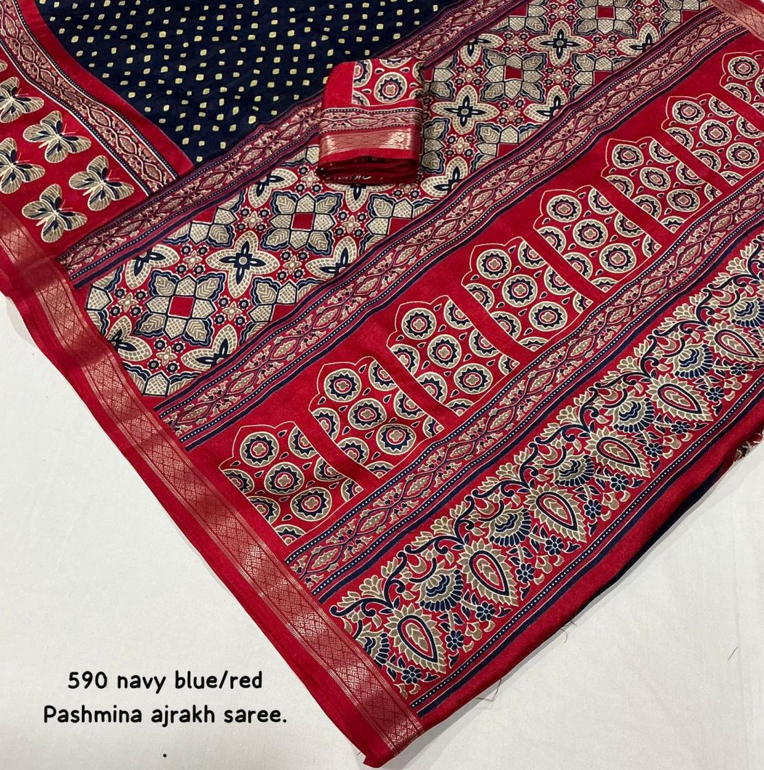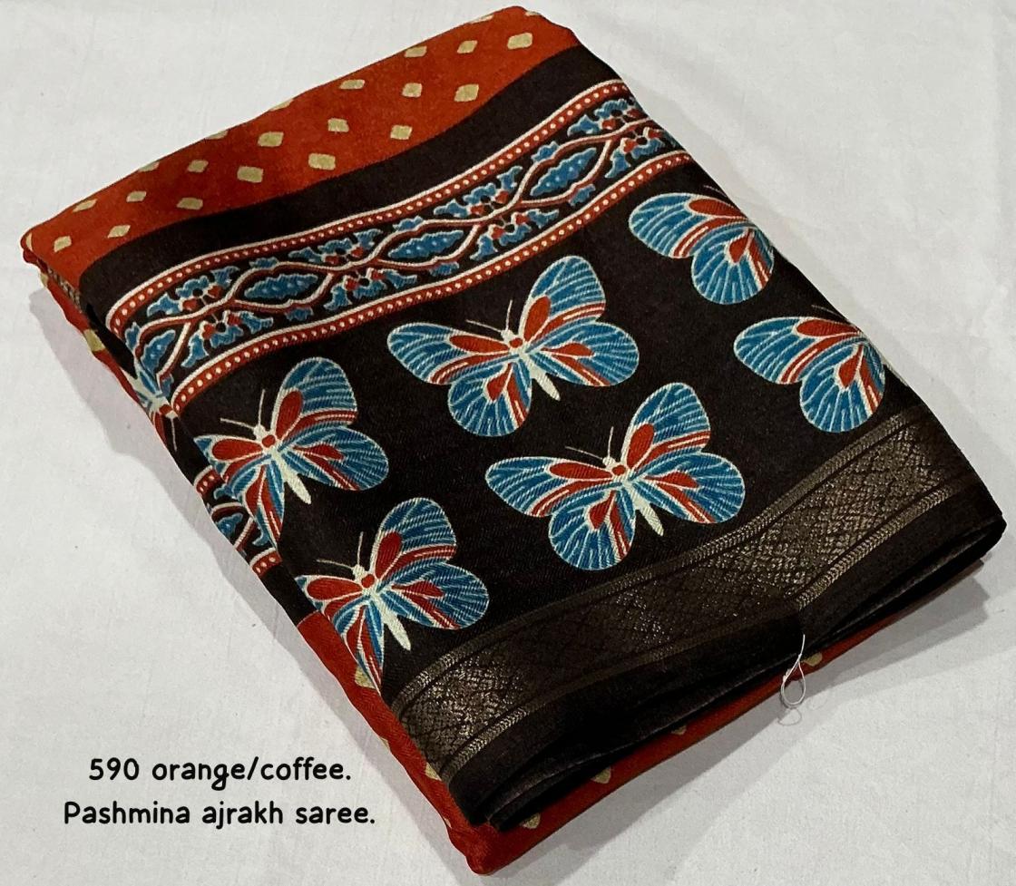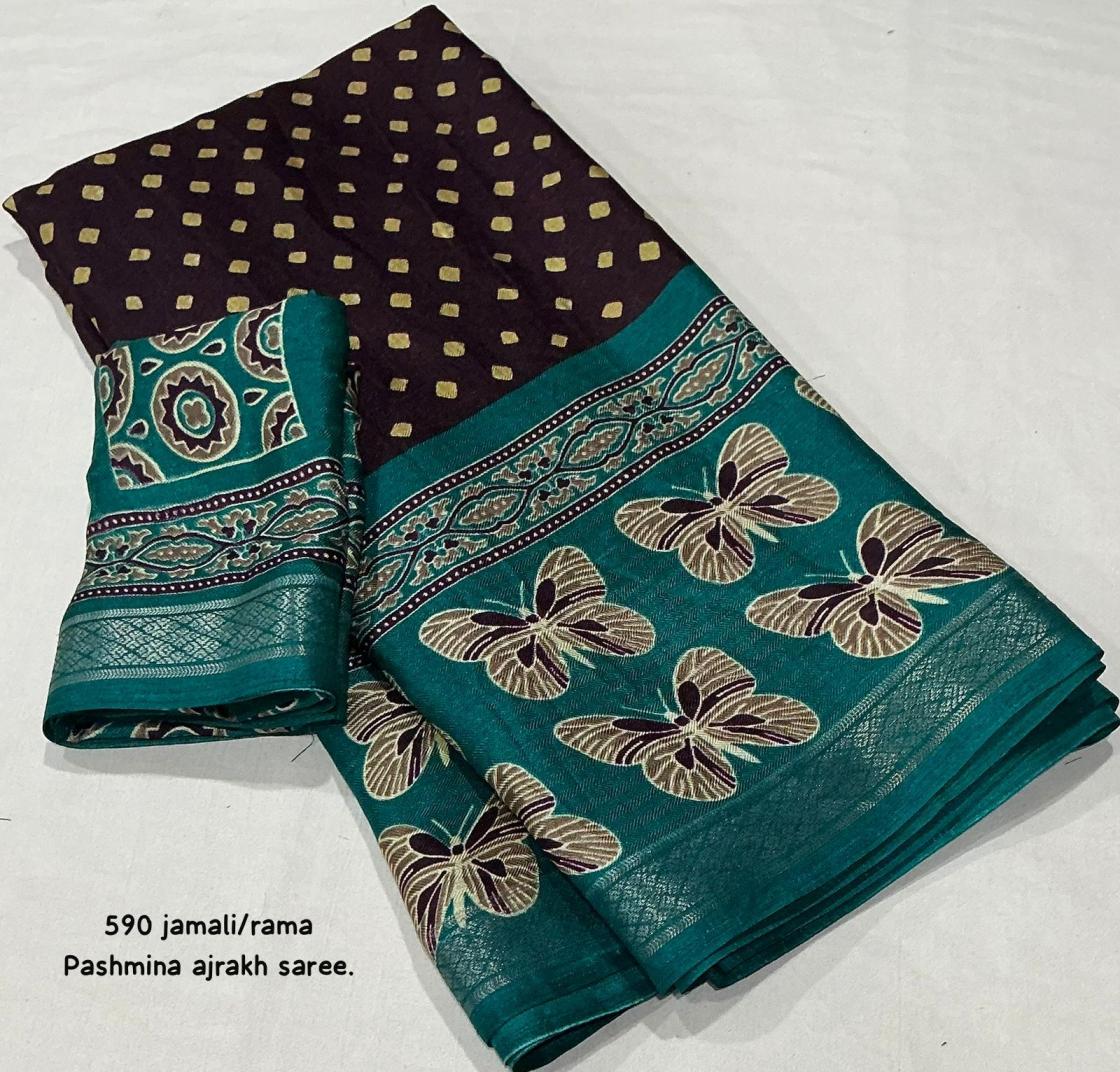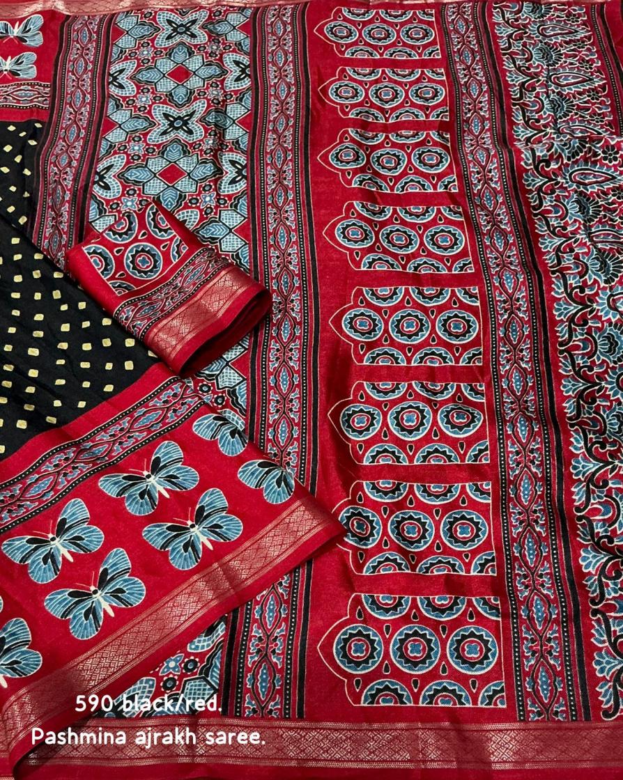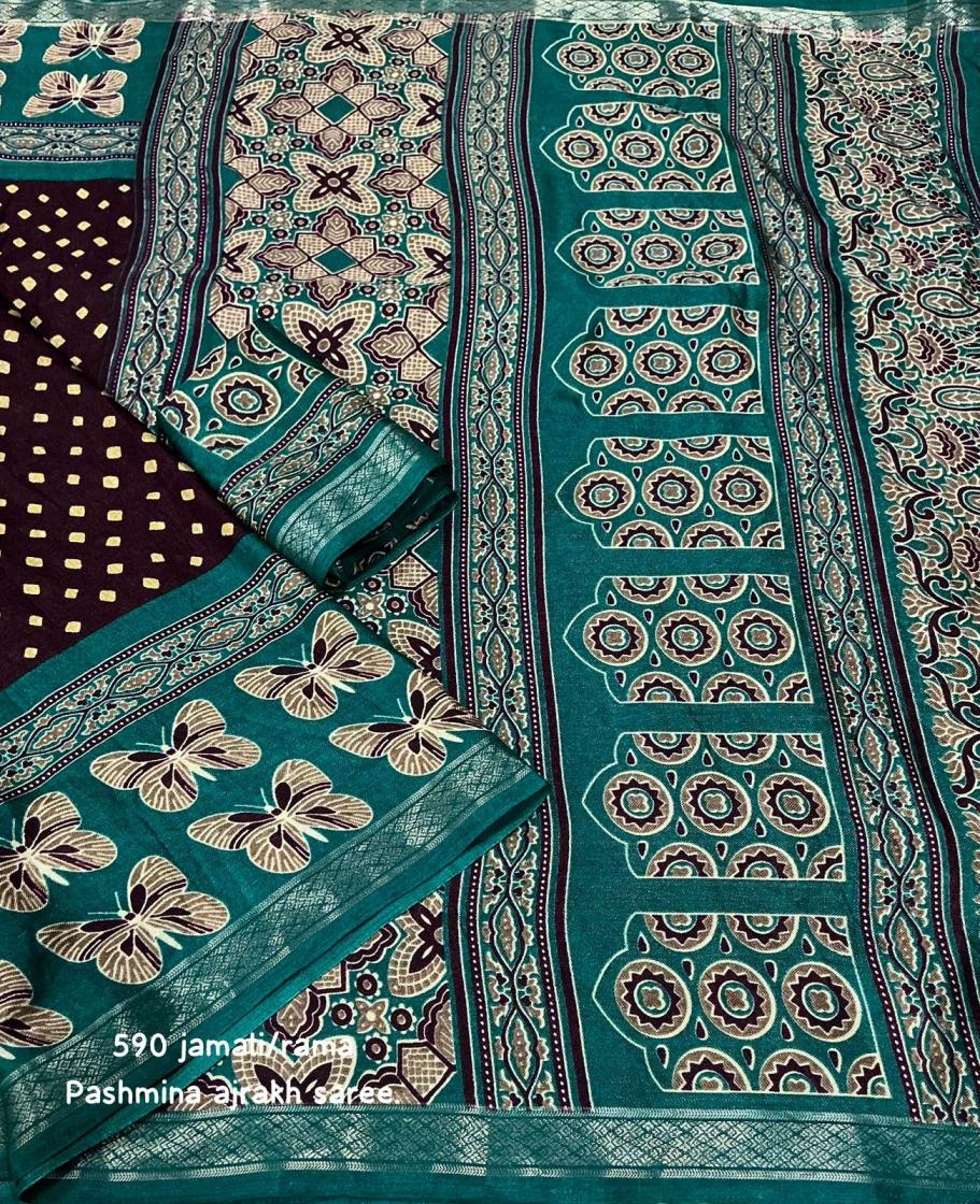 new arrivals New fancy ajrakh style saree. kc - 590 pashmina ajrakh. Soft pashmina saree with zari pattu woven border. Ajrakh style butterfly saree. Running ajrakh style blouse. Rate- 590+ship. Top trusted quality |