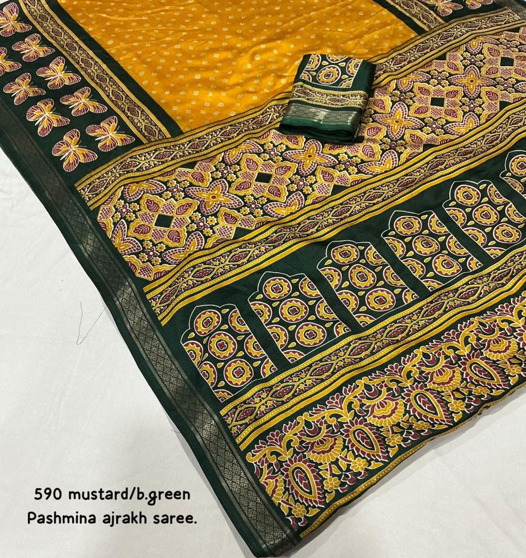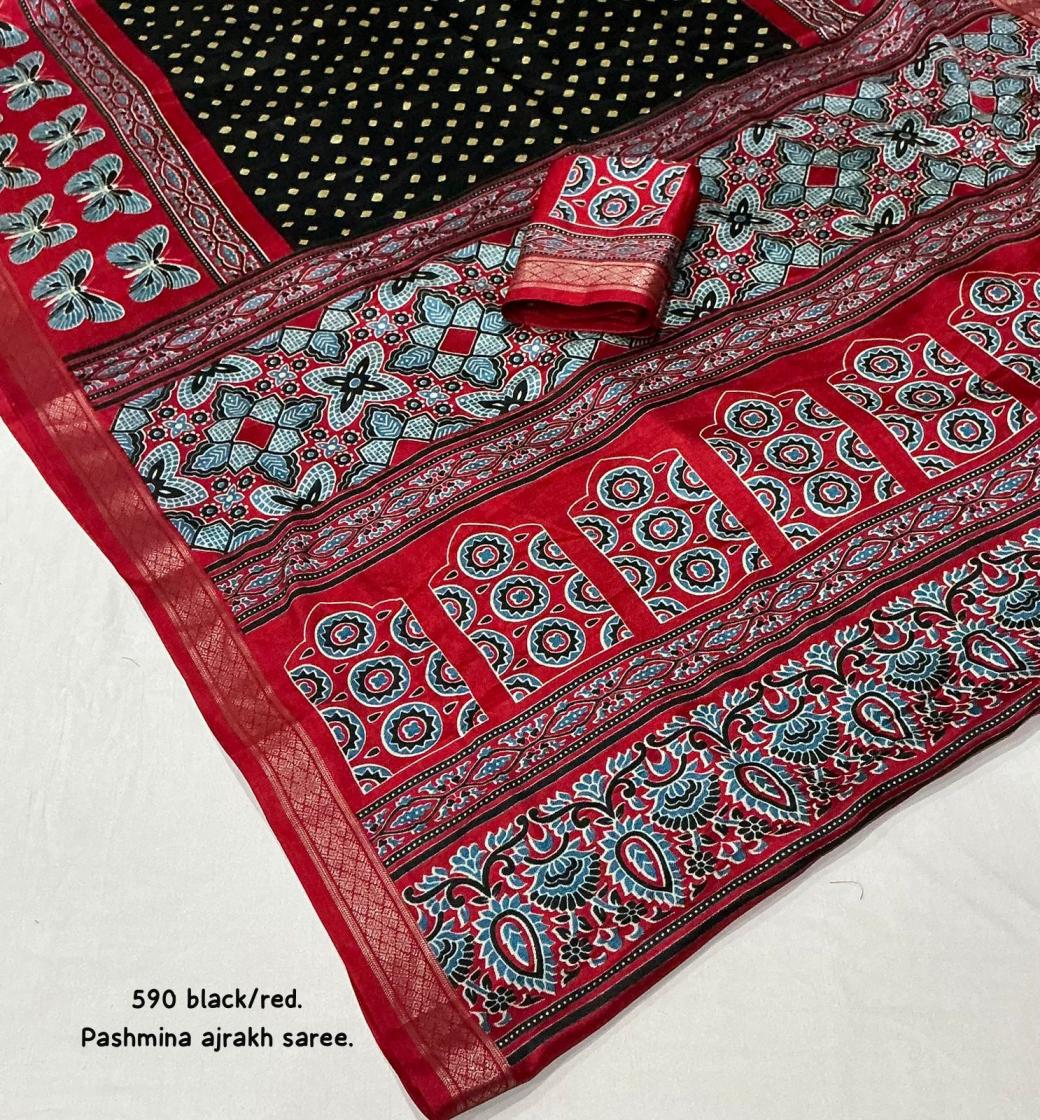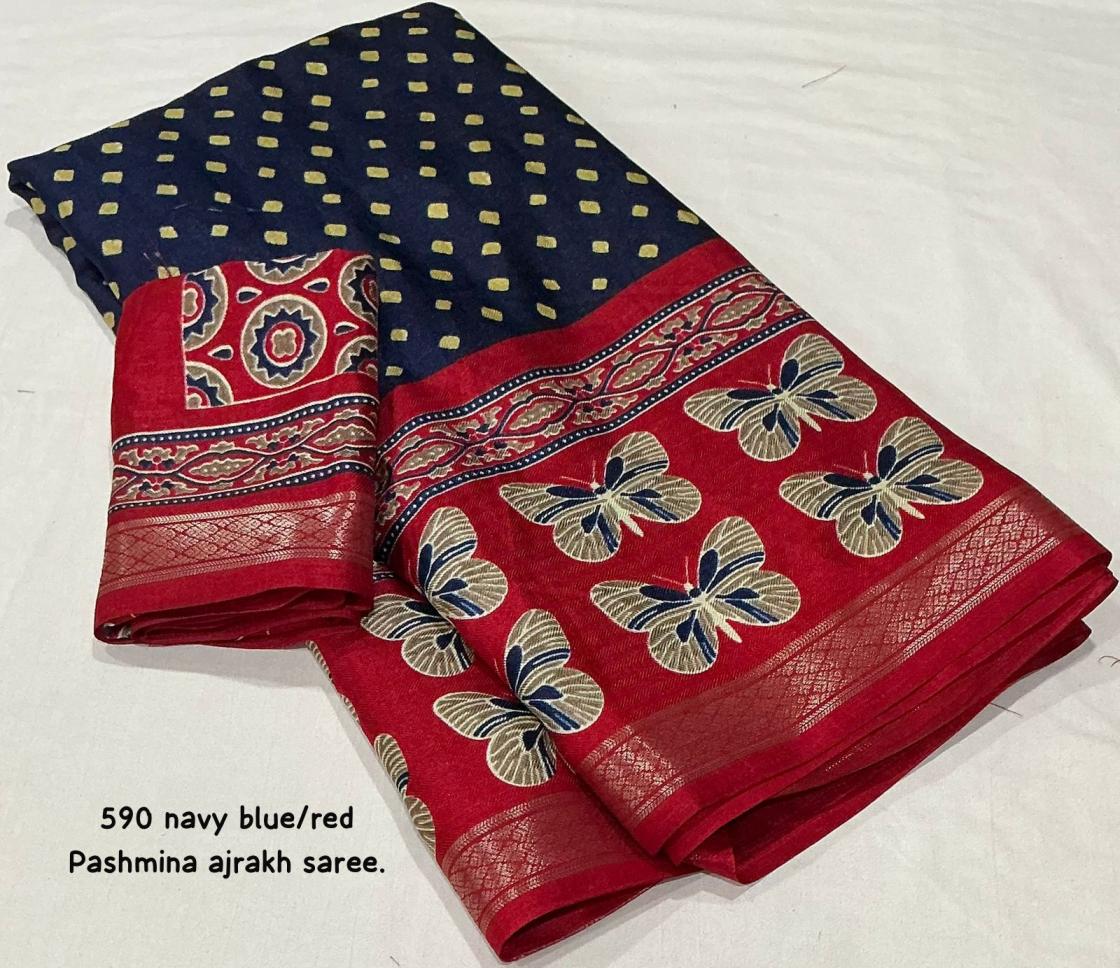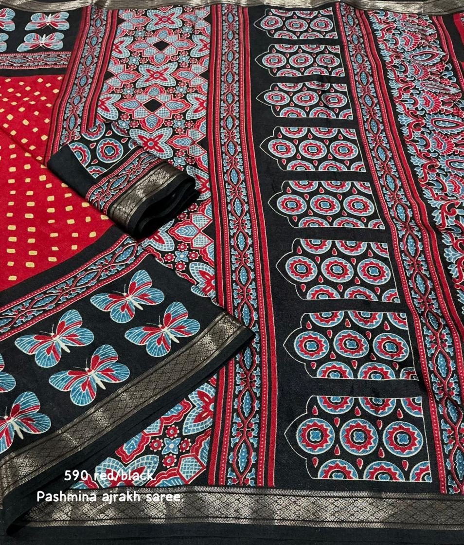 new arrivals New fancy ajrakh style saree. kc - 590 pashmina ajrakh. Soft pashmina saree with zari pattu woven border. Ajrakh style butterfly saree. Running ajrakh style blouse. Rate- 590+ship. Top trusted quality |