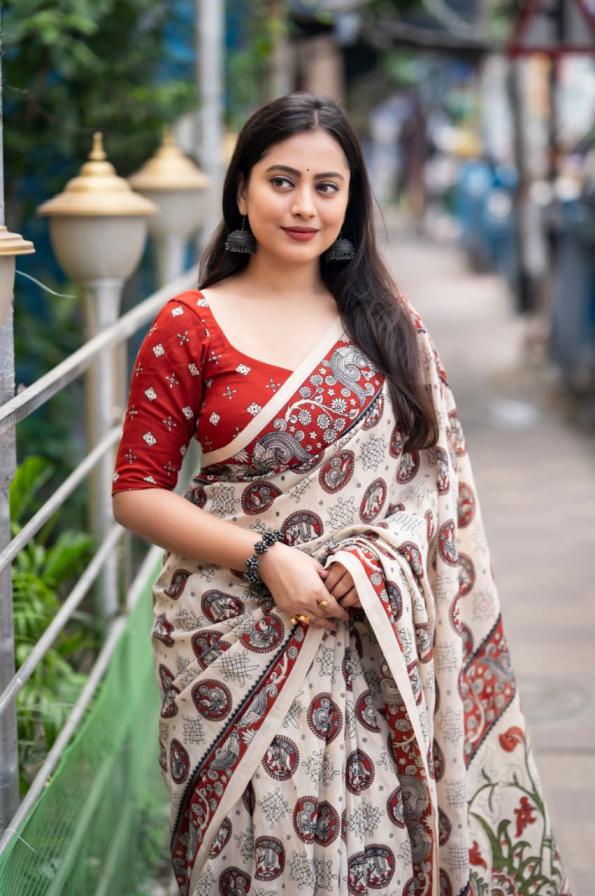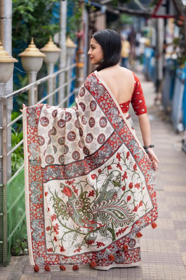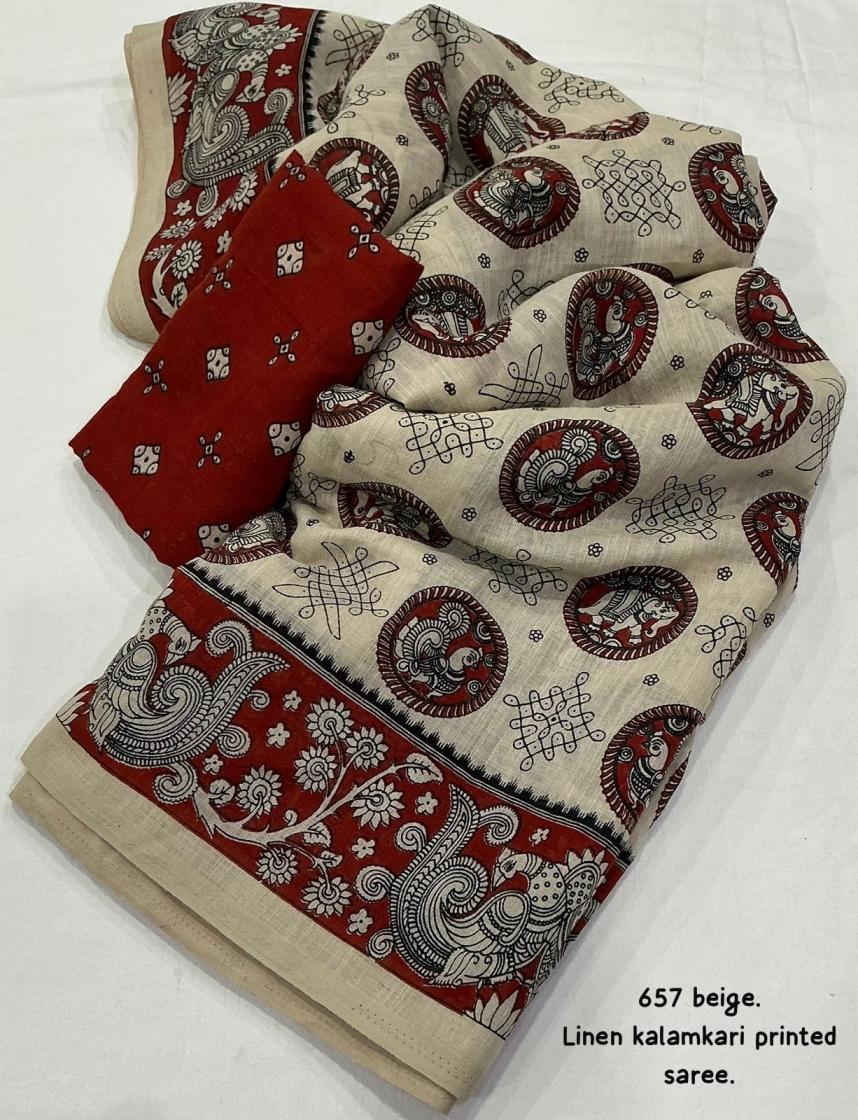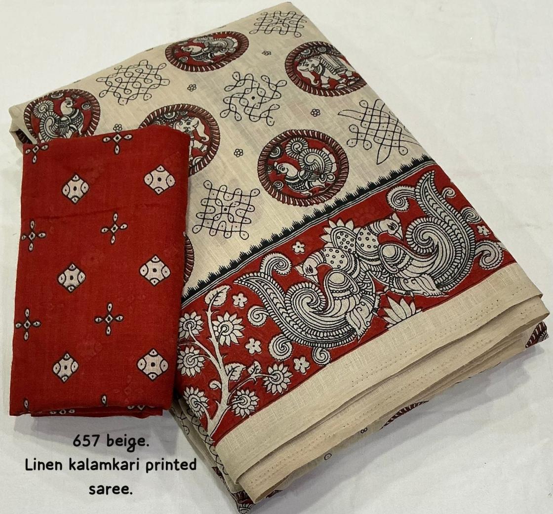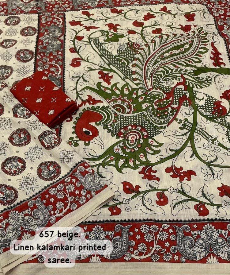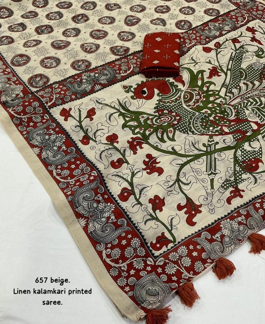 new arrivals New classic kalamkari linen saree. kc 657 linen kalamkari. Soft linen kalamkari printed saree with aari mirror work and jumaks. Perfectly matched running printed blouse. Rate - 650+ship. Top trusted quality |