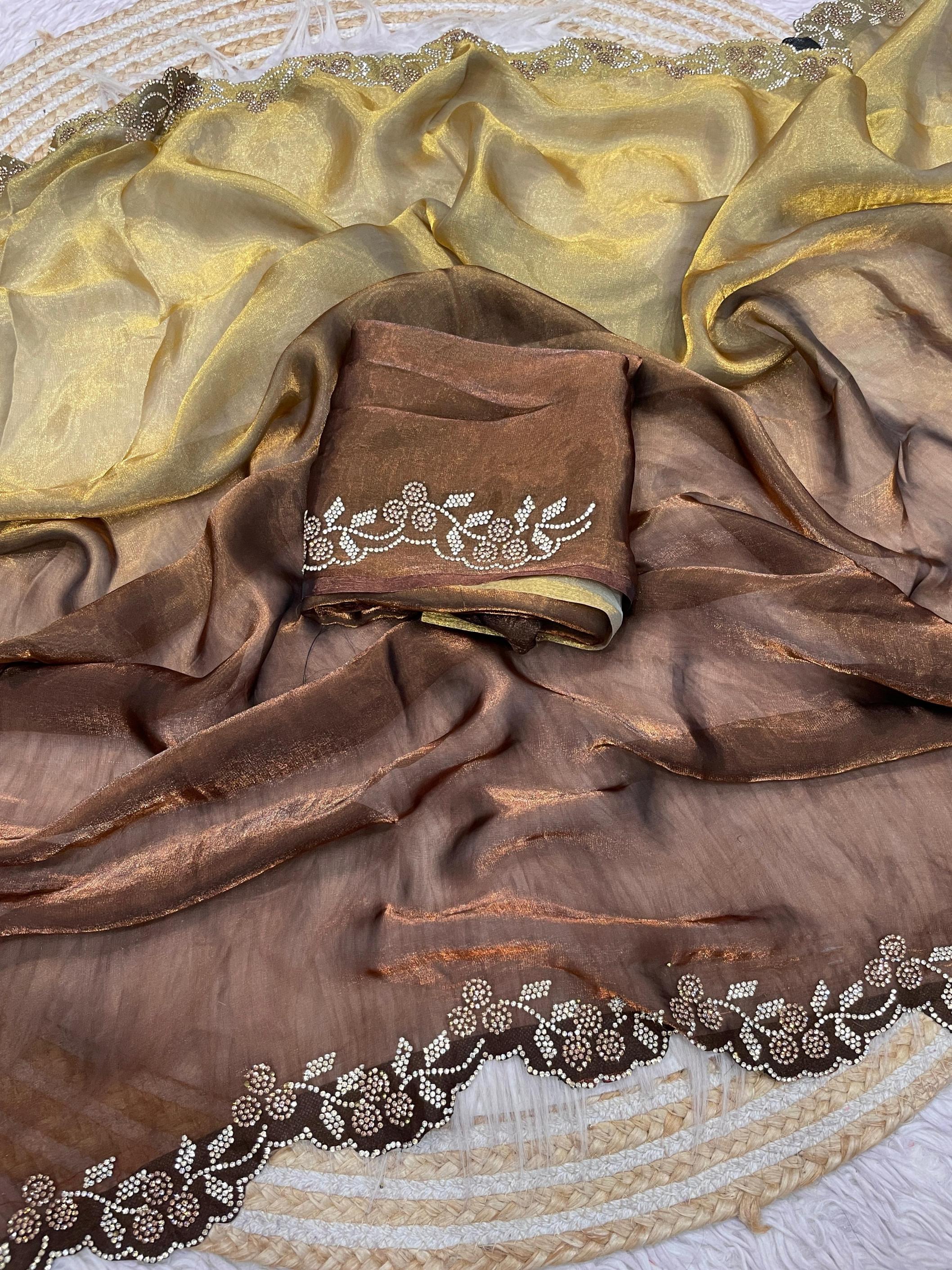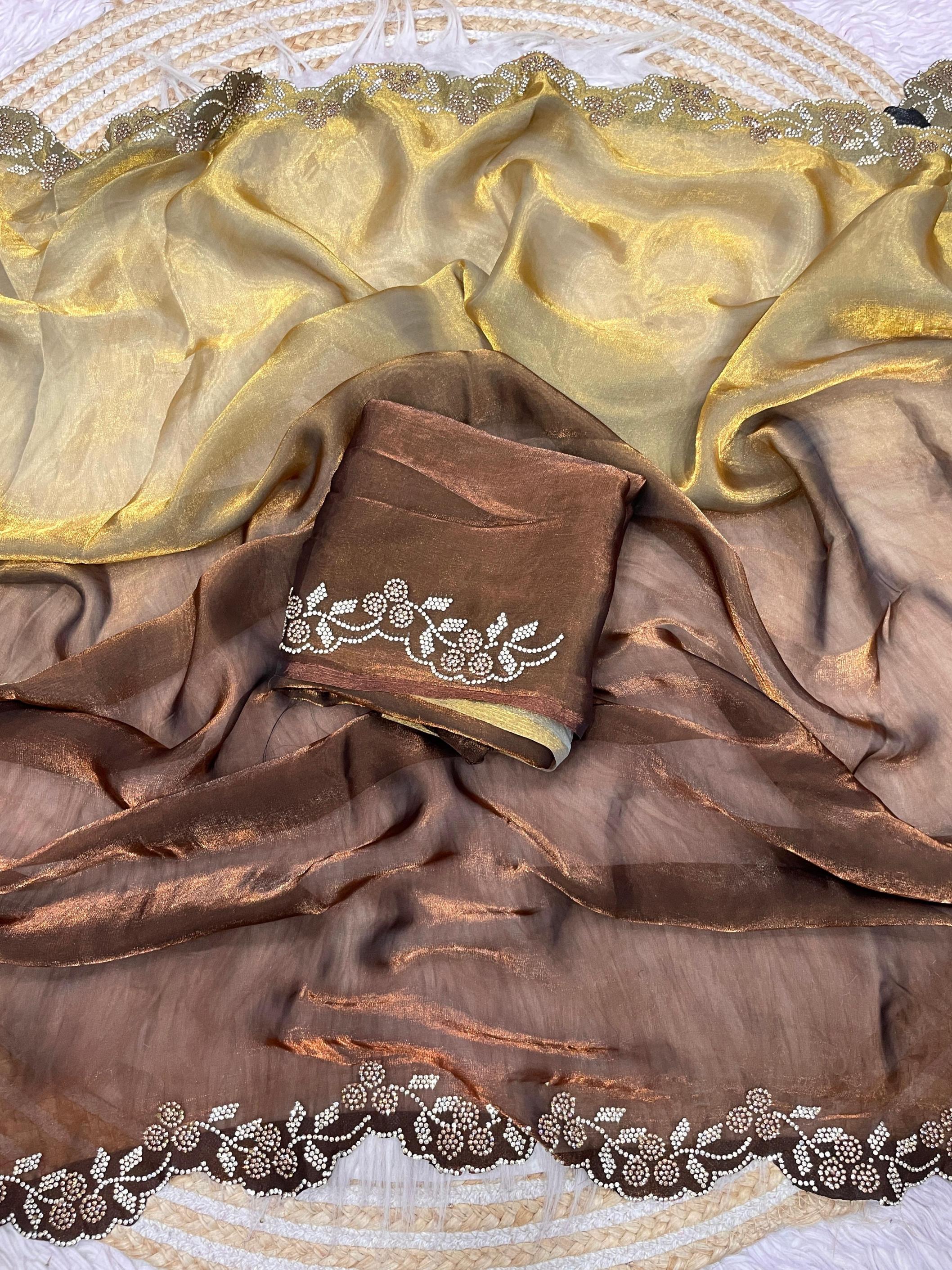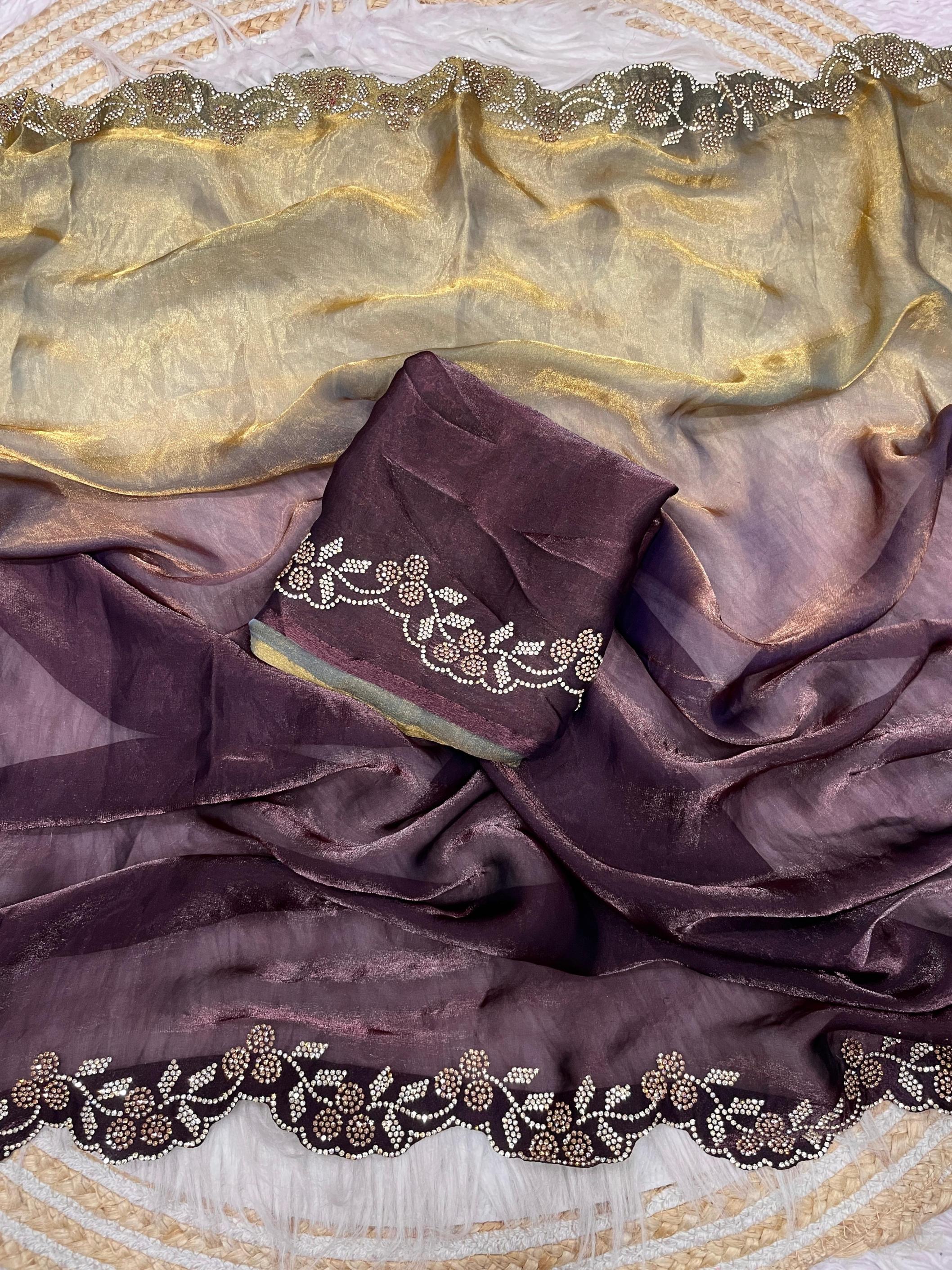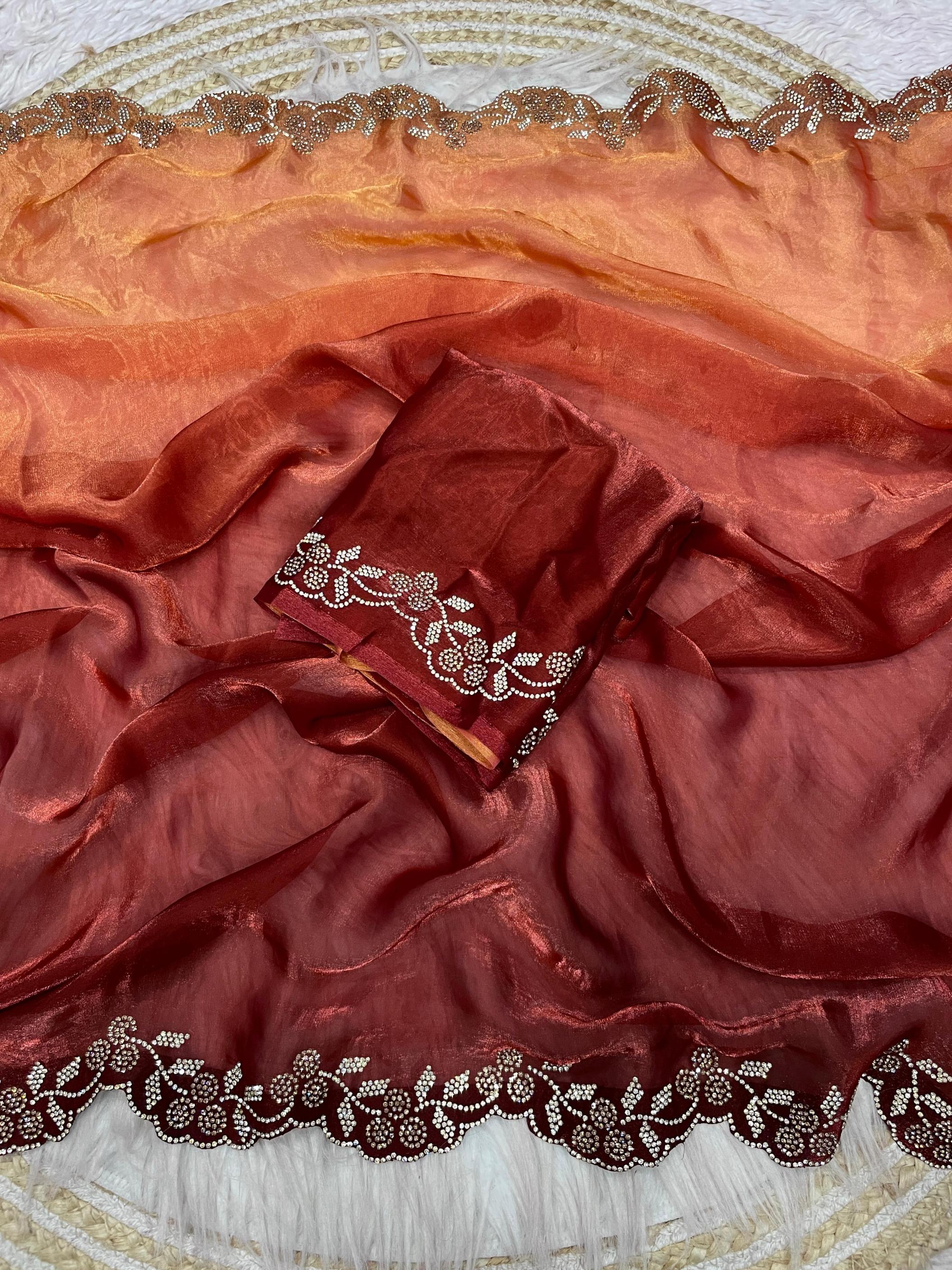 KC-664 Fabric:- Blouse - Space silk padding With jarkhan Work (Unstiched) Saree Length - 5:50 mtr PRICE - 1699/- READY STOCK |