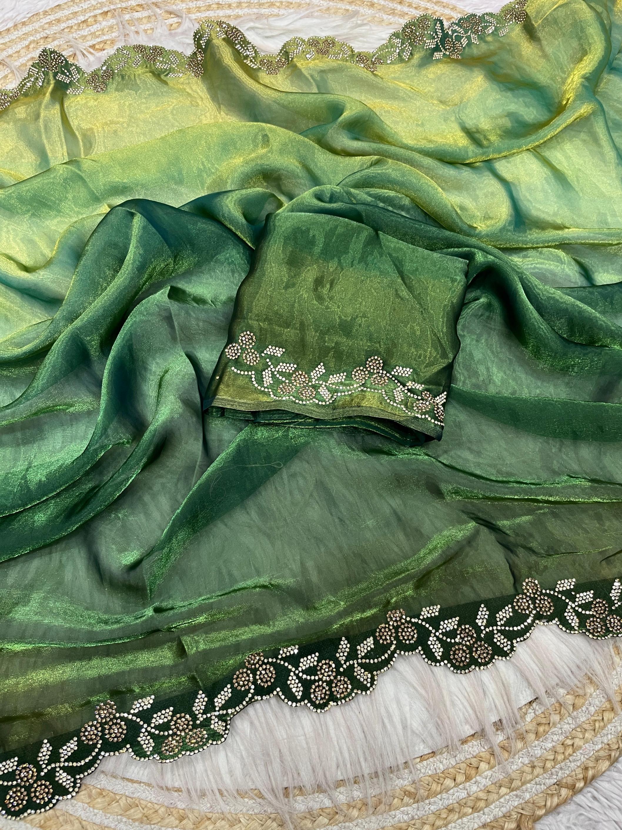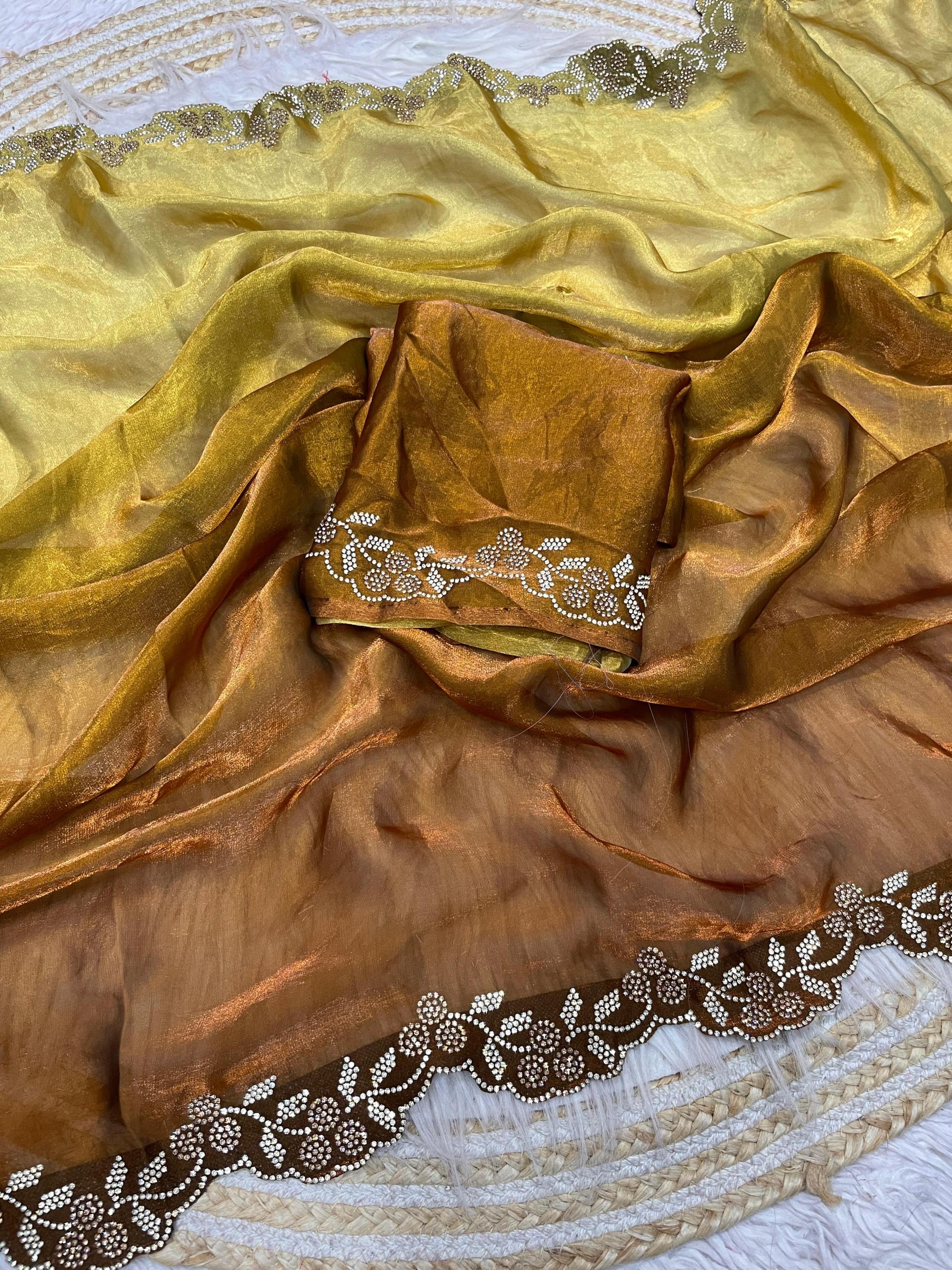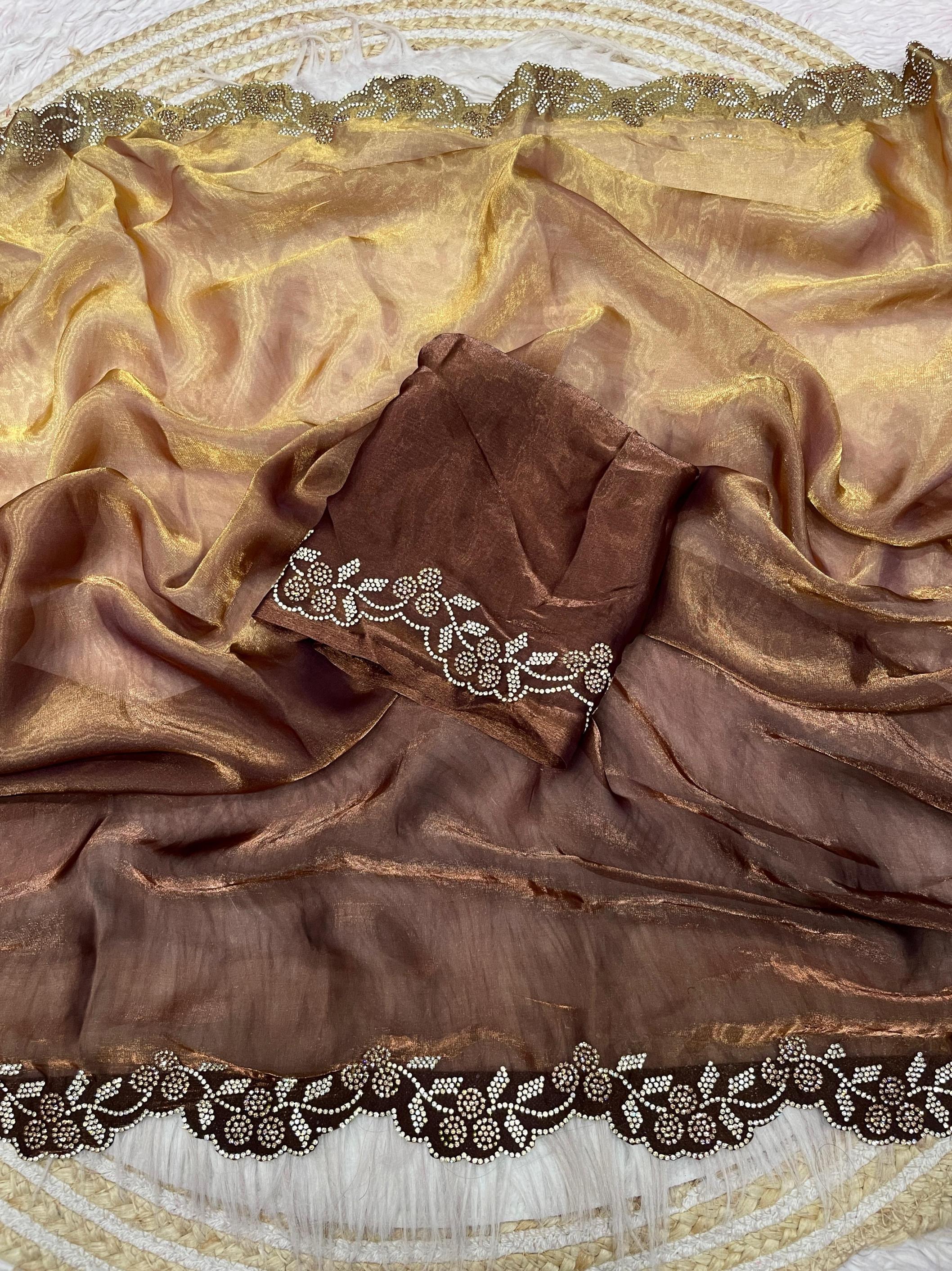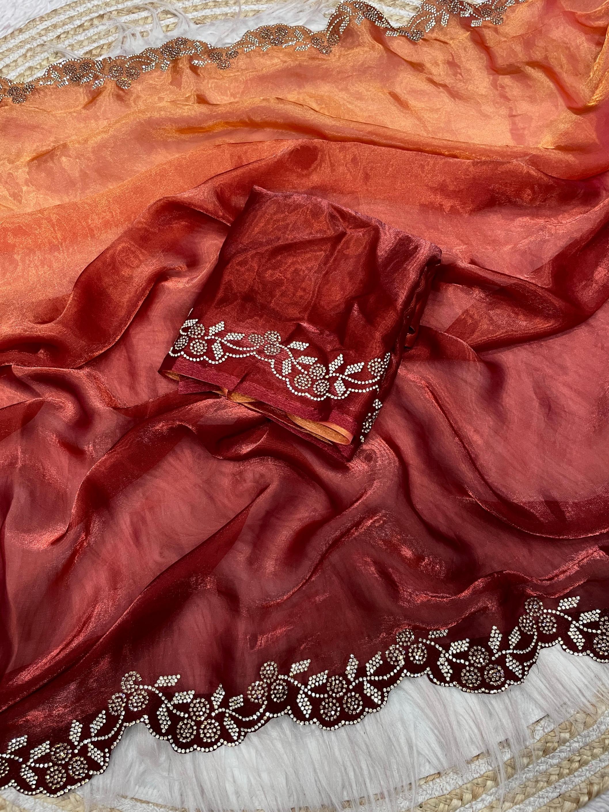 KC-664 Fabric:- Blouse - Space silk padding With jarkhan Work (Unstiched) Saree Length - 5:50 mtr PRICE - 1699/- READY STOCK |