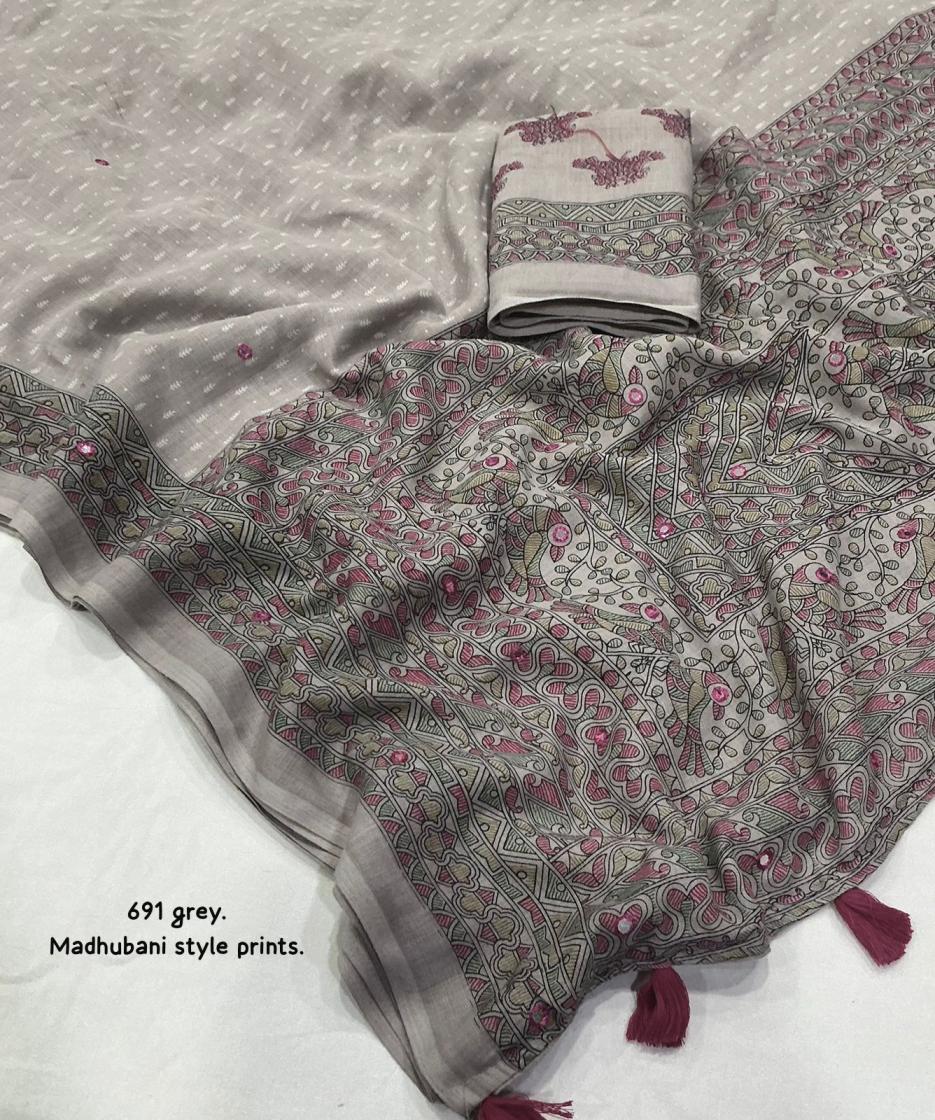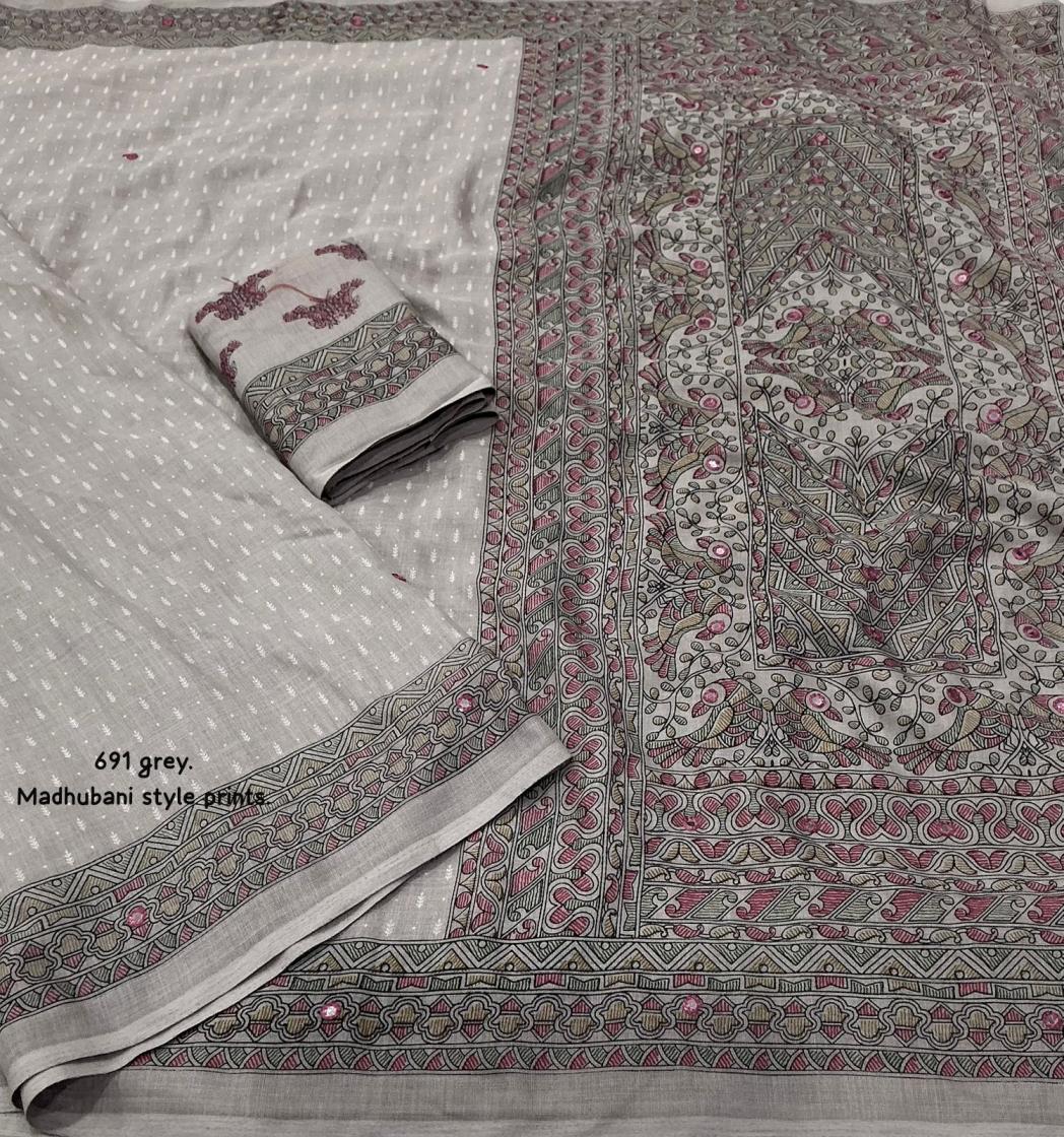 NEW ARRIVALD New addition to our best selling clothing. kc - 691 Madhubani linen. Soft linen saree with madhubani prints. Aari mirror work done saree. Cotton tassles on pallu. Rate - 730+ship. Top trusted quality |