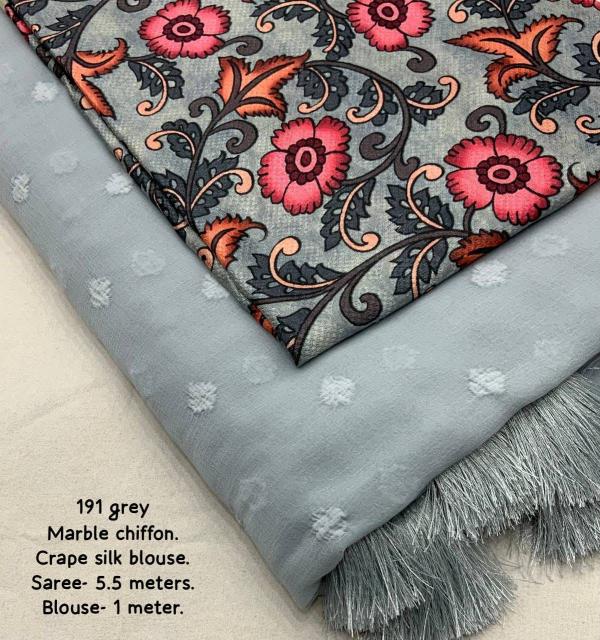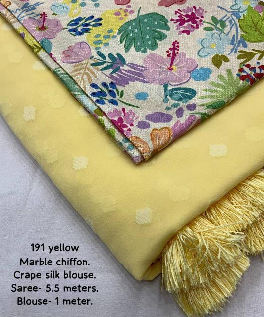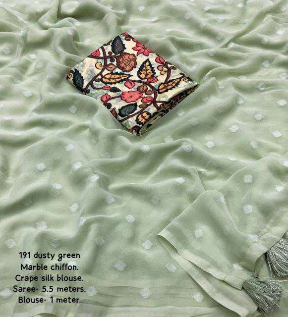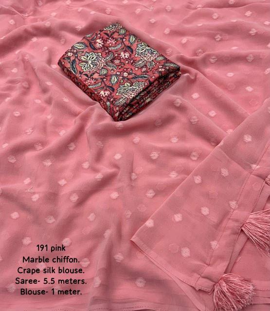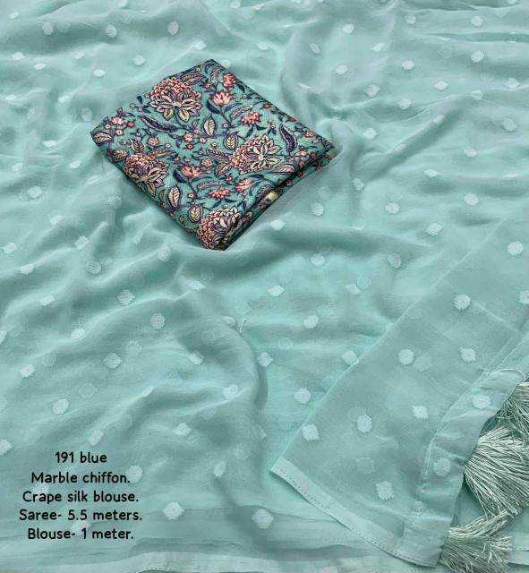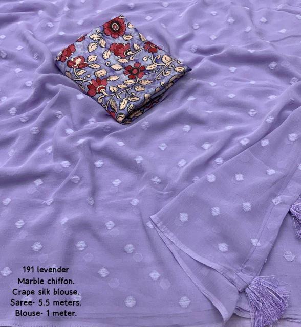 New arrivals New marble chiffon catalog kc - 191 kc - bubble chiffon. Quality- soft marble chiffon saree with self woven butti. Cotton tassles on pallu. Blouse- digital printed crape silk blouse. Rate - 650+ship Top trusted quality |