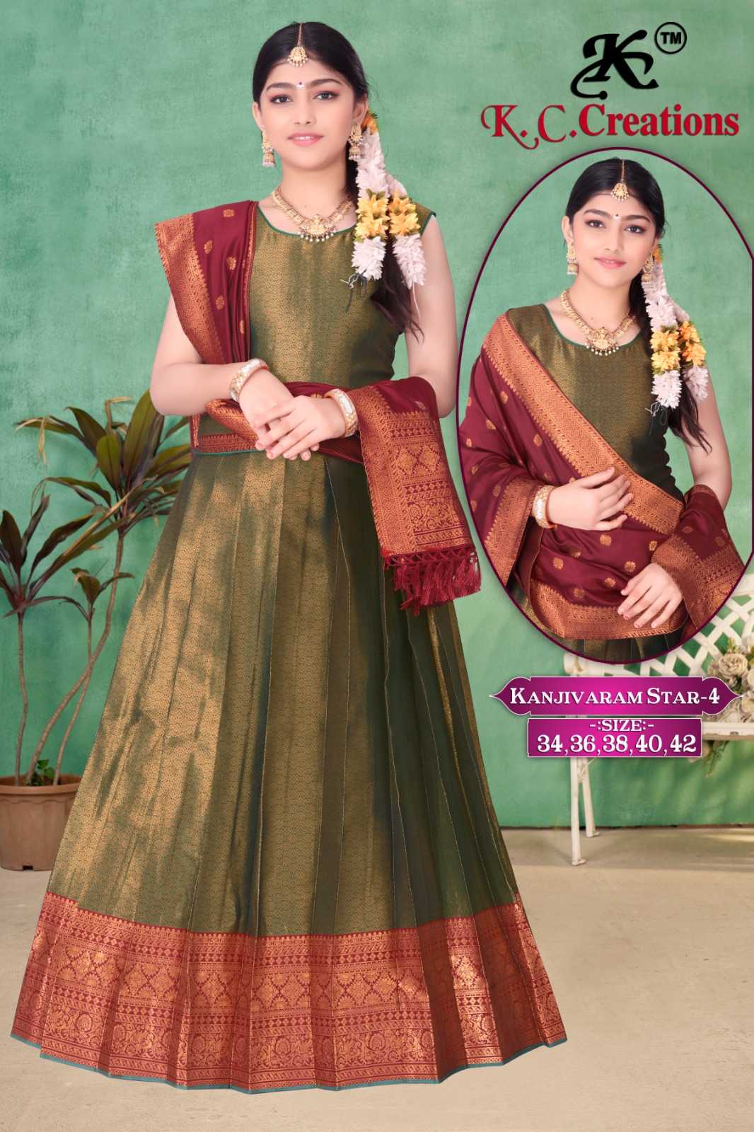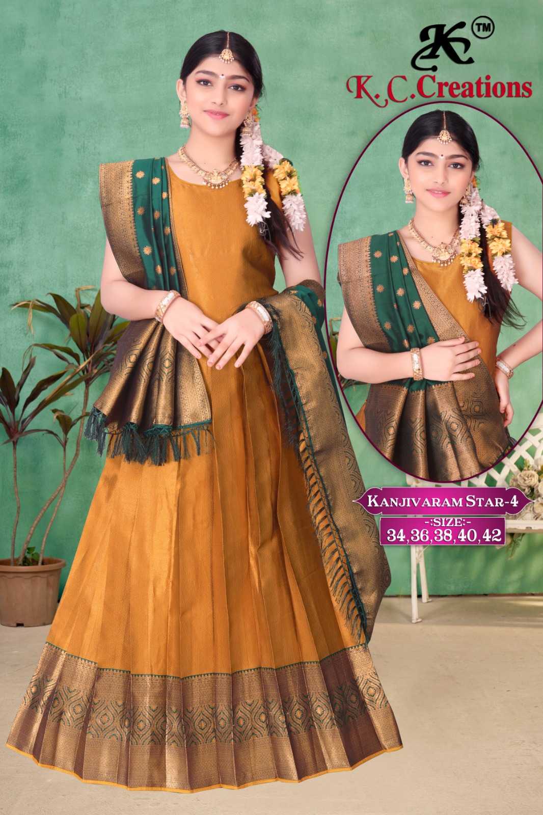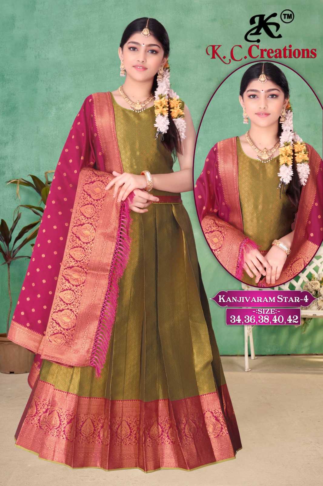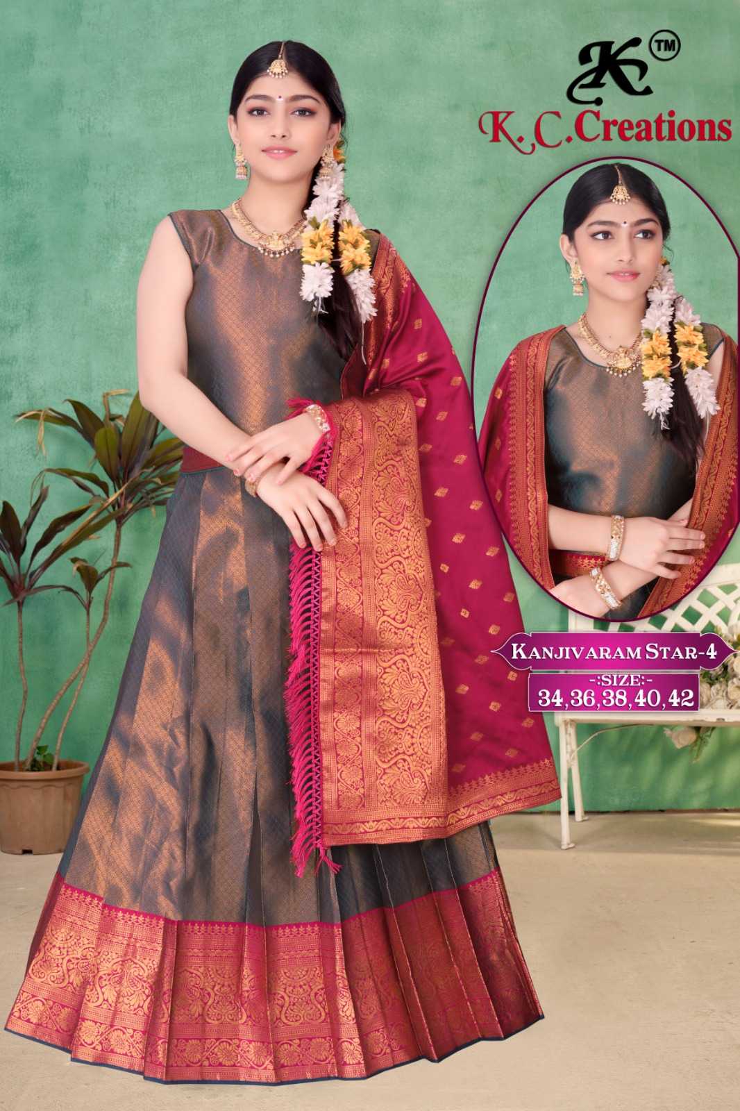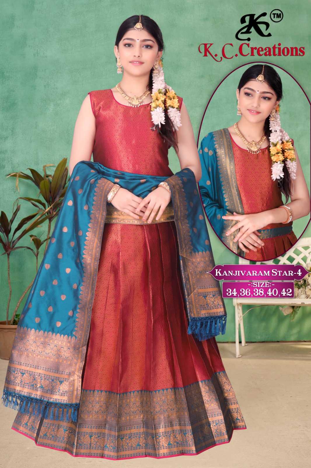 K C CREATION KANJIVARAM STAR VOL 4 Size 34,36,38,40,42 PATTU LEHENGA KIDS WEAR Moq 30 pc |