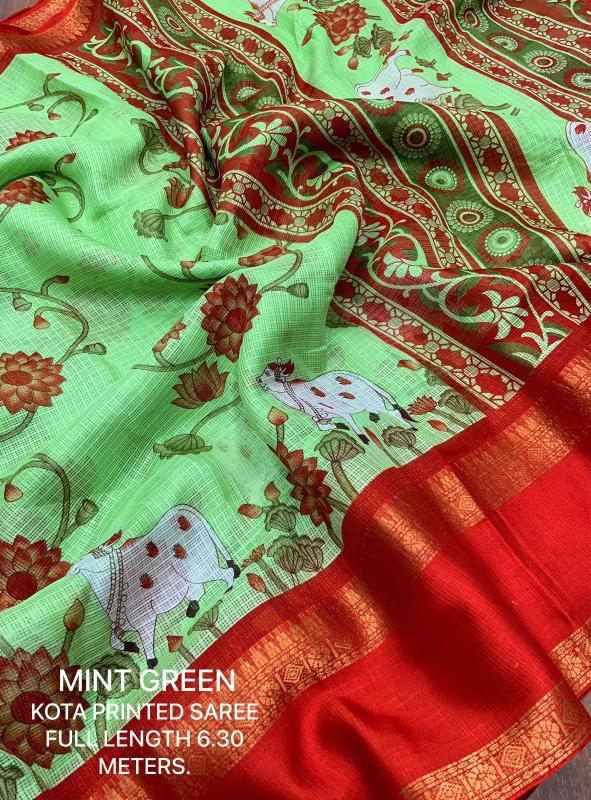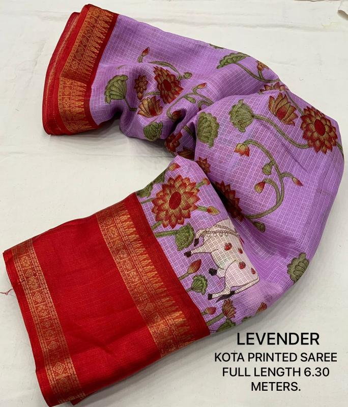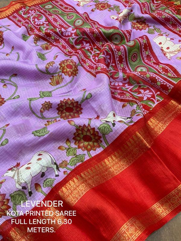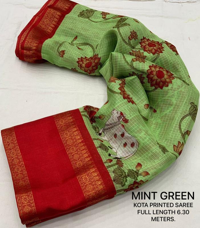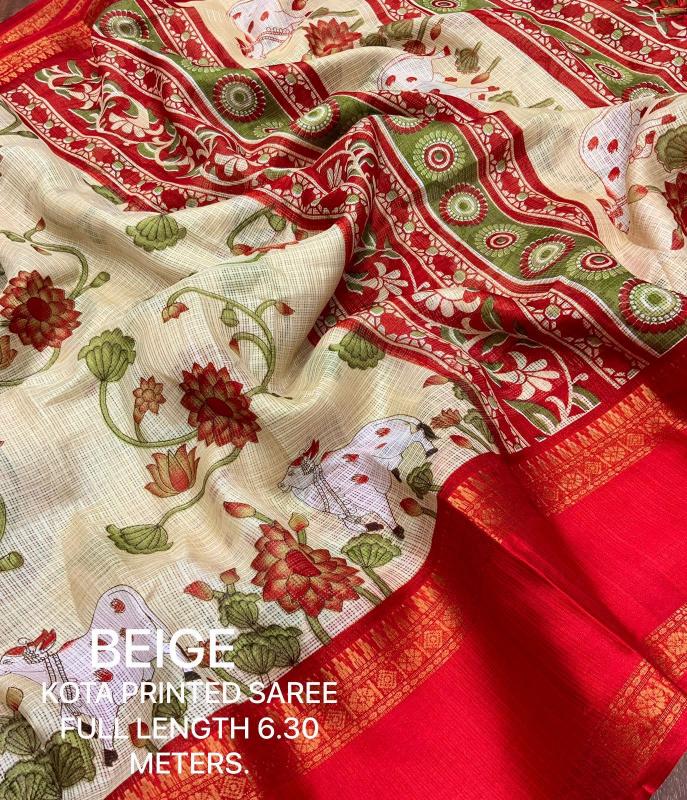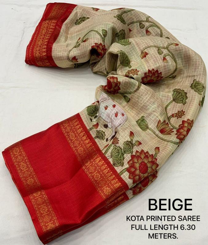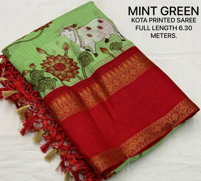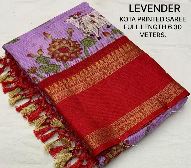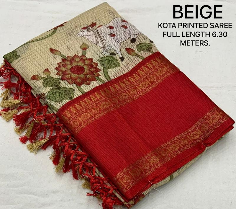 New kota printed catalog KC - GAYATRI KOTA Quality- soft kota pichawi style printed saree with trendy bentex border. Tassels on pallu. Blouse- contrast red plain runing kota blouse. Rate- 499+ship Top trusted quality |