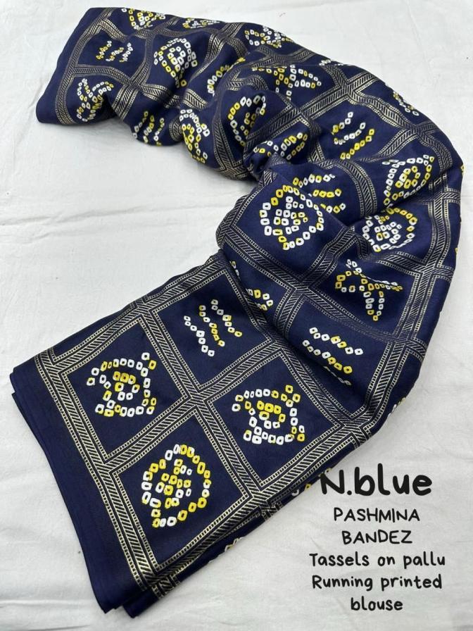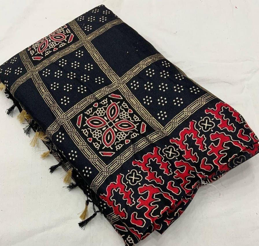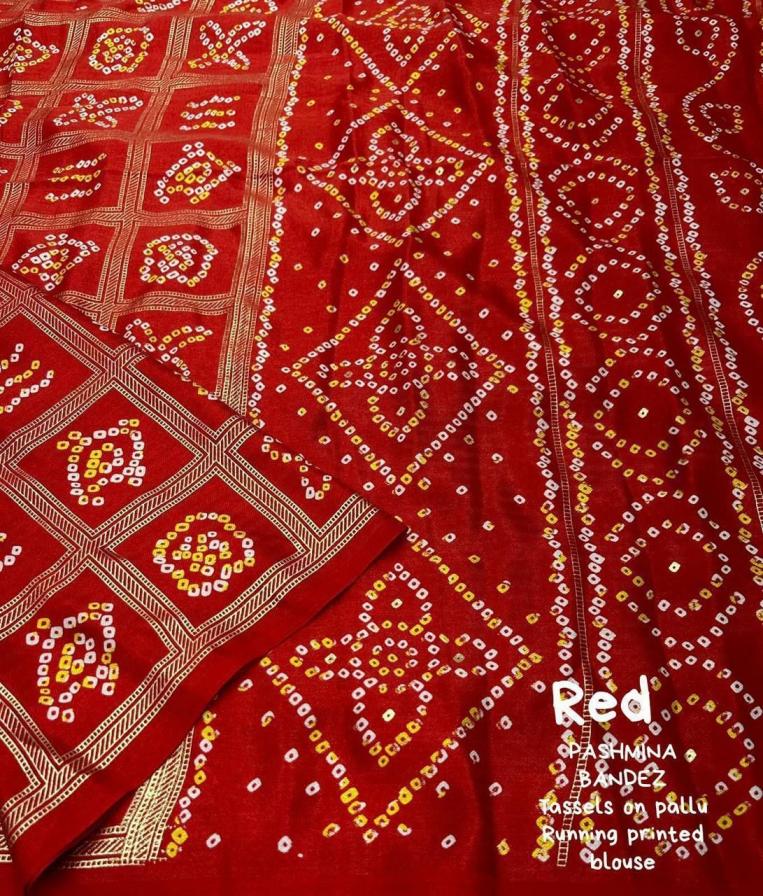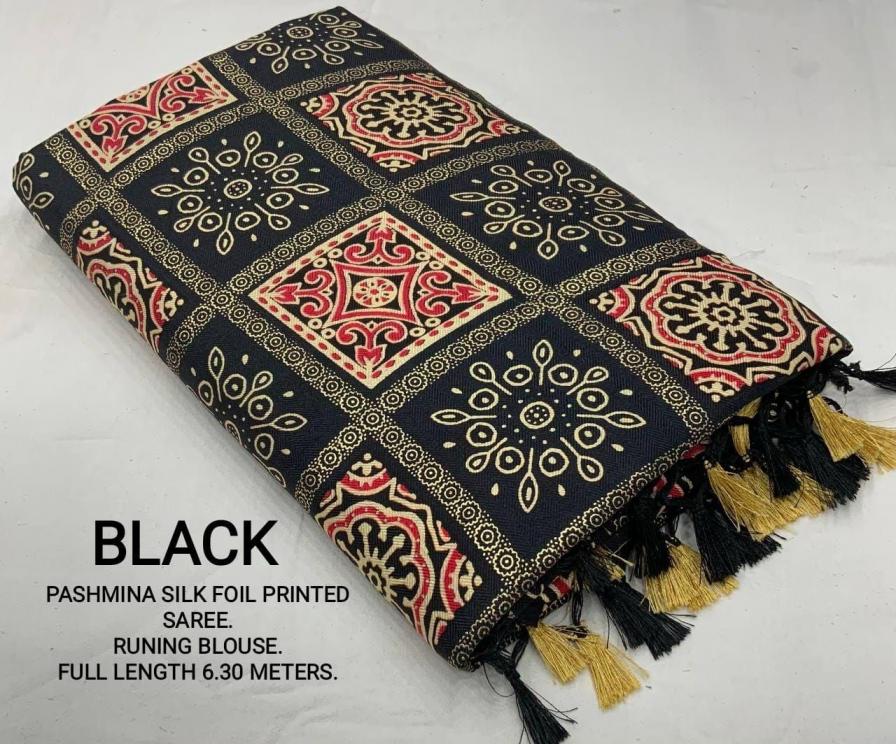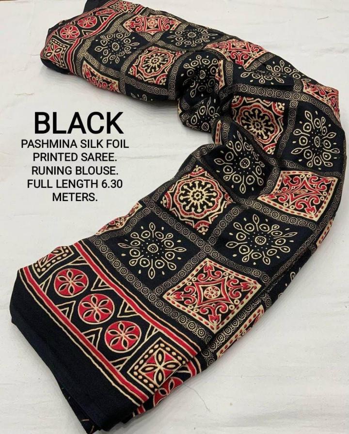 best seller New printed saree catalog KC - pashmina silk. Quality- soft silk saree with ajrakh style and foil print. Zalar on pallu. Blouse- soft pashmina allover printed blouse. Full length 6.30 meters. Rate- 499+ship. Top trusted quality |