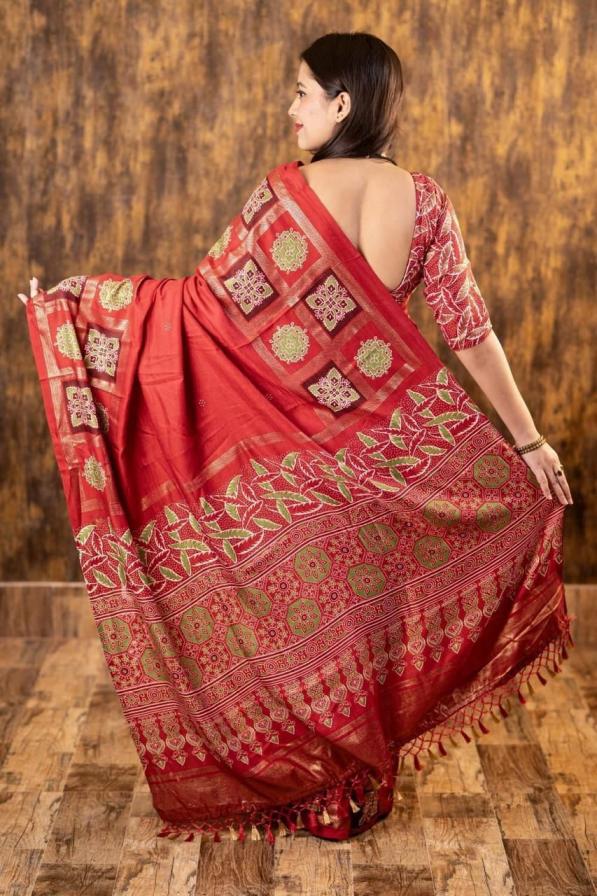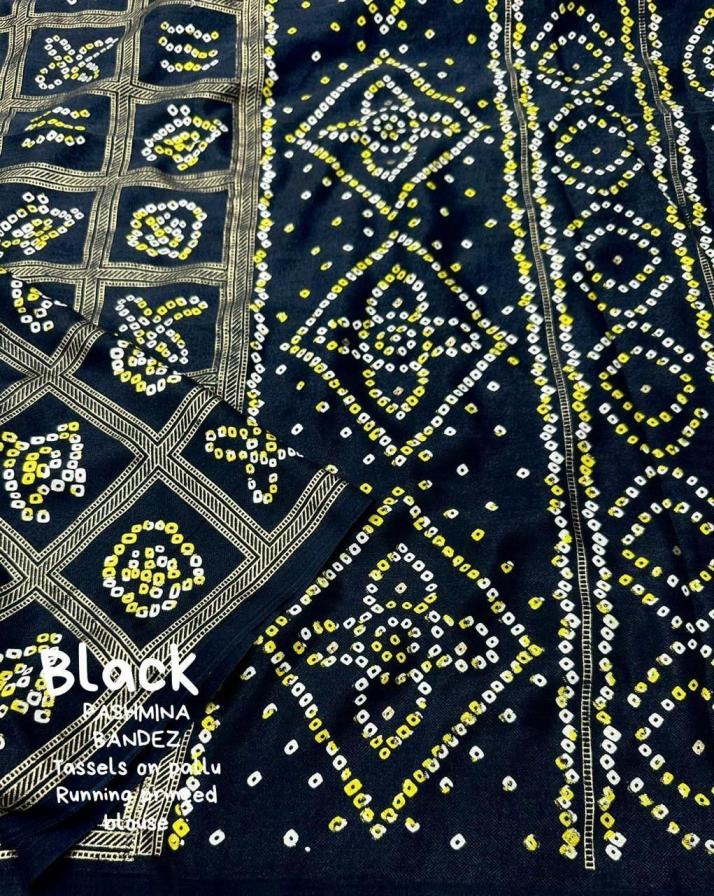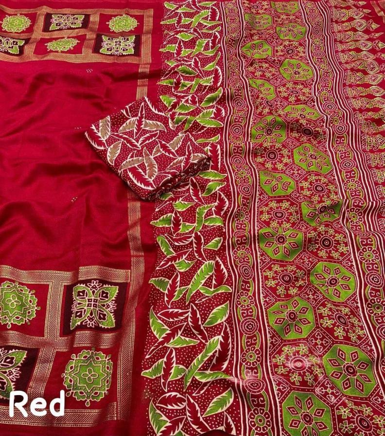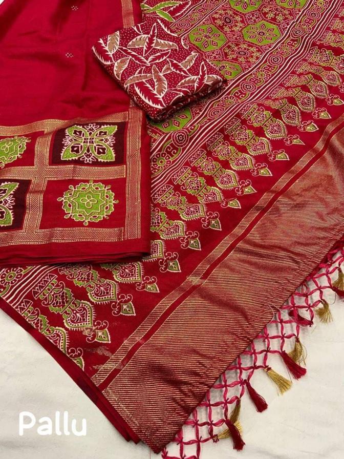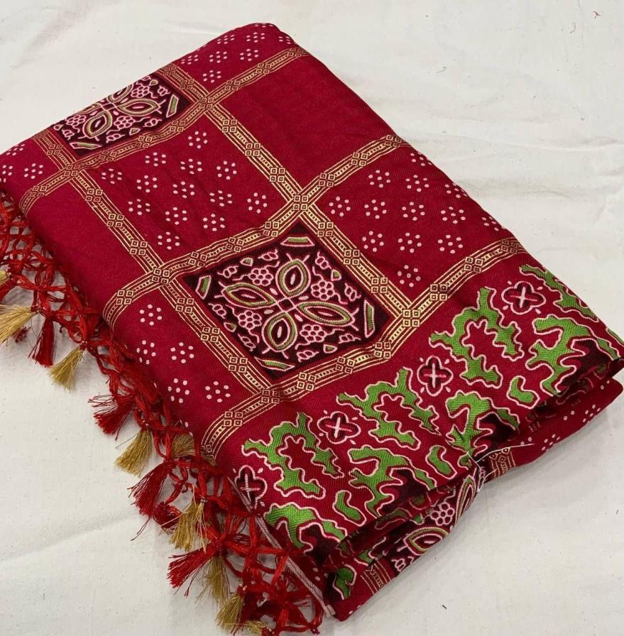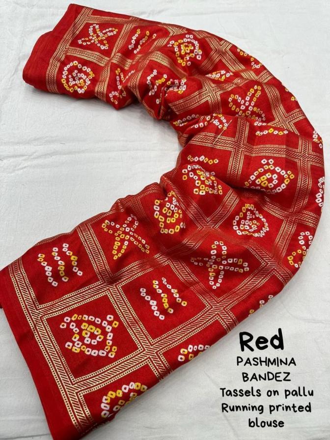 best seller New printed saree catalog KC - pashmina silk. Quality- soft silk saree with ajrakh style and foil print. Zalar on pallu. Blouse- soft pashmina allover printed blouse. Full length 6.30 meters. Rate- 499+ship. Top trusted quality |