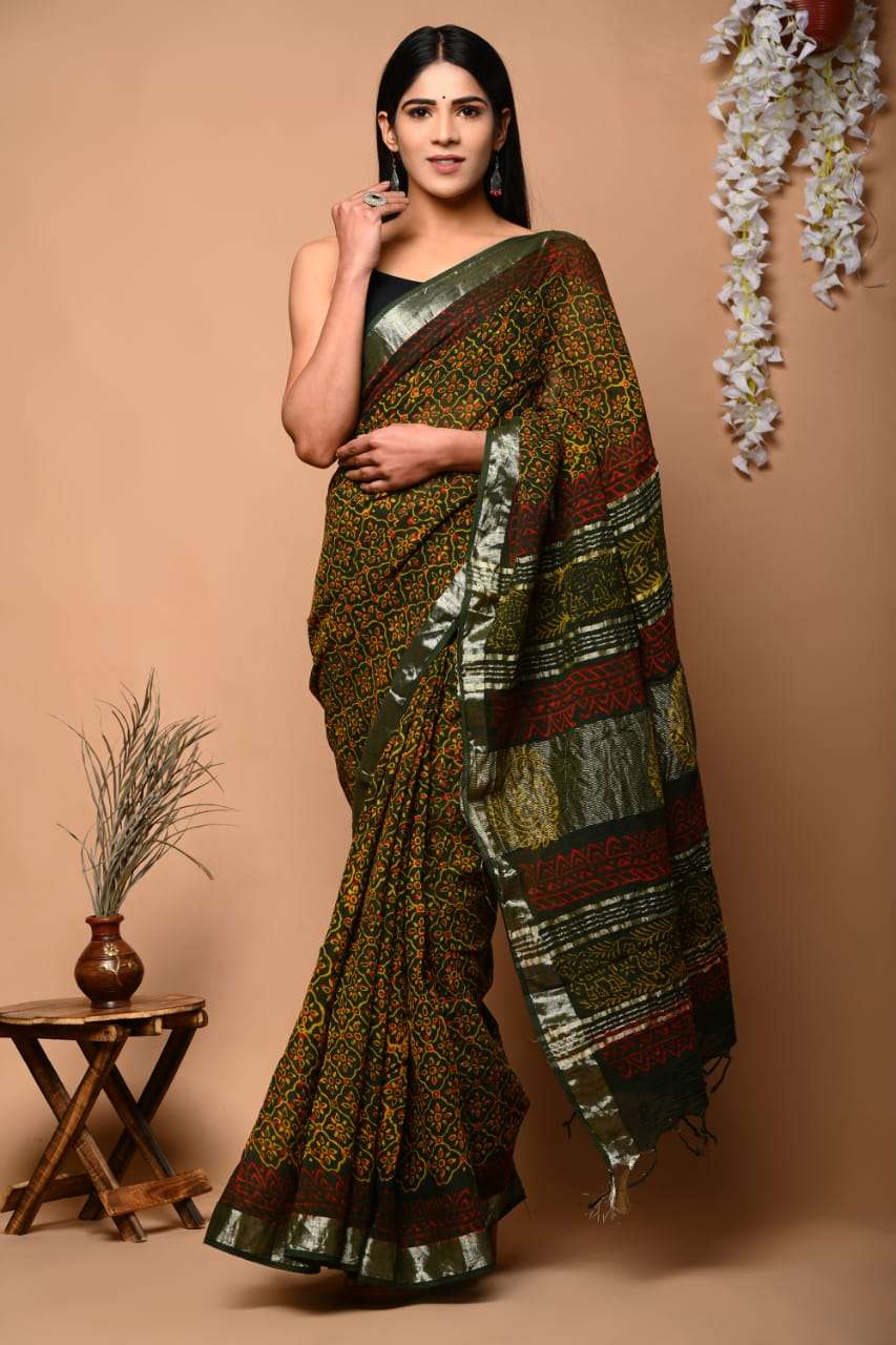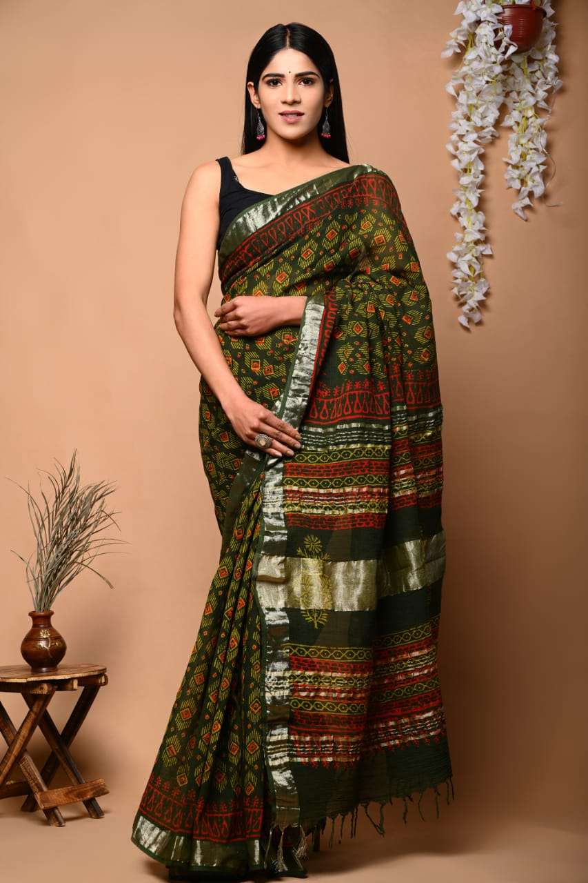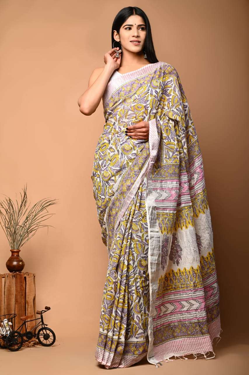 kc pushpa vol 3 hand block printed soft linen fabric cotton slub saree vegitable prints