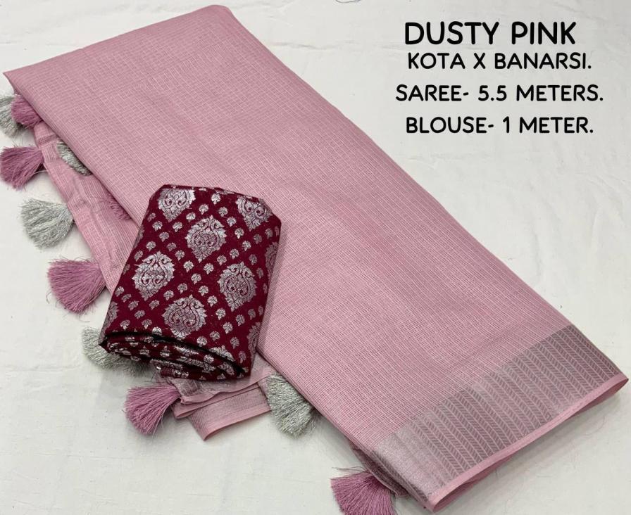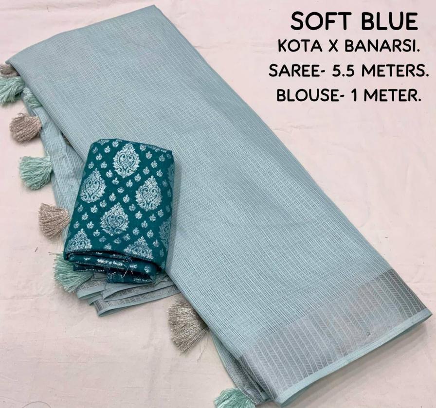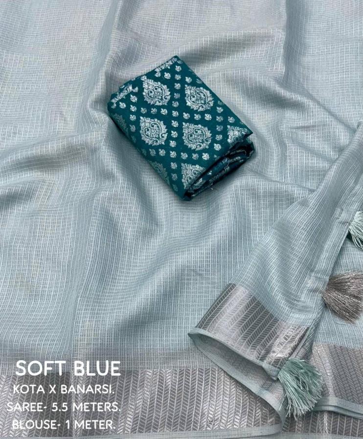 back in stock New kota sarees KC - SILK KOTA (BANARSI EDITION) Quamity- soft kota saree with silver zari border Tassels on pallu.