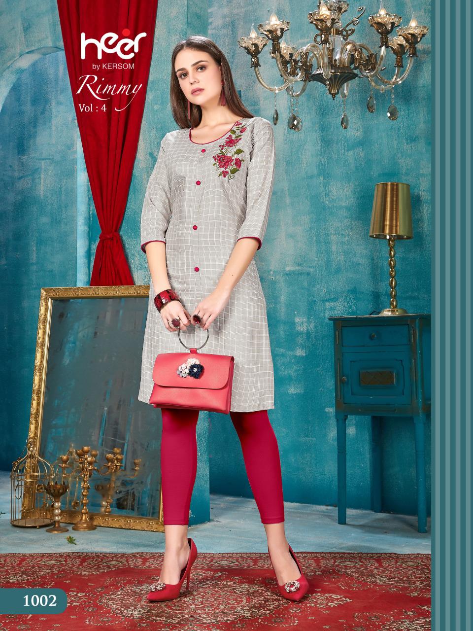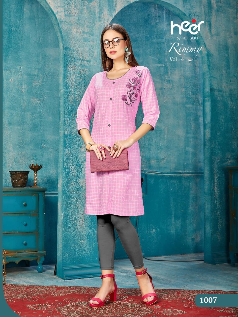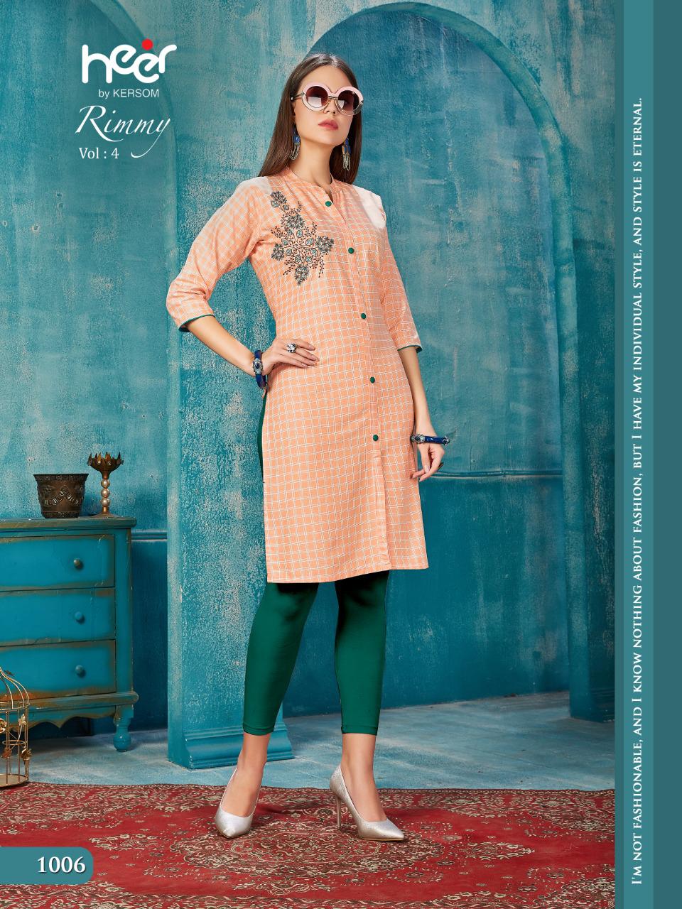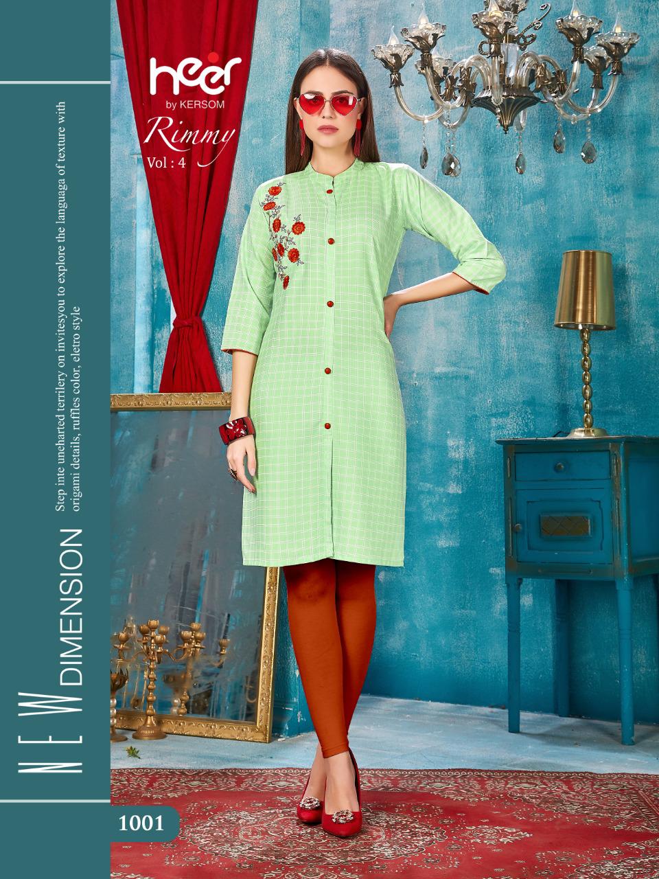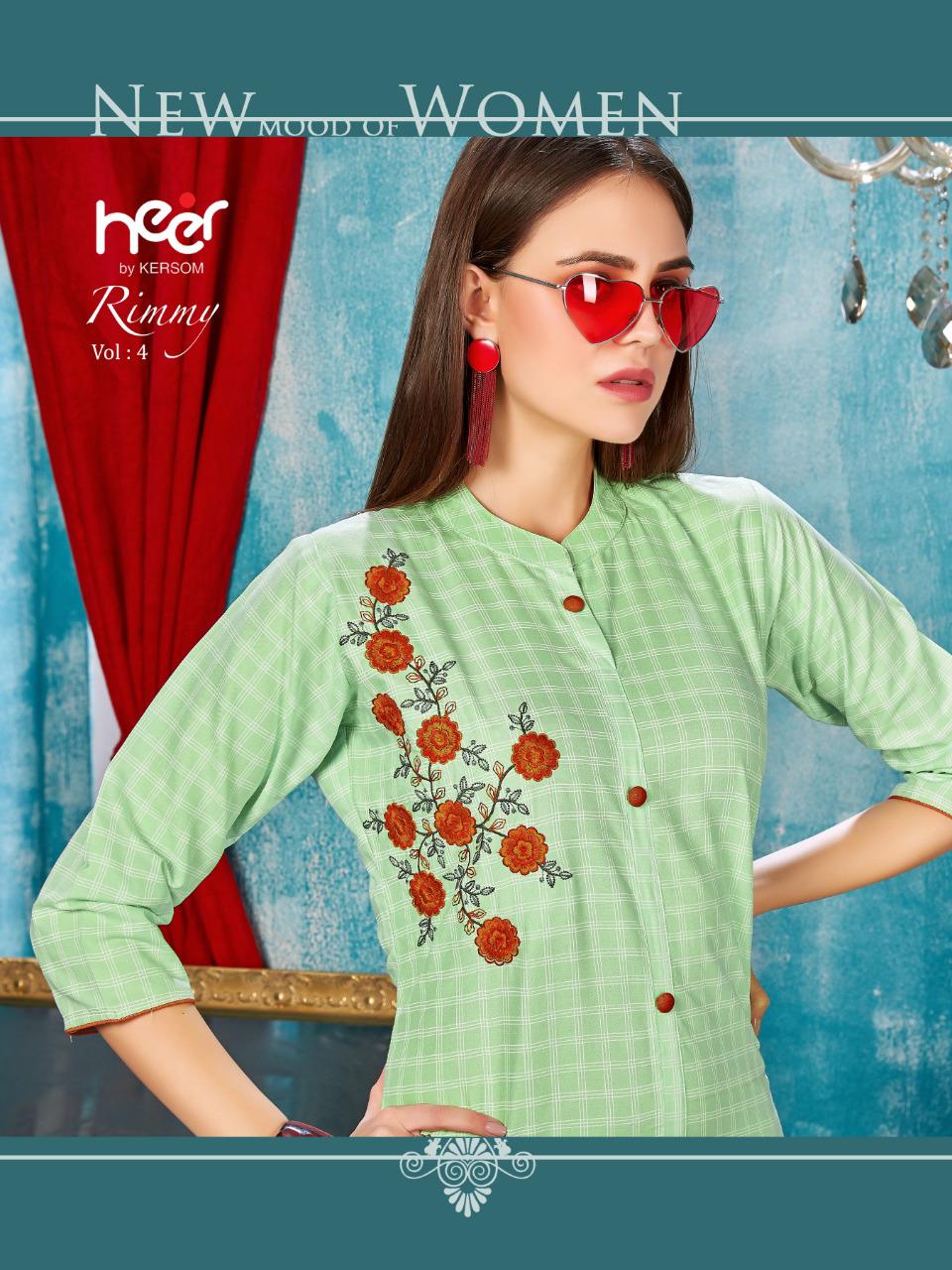 Kersom Heer Launch Rimmy Vol 4 Rayon Checks Work Concept Kurti At Lowest Rate