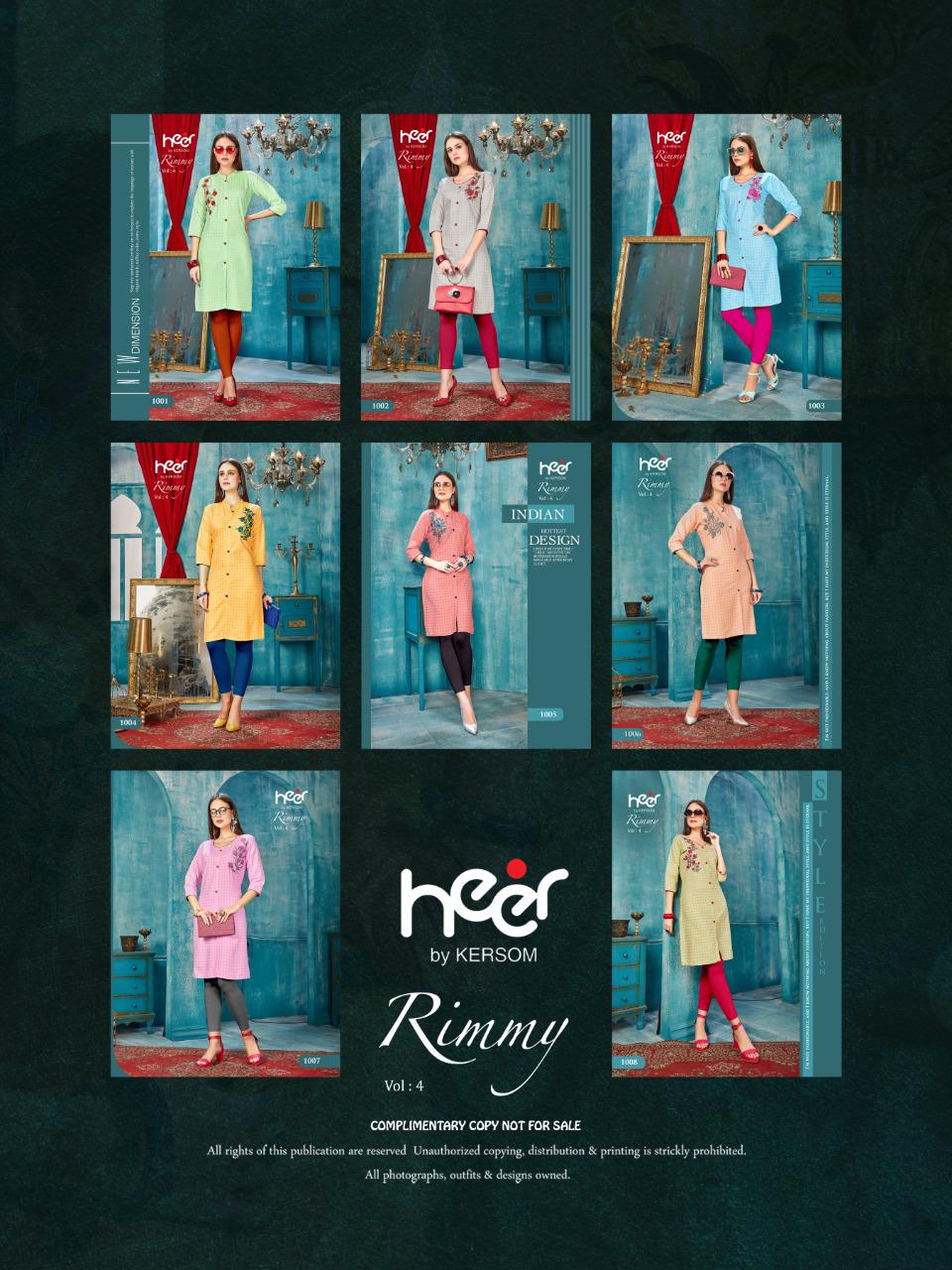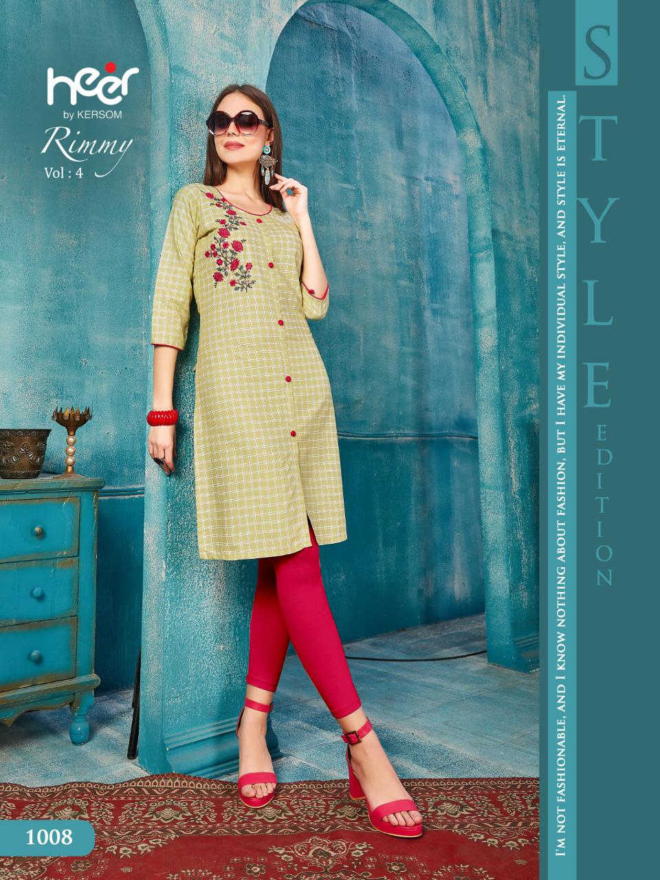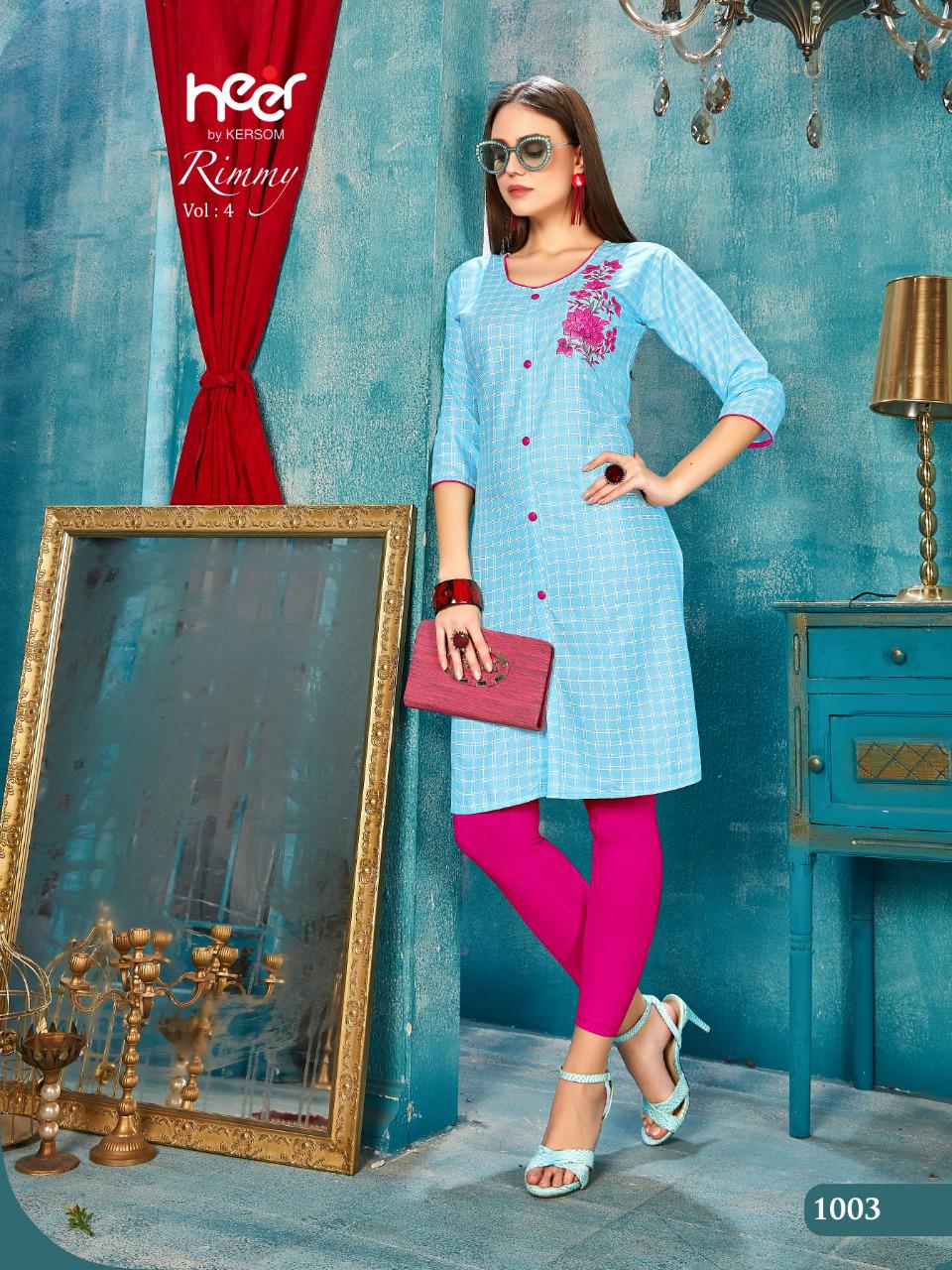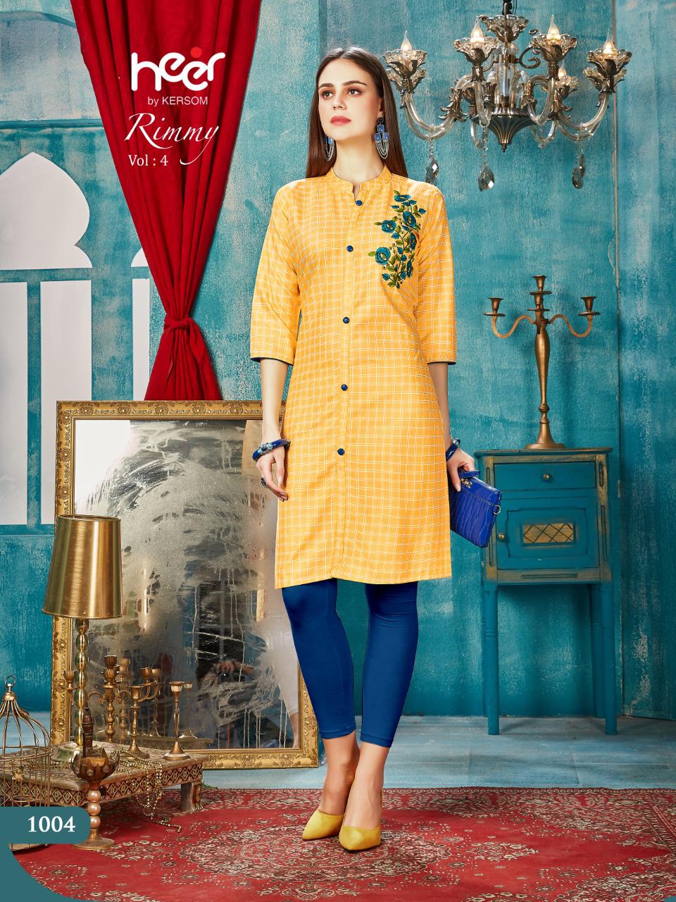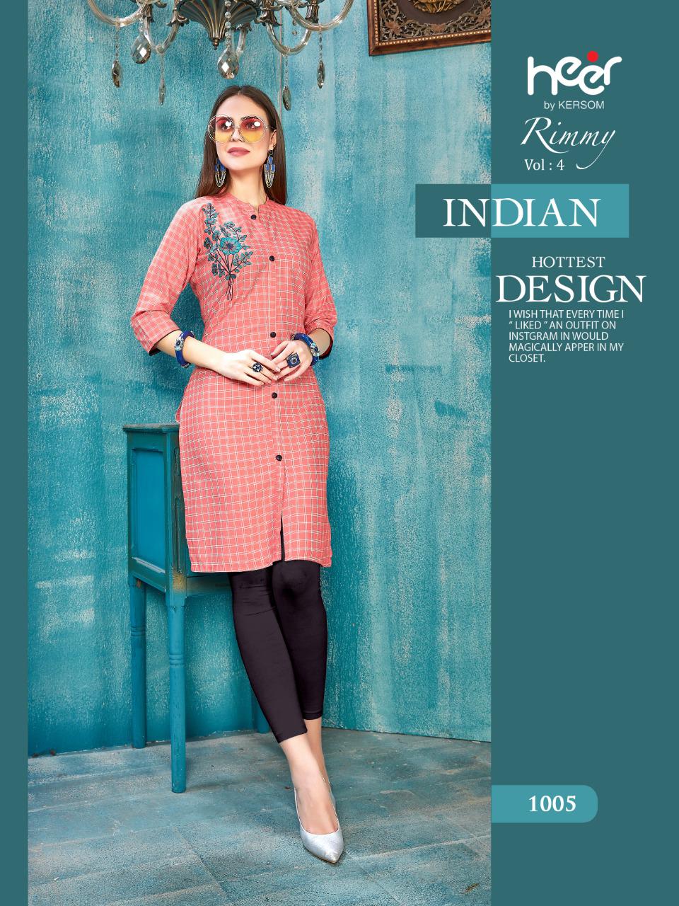 Kersom Heer Launch Rimmy Vol 4 Rayon Checks Work Concept Kurti At Lowest Rate