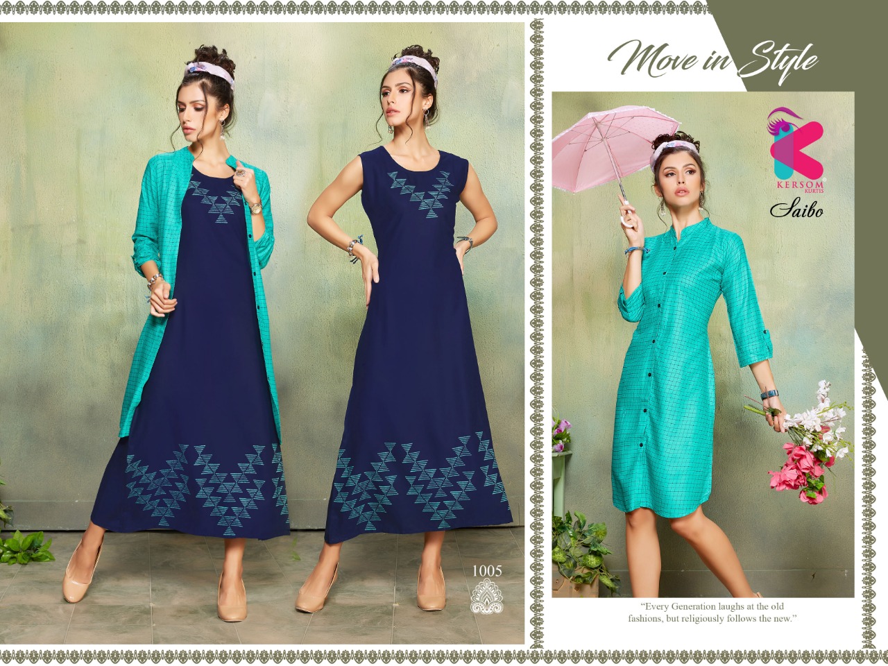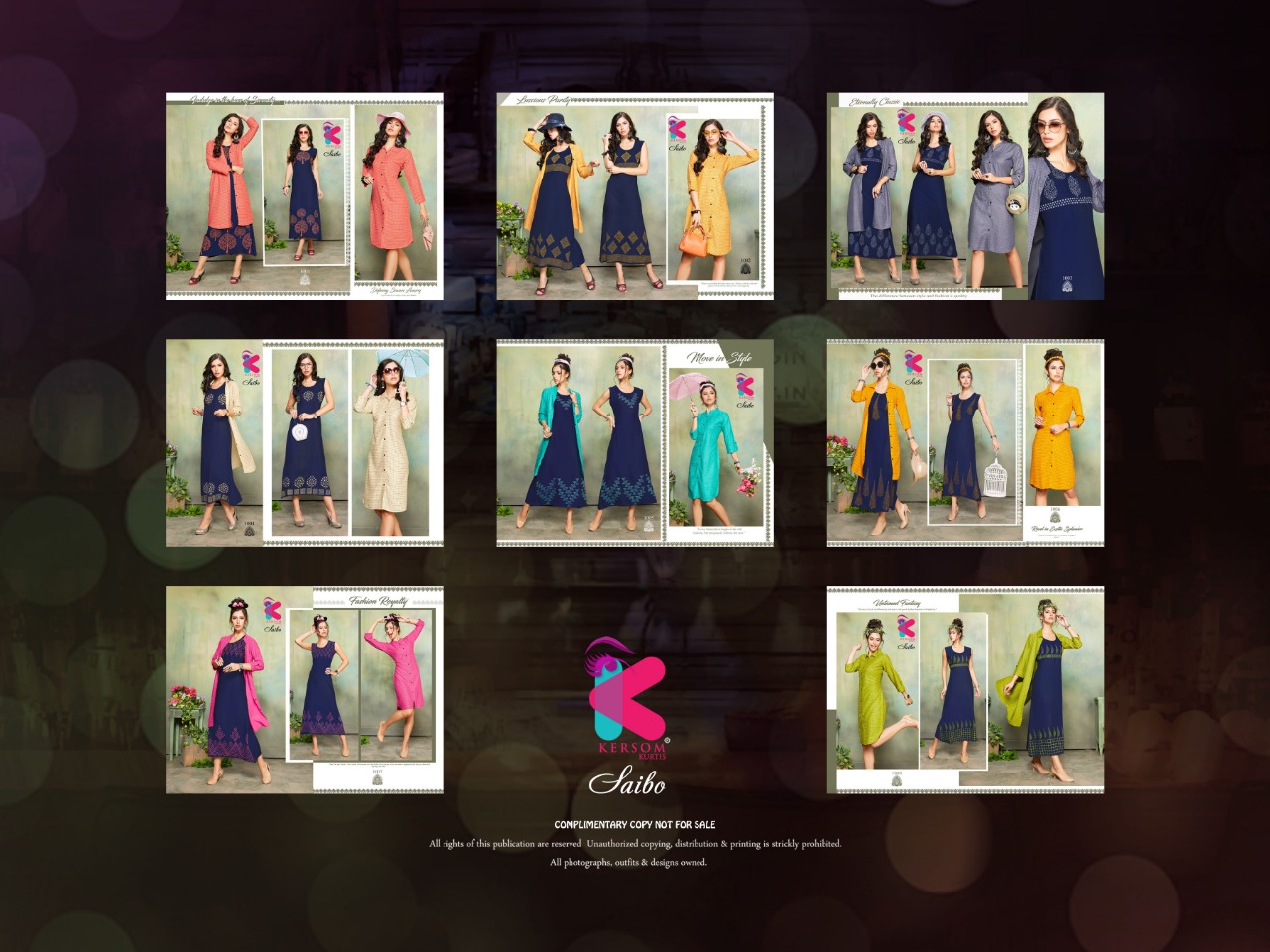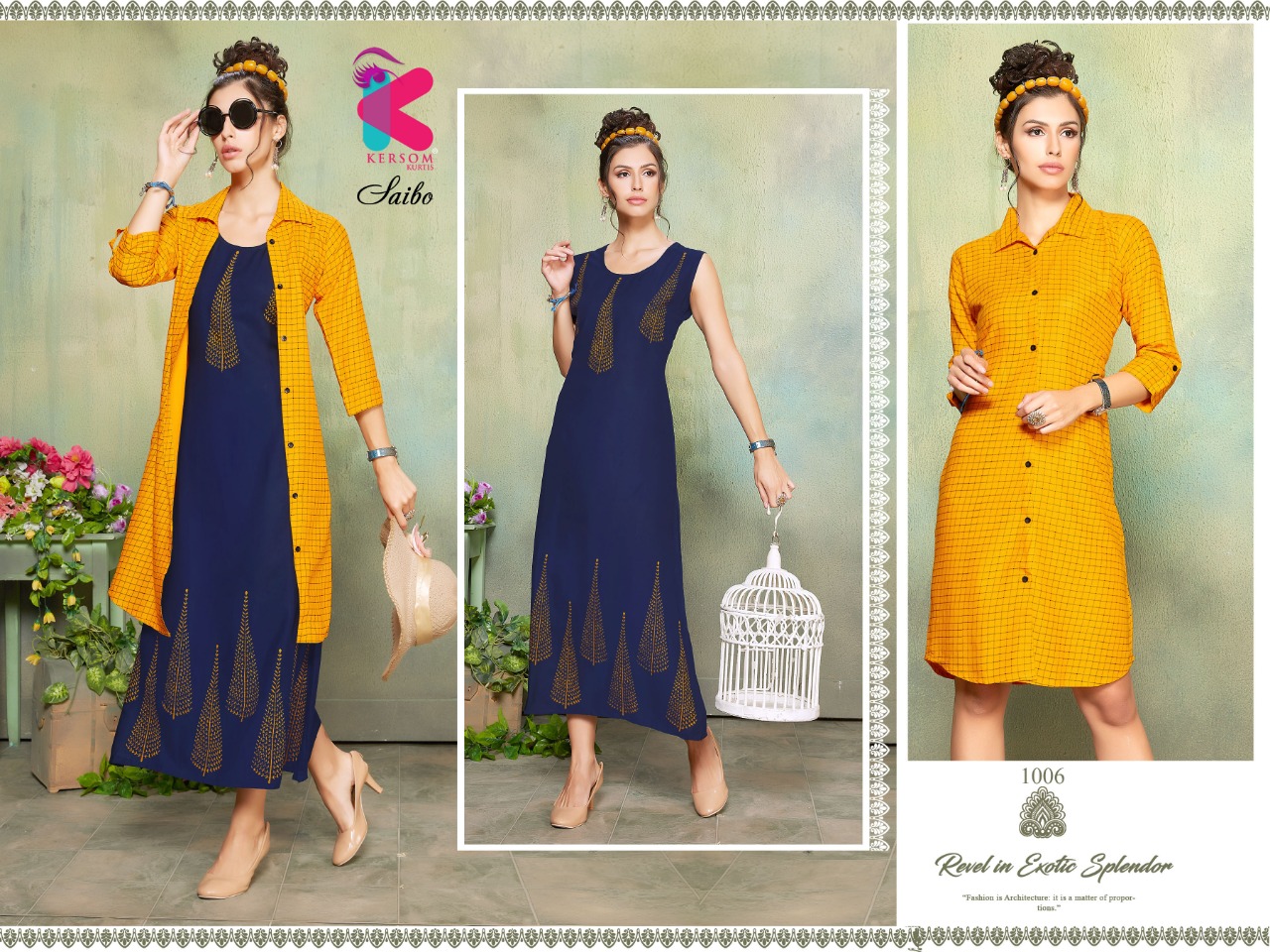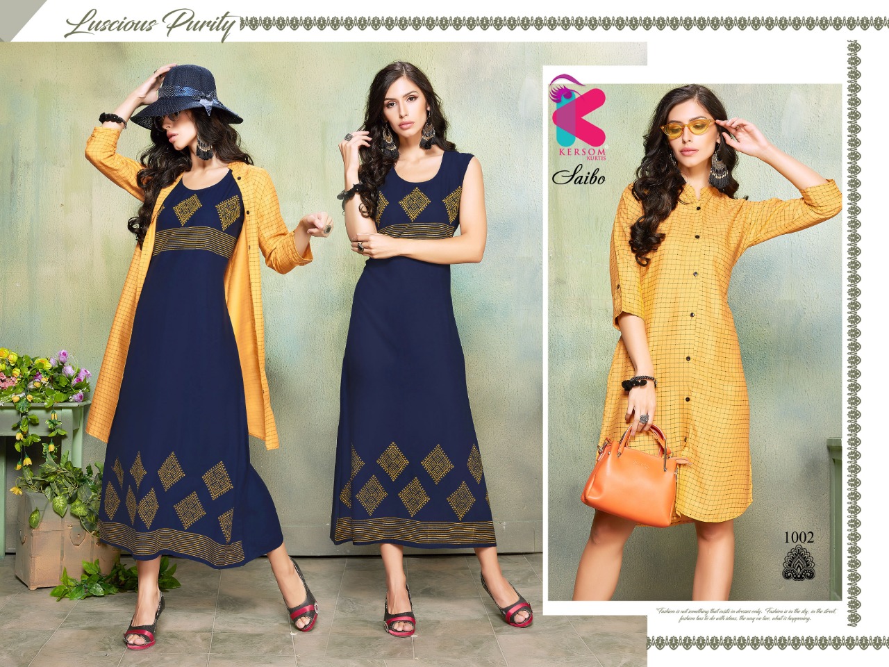Welcome to KERSOM (KURTI) .., We are introducing KERSOM S new catalog Catalogue:- SAIBO cloth :- HEAVY RAYON 3 IN 1 CONCEPT â concept :-plain and print concept with stiching pattern Length :- 46âÂÂMINIMUM Size:- M,L,XL,XXL AVAILABLE 8 DESIGNS CATALOGUE Rate. : 630/- |