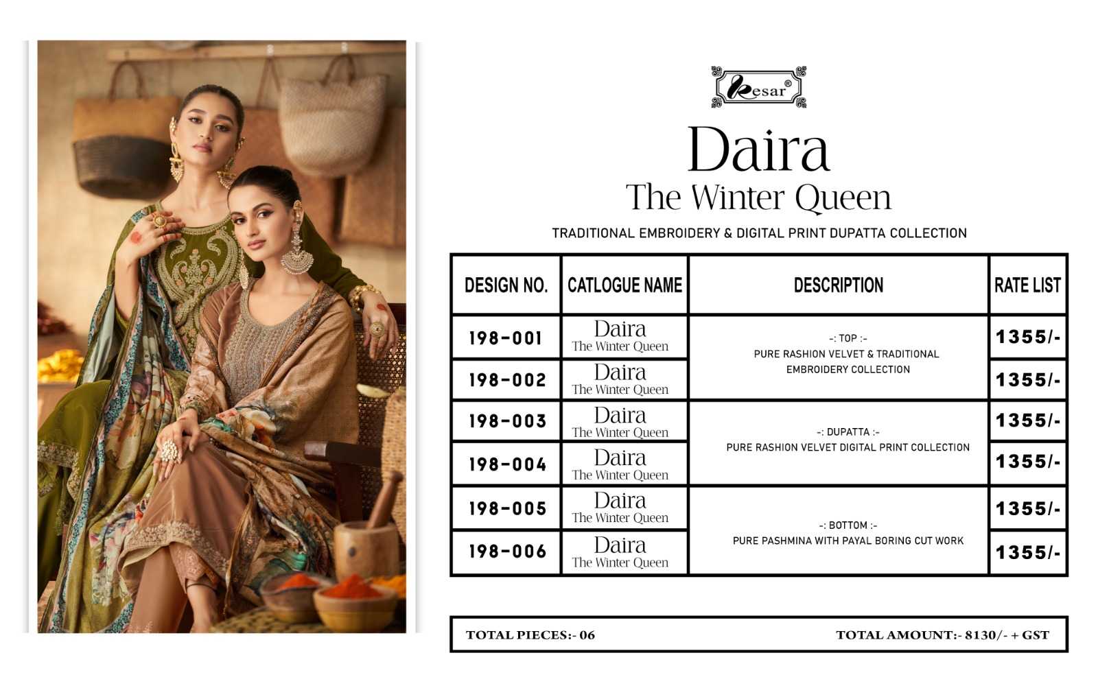 🔥🔥🔥🔥 DAIRA.... 🔴 Fabrics details🔴 👗*Top:- PURE RASHION VELVET & TRADITIONAL EMBROIDERY COLLECTION 🇮🇳*Dupatta: - PURE RASHION VELVET DIGITAL PRINT COLLECTION 👖*Bottom: -PURE PASHMINA WITH PAYAL BORING CUT WORK 💰*Pricex:- ₹1️⃣3️⃣5️⃣5️⃣/- 📦Designes:-6 Pcs Delivery soon 🔔 🔔 🔔 🔔 🔔 🔔 🔔 🔔 🔔 🔔 🔔 Confirm now |