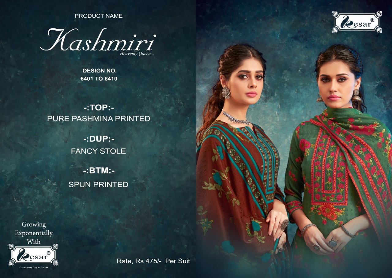 KESAR Presents KASHMIRI * 10 Blossom Dresses* Fabric Details:- â• Top:- Pure pashmina DOBBY Digital Print * *Cut-2.50mtr â• Bottom:-Pure SPAN PASHMINA PRINT Cut:- 3 mtr â• Dupatta:- PURE PASHMINA STALL DIGITAL PRINT WITH 2 SIDE PIKU DUPATA Dress :- Pcs Set Rate:- 4⃣7⃣5⃣+ 5⃣%GST PRIMIUM WINTER CATALOGUE COLLECTION |