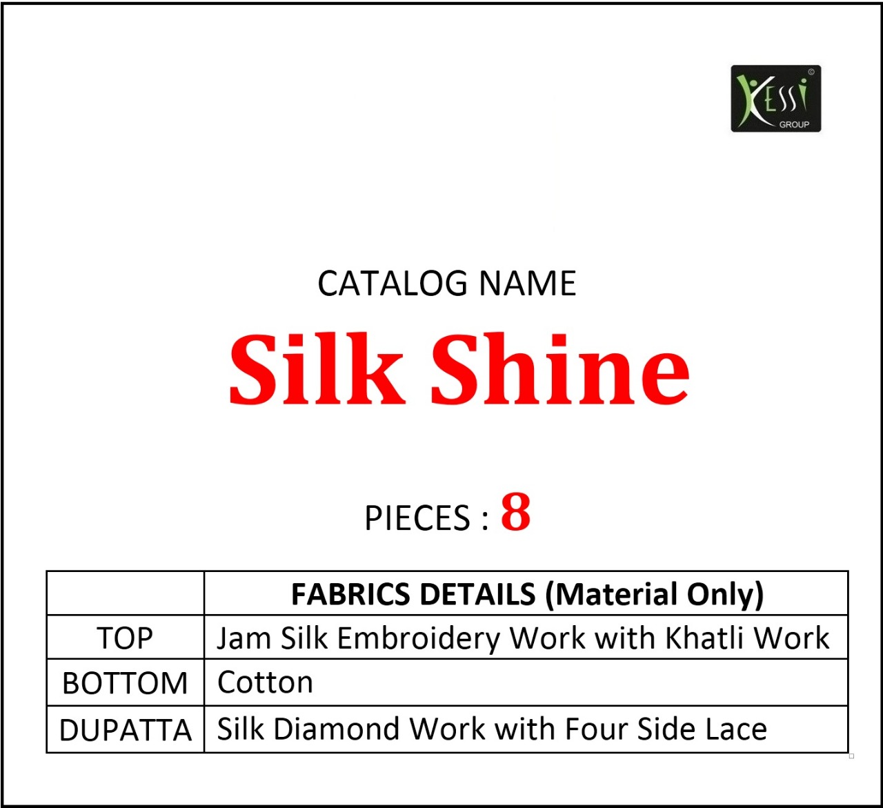 Kessi Fabrics Pvt. Ltd. has launched Catalog name : Silk Shine Fabric Details âªTop:- Jam Satin Embroidery Work with Khatli Work âªBottom:- Cotton âªDupatta:- Silk Diamond Work with Four Side Less âªTotal Design:- 8 Rate ~ 899/-â¹ â°Dispatching 5 to 6 days later Booking started from now... Order yours soon... |