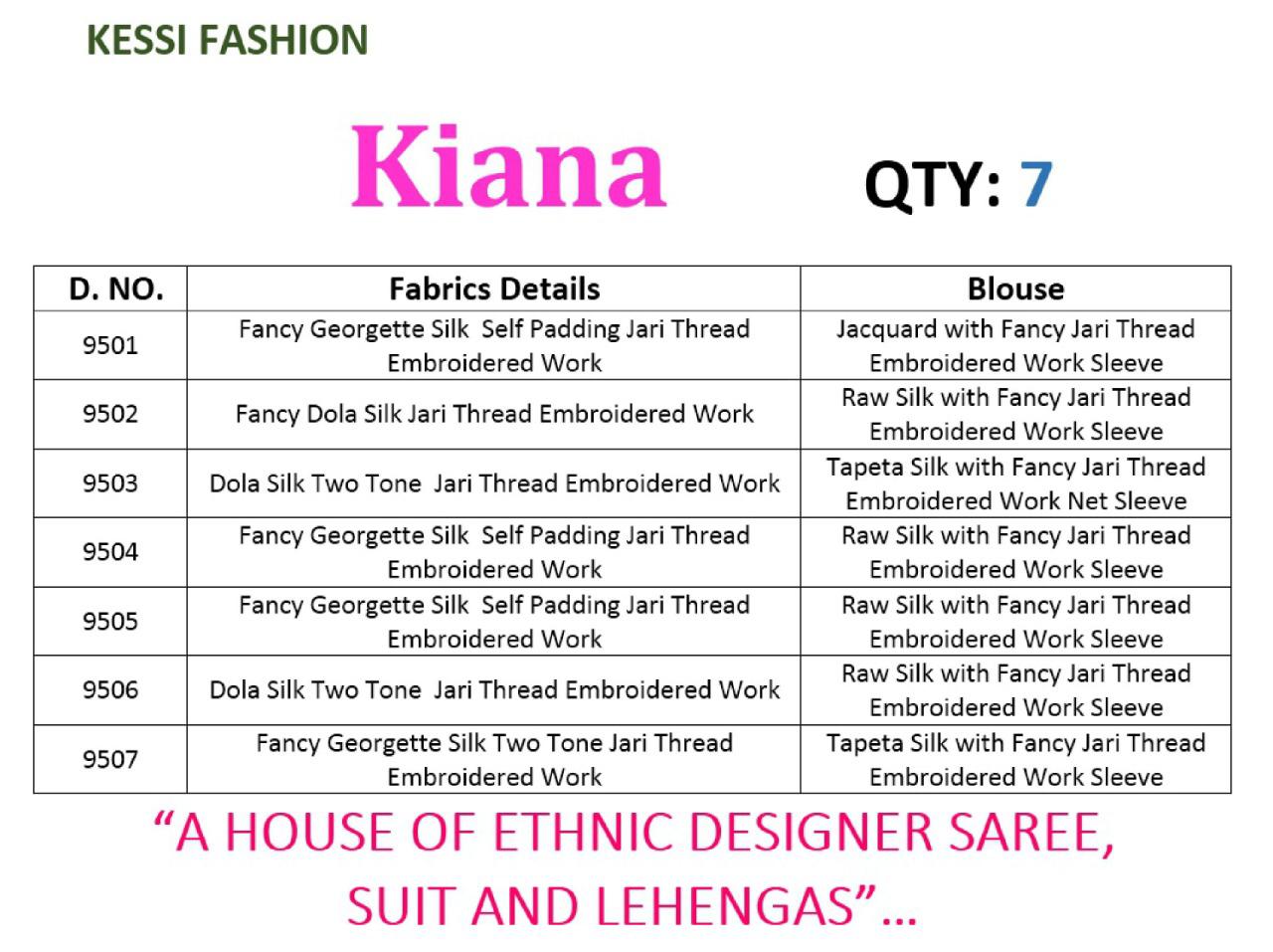 Brand - Kessi . Type - Saree. Catlog name - KIANA . Series - 9501 to 9508 Rate - 1399 per Pcs . GST 5 Percent Extra. Delivery from tomorrow |