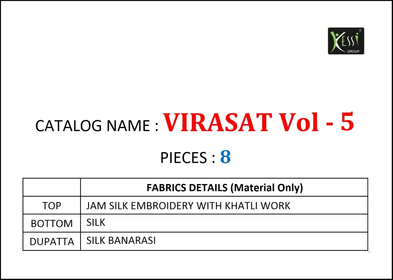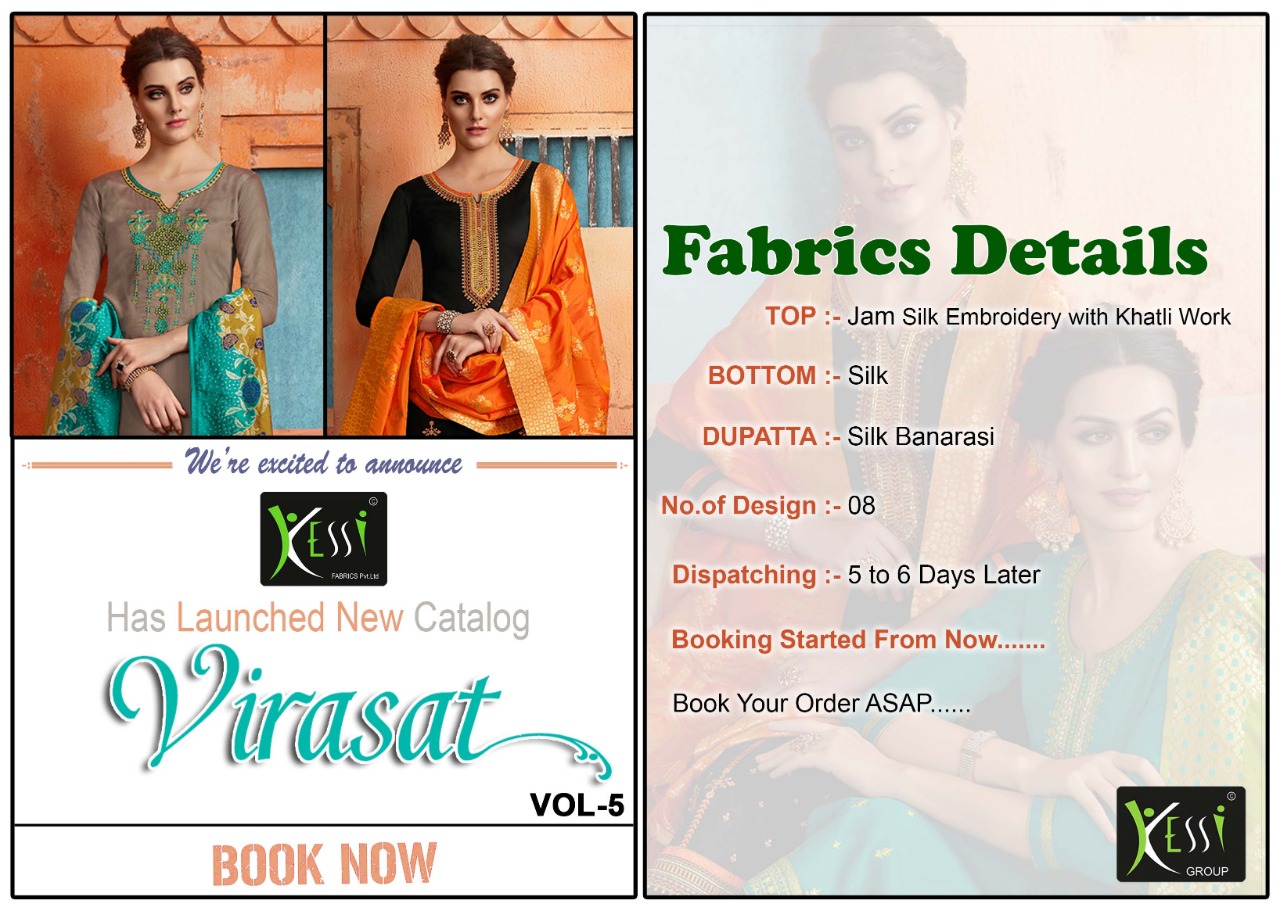 Kessi Fabrics Pvt. Ltd. has launched Catalog name : Virasat Vol - 5 Fabric Details âªTop:- Jam silk Embroidery with Khatli Work âªBottom:- Silk âªDupatta:- Silk Banarasi âªTotal Design:- 8 Rate - 1099/- â°Dispatching 5 to 6 days later Booking started from now... Order yours soon.... |