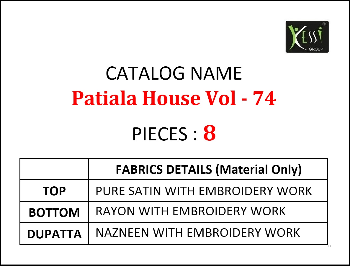Kessi Fabrics Pvt. Ltd. has launched Catalog name : Patiala House Vol - 74 Fabric Details âªTop:- PURE SATIN WITH EMBROIDERY WORK âªBottom:- RAYON WITH EMBROIDERY WORK âªDupatta:- NAZNEEN WITH WORK âªTotal Design:- 8 RATE - 799/- â°Dispatching 5 to 6 days later |