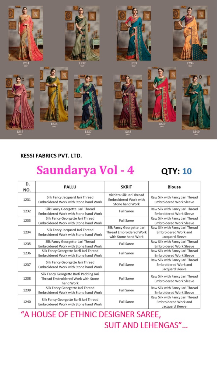Brand - Kessi . Type - saree. Catlog Name - SAUNDARYA VOL -4. Rate -1399 per pcs . St to set . GST 5 Percent Extra. Delivery from tomorrow |