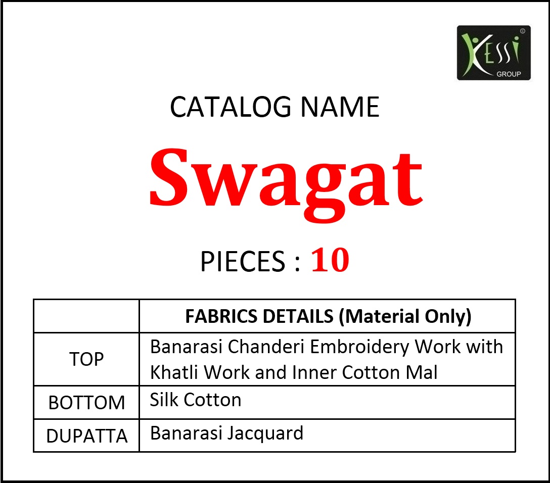 Kessi Fabrics Pvt. Ltd. has launched Catalog name : Swagat Fabric Details âªTop:- Banarasi Chanderi Embroidery Work with Khatli Work and Inner Cotton Mal âªBottom:- Pure Cotton âªDupatta:- Banarasi Silk Jacquard âªTotal Design:- 10 Rate - 899/- â°Dispatching 5 to 6 days later Booking started from now... Order yours soon.... |