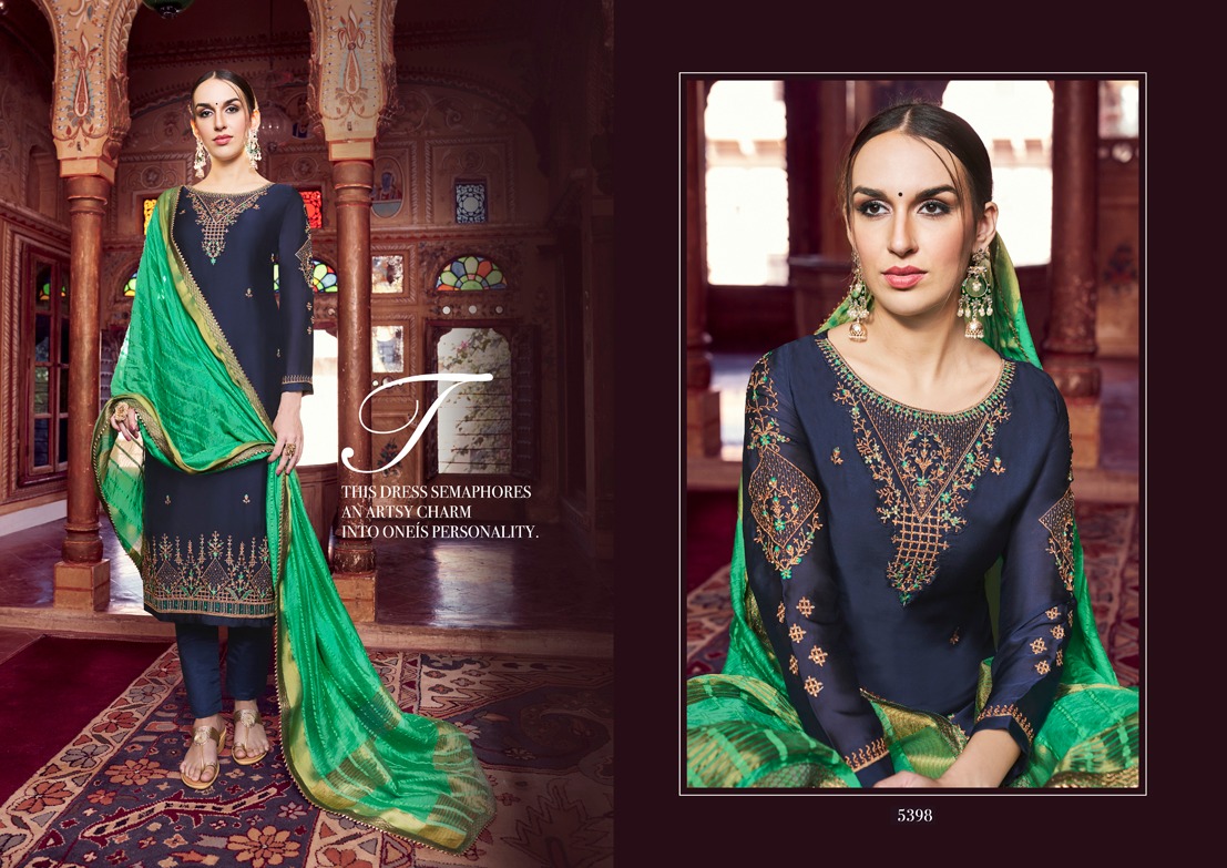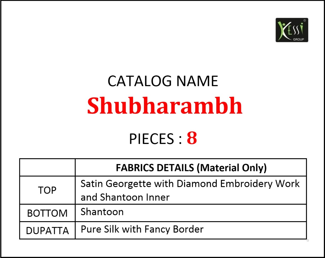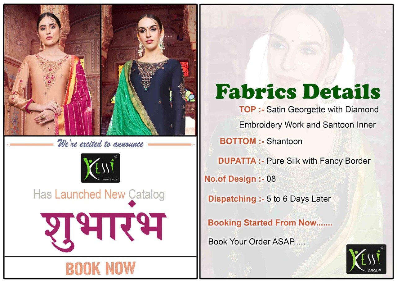 Kessi Fabrics Pvt. Ltd. has launched Catalog name : Shubharambh Fabric Details âªTop:- Satin Georgette with Diamond Embroidery Work and Shantoon Inner âªBottom:- Shantoon âªDupatta:- Pure Silk with Fancy Border âªTotal Design:- 8 â« RATE - 999/- â°Dispatching 5 to 6 days later Booking started from now... Order yours soon.... |