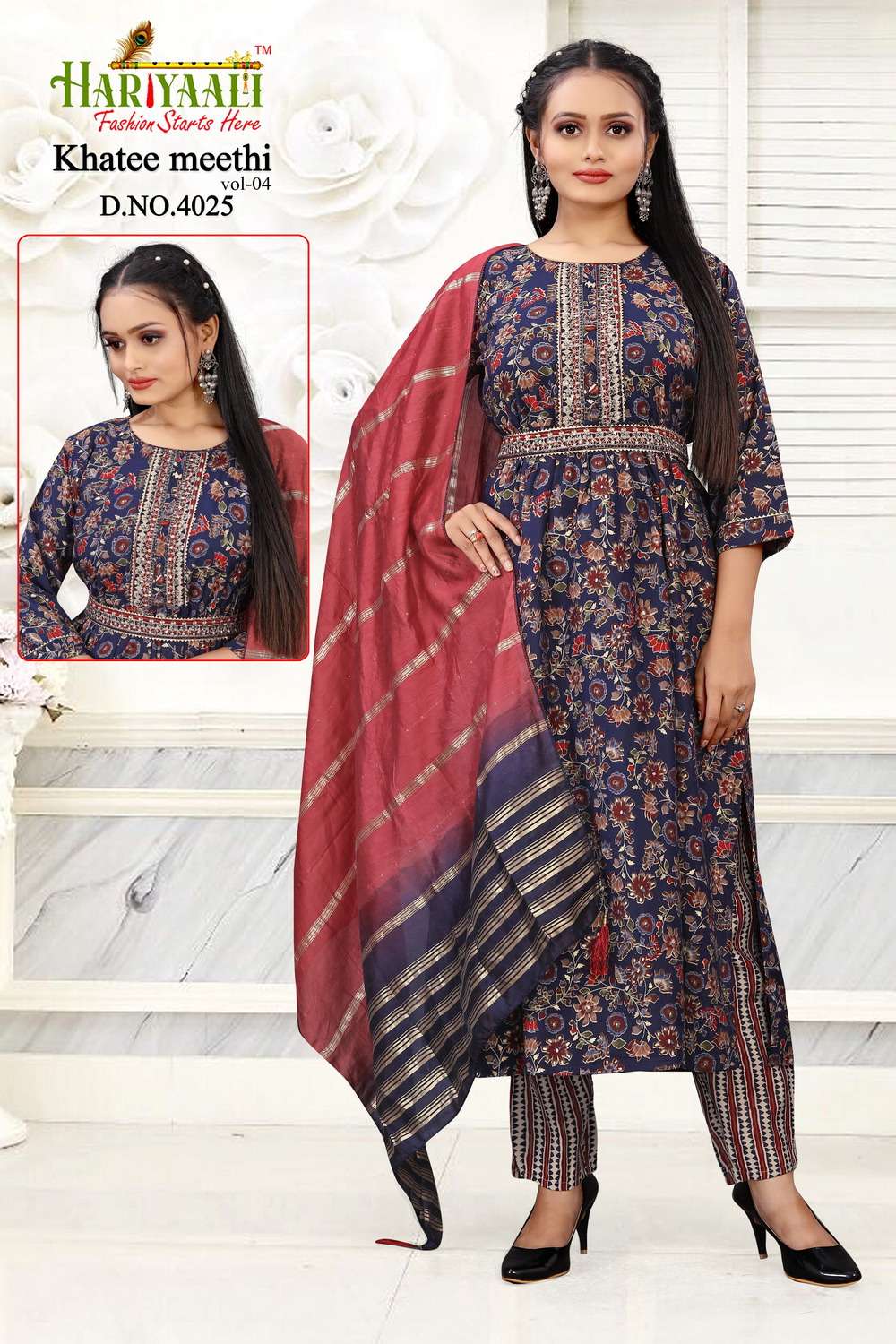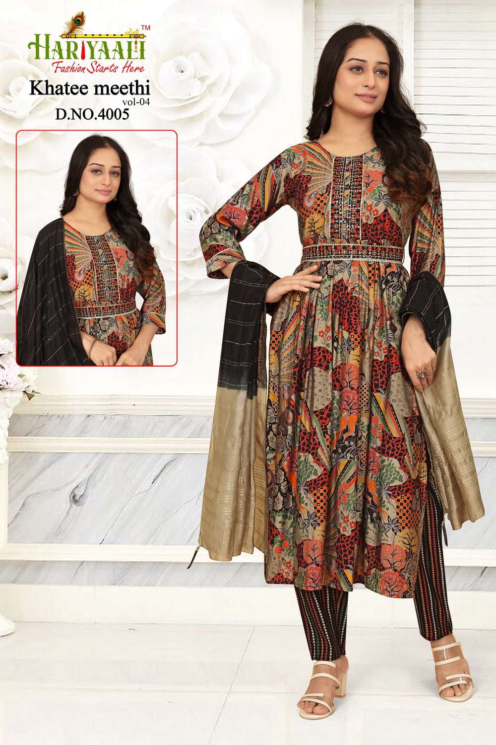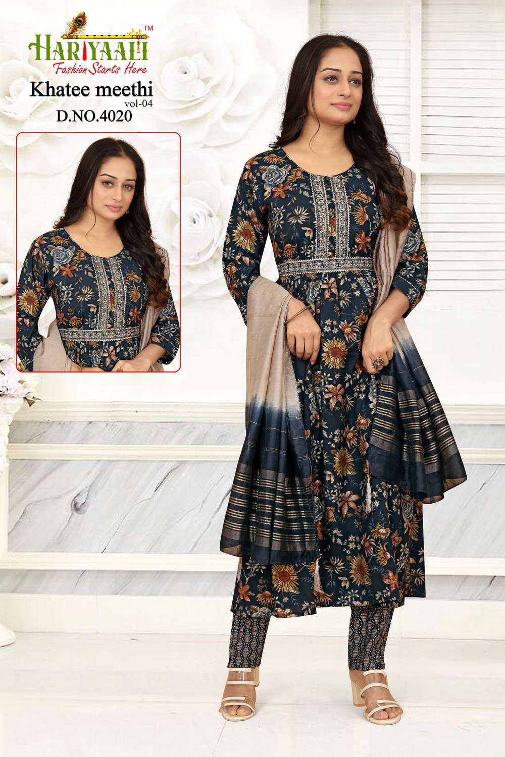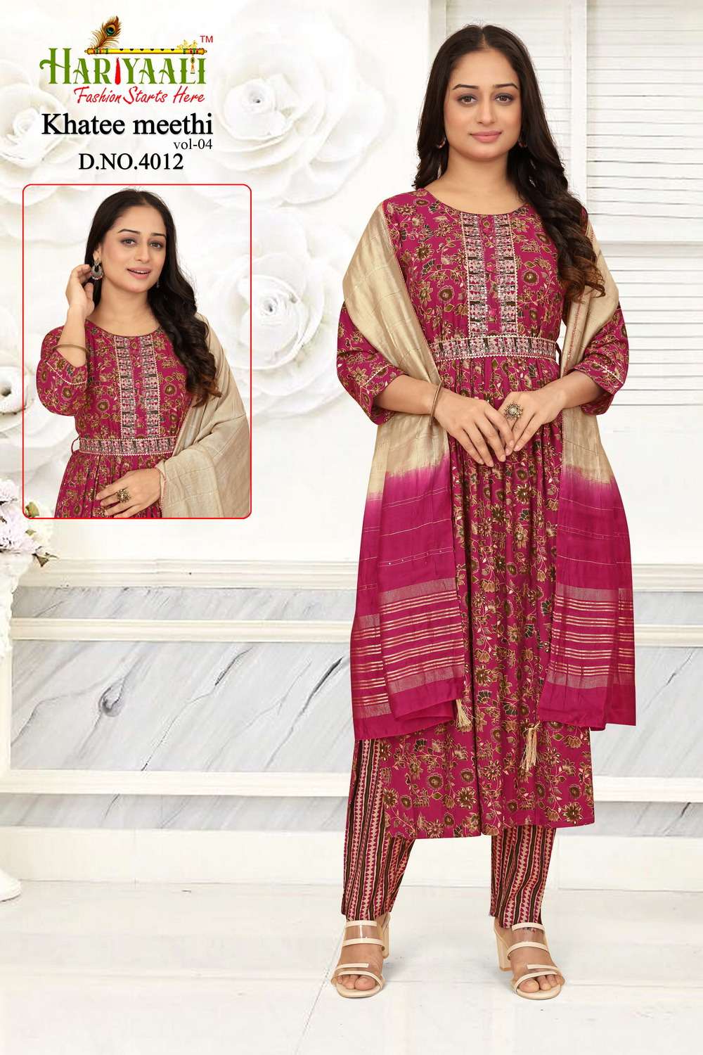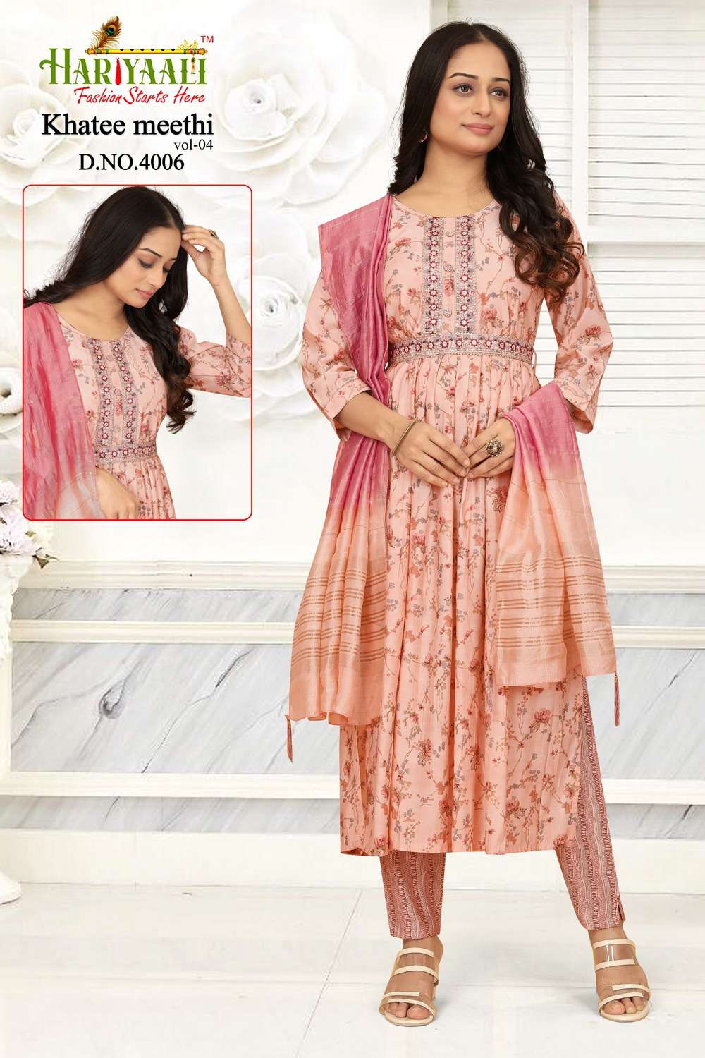 khatee meethi vol 4 by hariyaali readymade nayra cut salwar kameez combo set