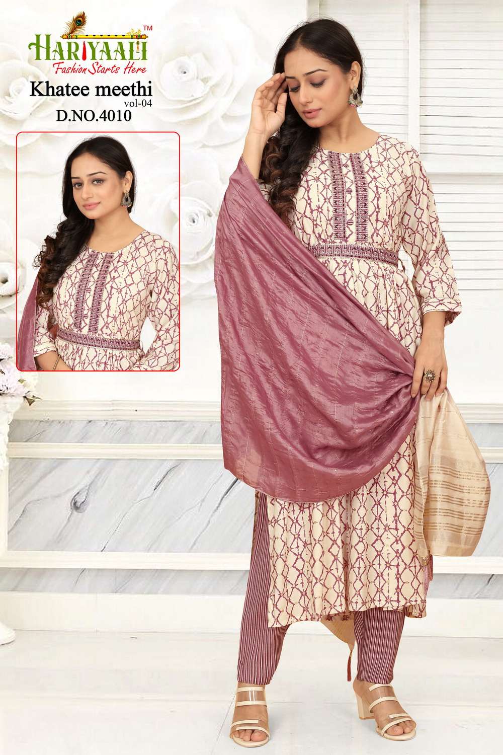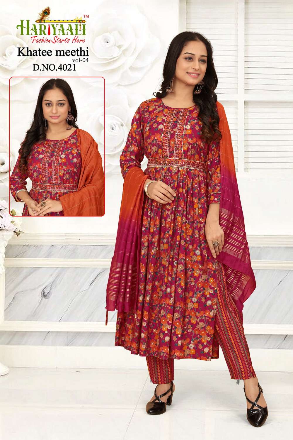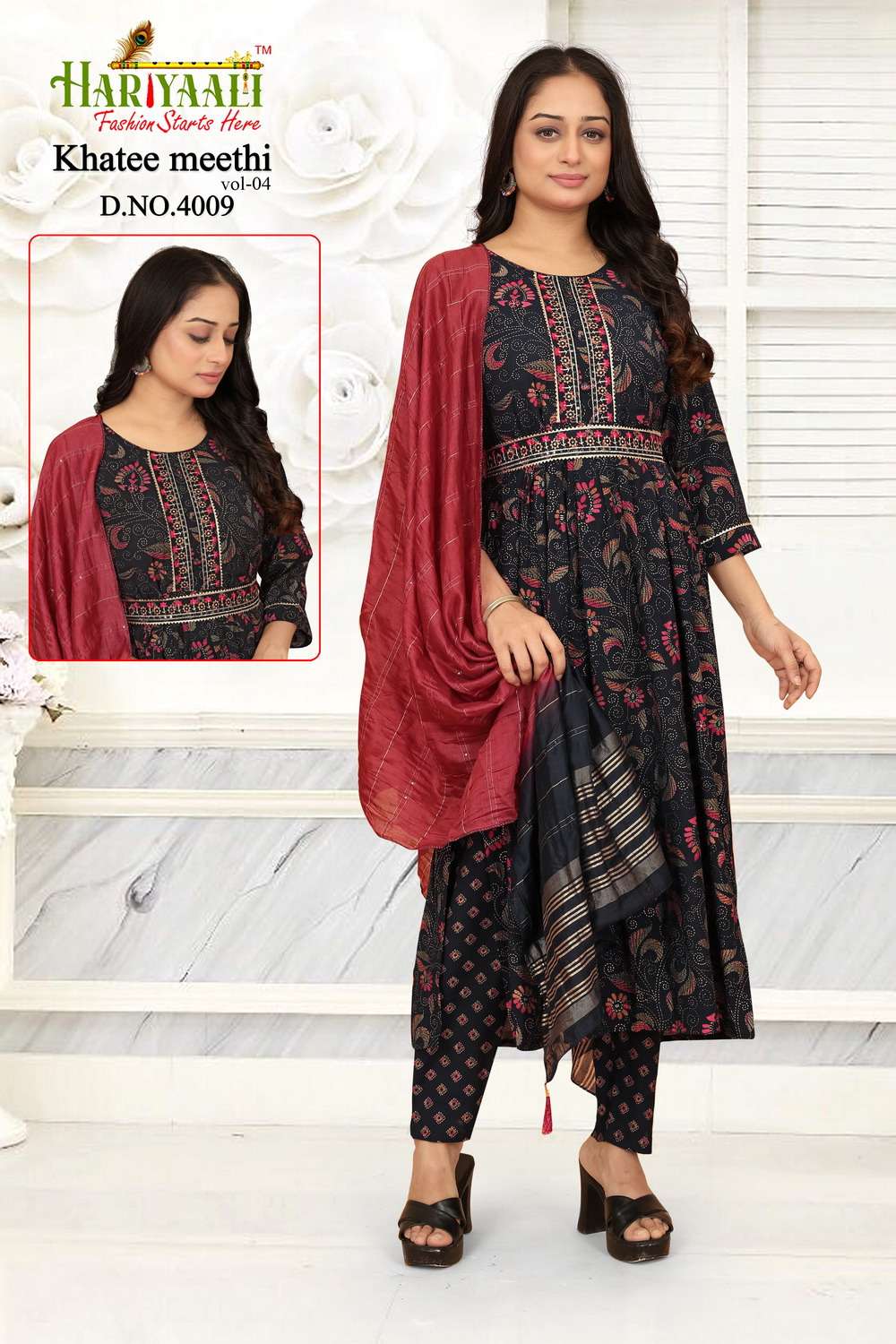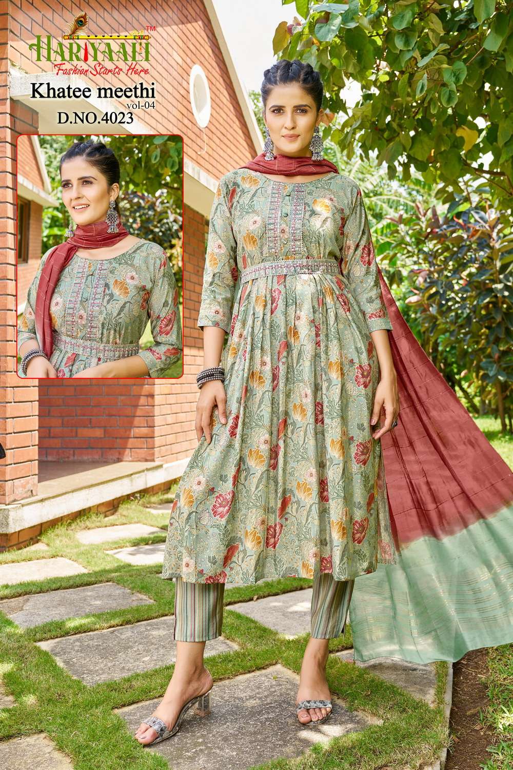 khatee meethi vol 4 by hariyaali readymade nayra cut salwar kameez combo set