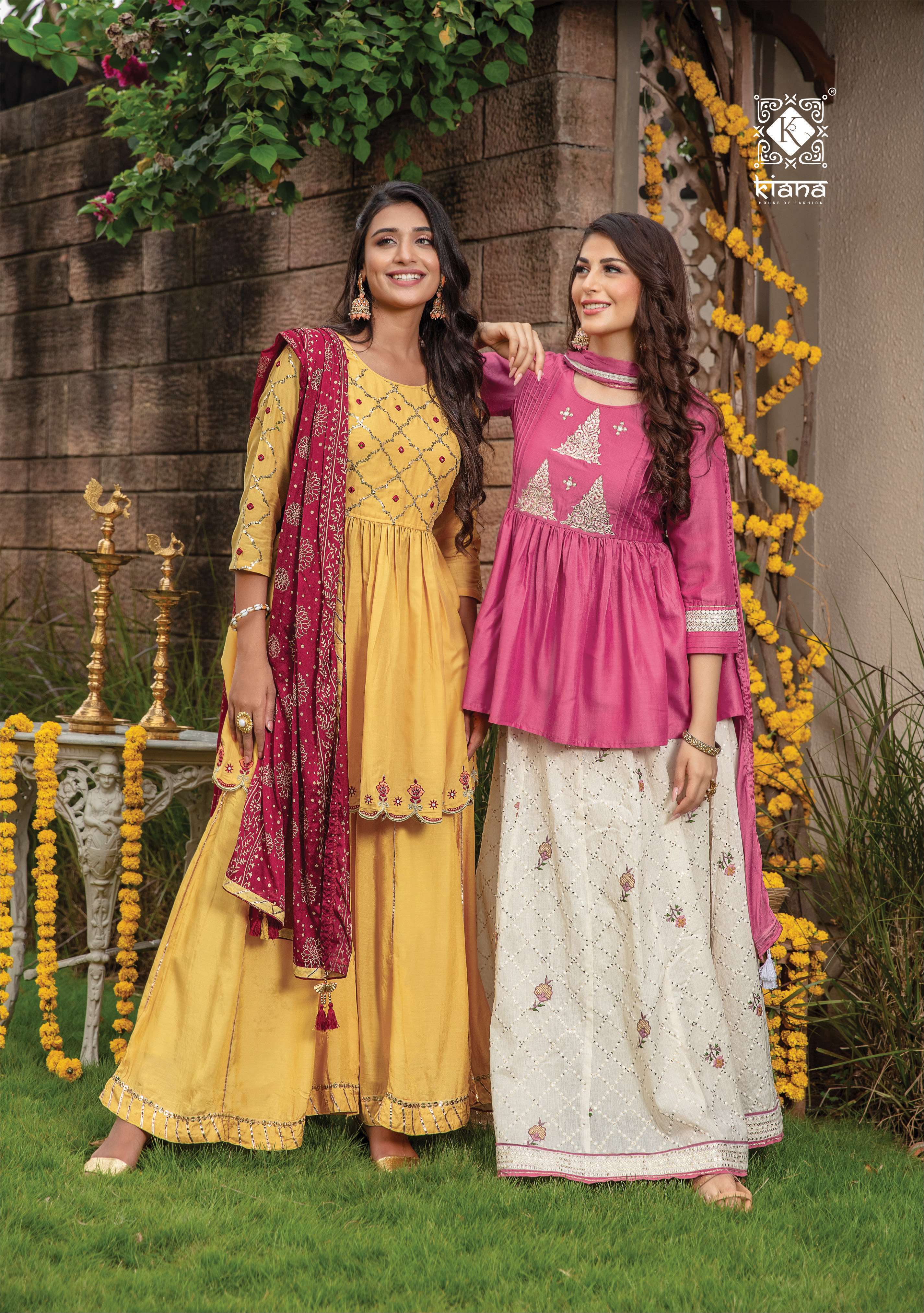 The Test of Premium Collection 👑Kiana ®️👑 👗Catalogue Name- 👗 TOP :- Muslin & georgette Fabric, Sequence work and Lukhnowi work, Dori work, Khatli work Bottom :- Muslin and Georgette Fabric, Garara Sharara, Skirt, Floor length gown, Plazzo 🎗Size :- M(19) L(20) XL(21) XXL(22), 3xl(23) 🎗️ Desgin :- 6 pcs |