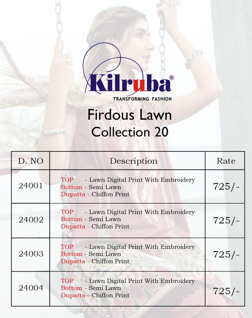After success of our previous designs, today KILRUBA is launching exclusive pakistani Lawn Catalogue Firdaus lawn collection 20 Fabric details Top : Lawn Digital Print with embroidery patch Bottom : Heavy Semi Lawn Dupatta : Chiffon Digital Price : 725/- (5% gst extra) â¤4 pcs set |