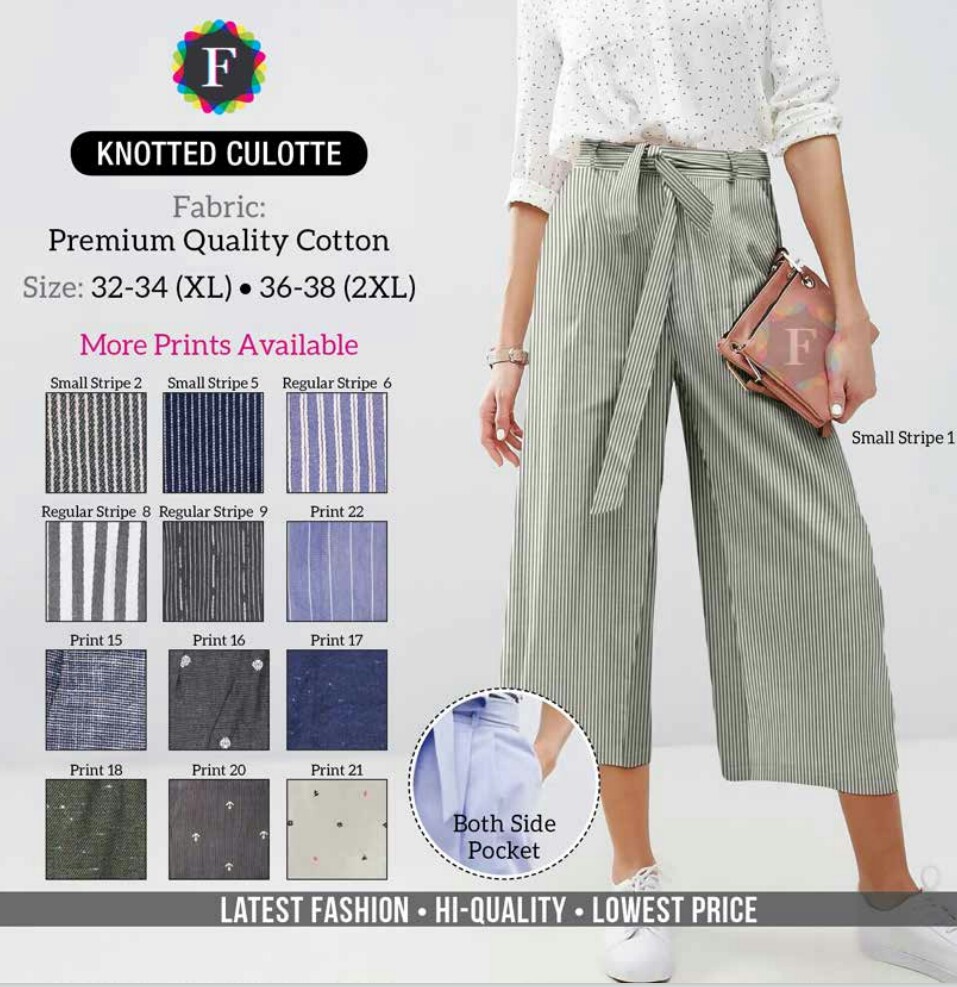 KNOTTED CULOTTE Fabric: Premium Quality Cotton Style: Ethnic & Western Length: 32" USP: Full Length Knotted Waist Belt Size: 32-34 (XL) • 36-38 (XXL) Available in 18 colours wholesale price ₹350/- GST 5% EXTRA Happy Selling |
