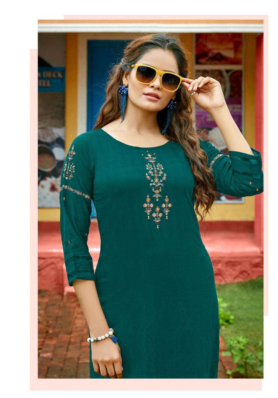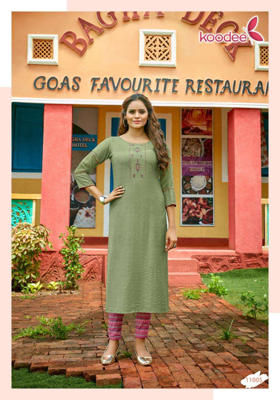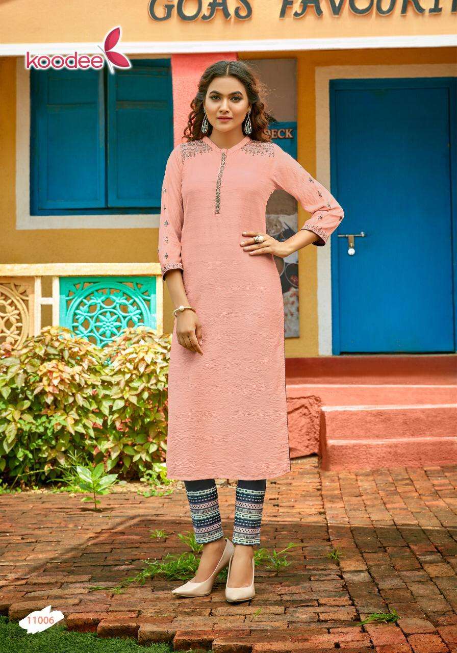 After Great Success of all last Series Of Kurti Pant, today We are Launching New Catalog Kashvi Vol 1... Kurti With Digital Print Pant Brand Name : KOODEE Catalog : Kashvi-1 Designs : 6 Fabric:- Top :- Fancy Nylon viscose Bottom :- Cotton Slub Lycra With Digital Print Pant Work: Embroidery & Khatli Work Size : S(36),M(38), L(40), XL(42), 2XL(44), 3XL(46)  Rate :- 845/- Set to set. Delivery from today⦠|