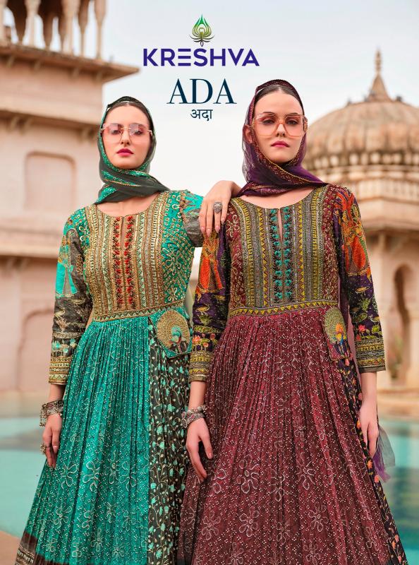 Brand – Kreshva Catalog: Ada(Gown With Dupatta) Fabric Details :Smooth Silk With Foil Print & Heavy Work Readymade Size-38 Dupatta : Net Fabric With 4 Side Foil Print Lace Rate : Attached+12 %Gst Occasion : Wedding Wear, Reception Wear,Party Wear |