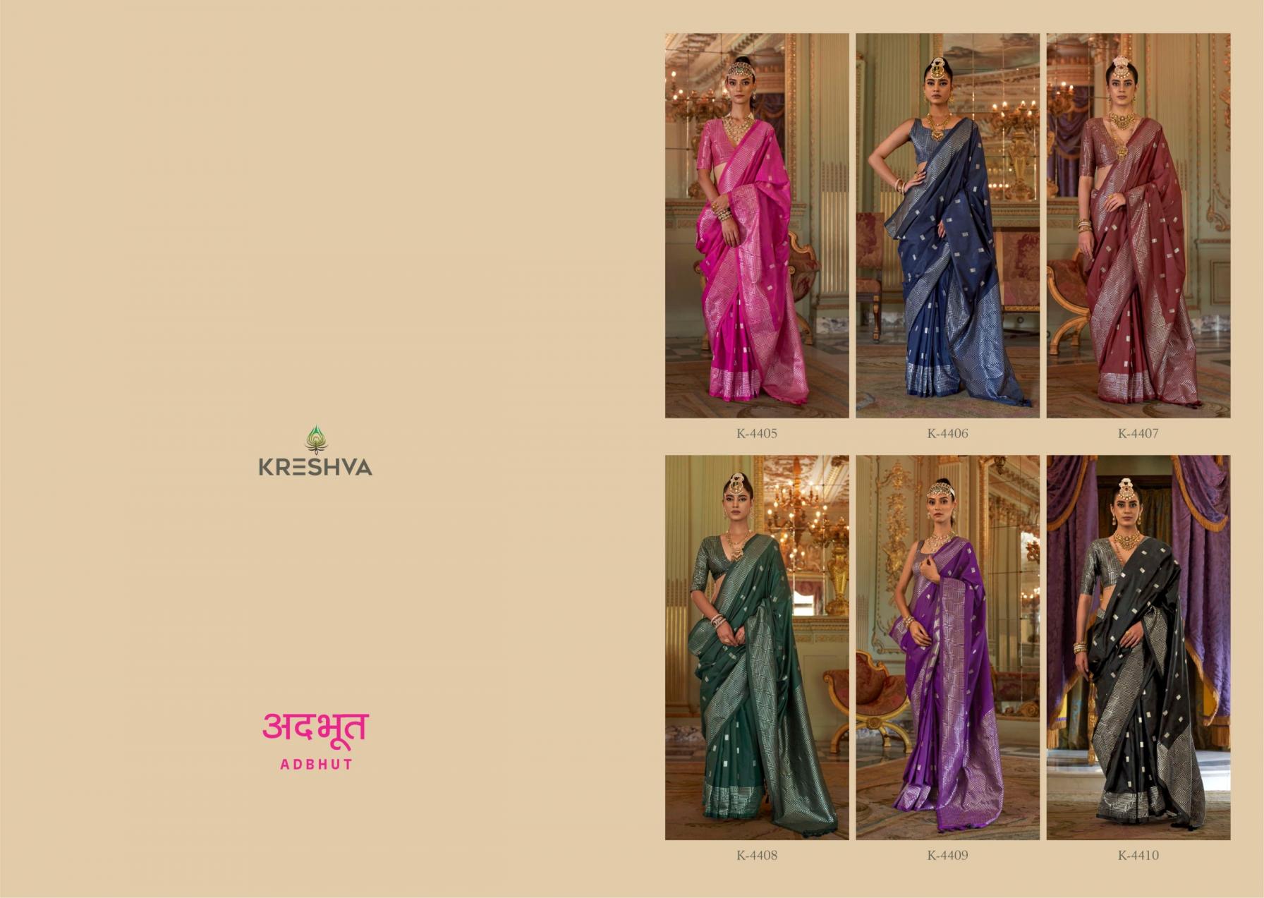Discover ADBHUT by KRESHVA — where every weave speaks royal elegance,A collection crafted to make every moment unforgettable. Brand Name: Kreshva Catalog Name: Adbhut Series : 4405 TO 4410 Price: 1295/- +5%Gst Saree Fabric : P.V.Super Fine Soft Silk With Double Zari Weaving With Hand Deco Finish Blouse : P.V. Silk Occasion: Party Wear, Festival Wear |