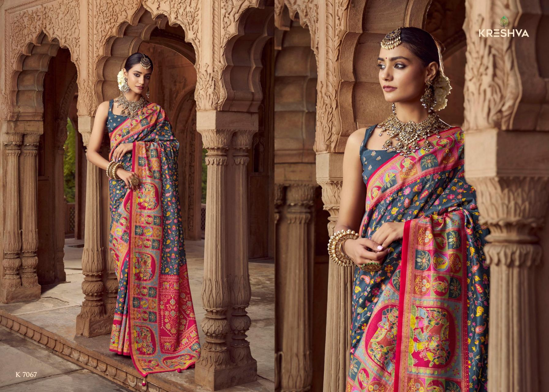 Wrap yourself in elegance with this exquisite Pashmina Print Saree, where tradition meets contemporary style Crafted from soft, breathable fabric inspired by the richness of Pashmina, this saree features intricate traditional prints that radiate grace and sophistication. Brand : Kreshva Catalog Name : Chakori Saree Fabric : High Quality Super 8001 P.V Silk With H.B. Pashmina inspired Luxury Print With Glory Finish Blouse Fabric : Super 8001 P.V Occasion : Party Wear, Festival Wear |