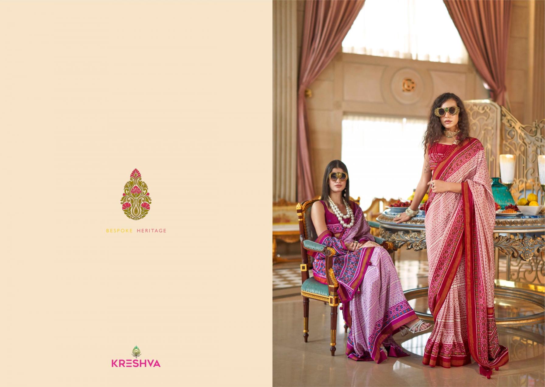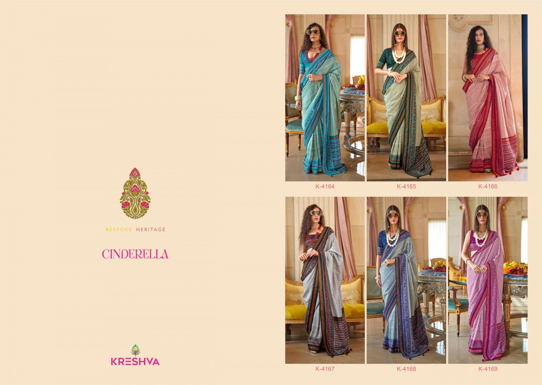 Brand Name: Kreshva Catalog Name: Cinderella Series: 4164 To 4169 Price: 1195/- +5%Gst Saree Fabric: High Quality Double Ikkat Super 8001 P.V Silk With No Foil Foil Look H.B. Signature Print With Radiant Finish Blouse : Super 8001 P.V Silk Occasion: Festival Wear,Party Wear |