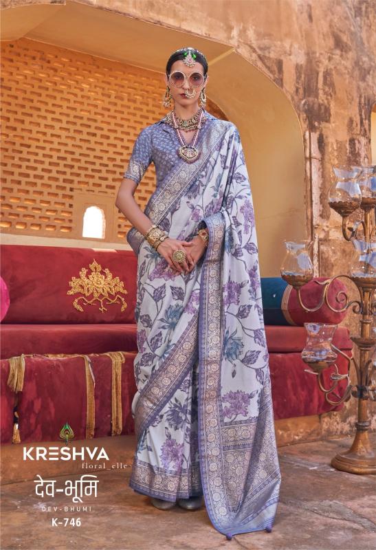 This Floral Print Saree Is A Masterpiece Of Traditional Craftsmanship, Combining Beauty, Elegance, And Sophistication To Create A Truly Stunning Garment Is A Masterpiece Of Traditional Craftsmanship Combined With Modern Technology, Making It A Truly Stunning And Unique Piece Brand : Kreshva Catalog Name : Dev-Bhumi Series : 737 to 746 Rate:1695/-+5%GST Fabric: Super Pv Silk With Hb Smart Floral Print Xo Palu And Border Blouse: Super Pv Silk Occasion: Party Wear, Festive Wear |
