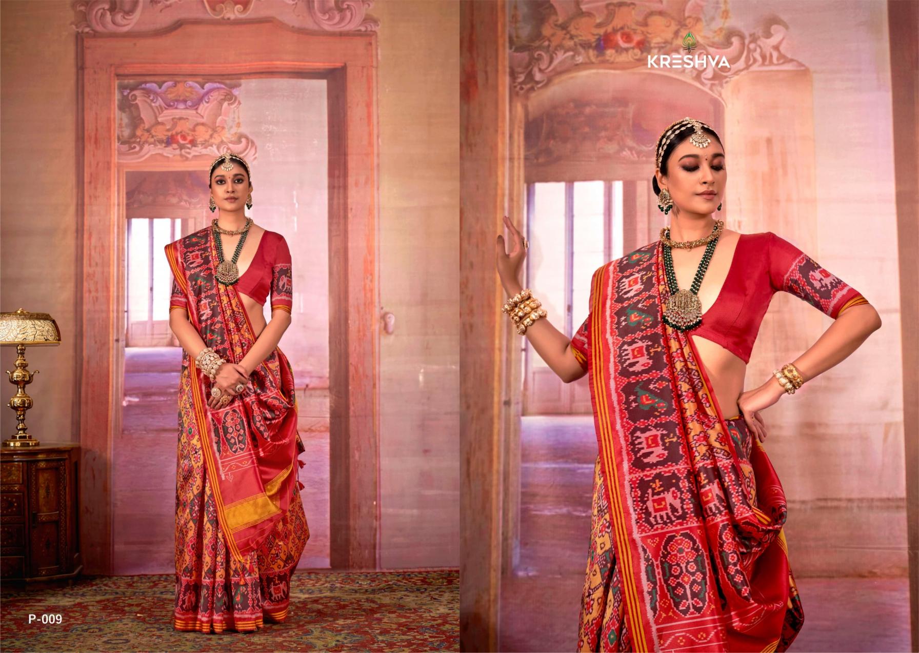 Presenting a celebration of heritage and luxury — a collection where timeless craftsmanship meets regal beauty. Each Patola saree is woven with intricate artistry, rich colours, and a story of tradition. Discover elegance redefined, crafted for the women who carry culture with grace and style. Brand Name: Kreshva Catalog Name: Patola Royal Series: P-009 TO P-012 Price: 995/- +5%Gst Saree Fabric : Superior Twill P.V.Silk With Weaving Border And Pallu With Excellent Patan Patola Print Tradition Of Gujrat With Super Soft Finish With Hand Tassles Blouse : P.V. Silk Occasion: Party Wear, Festival Wear |