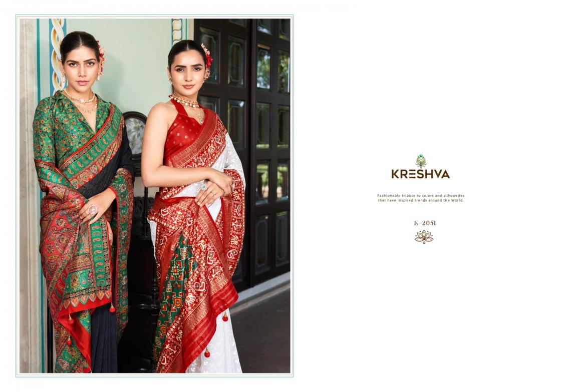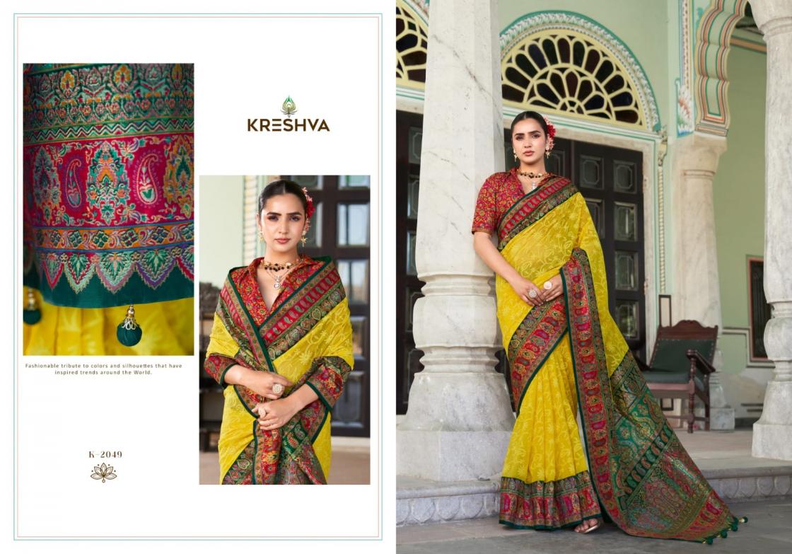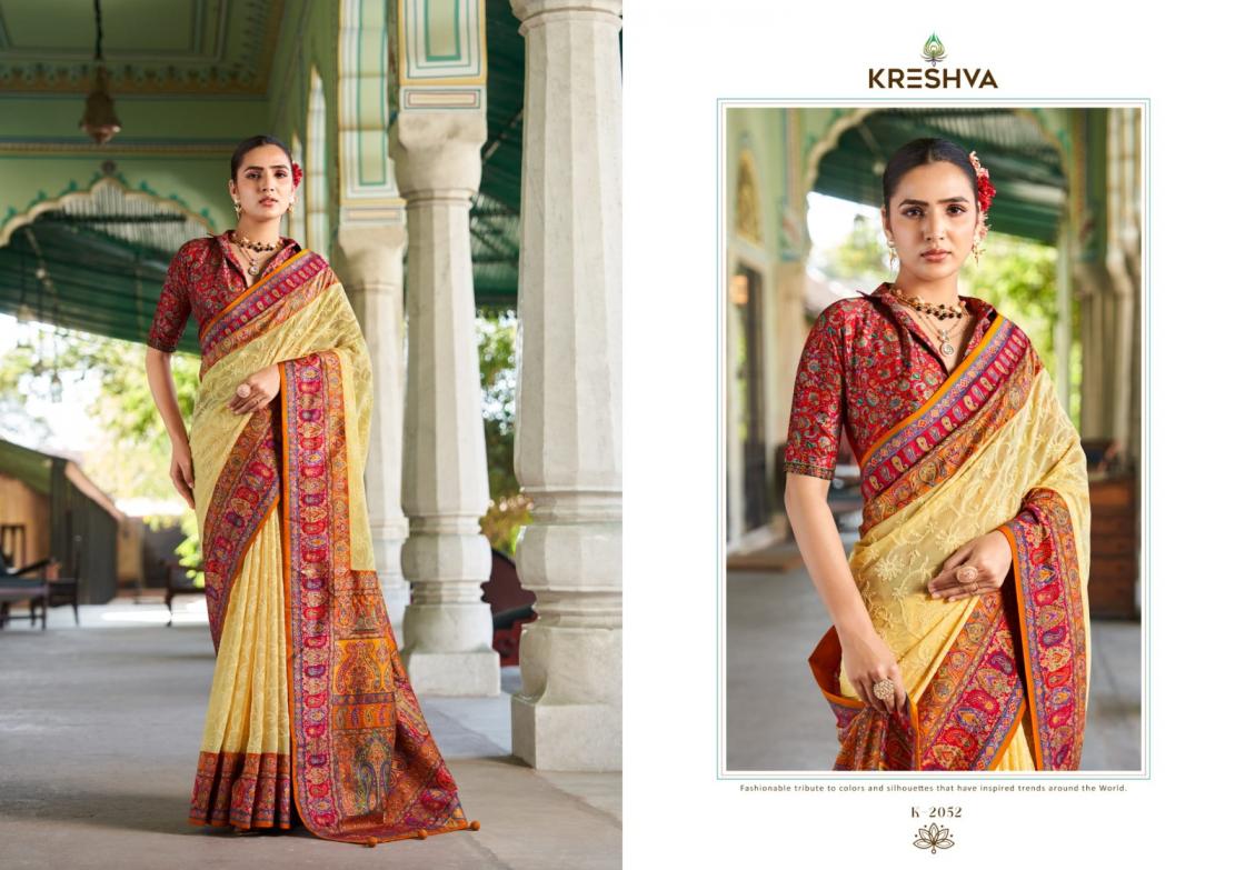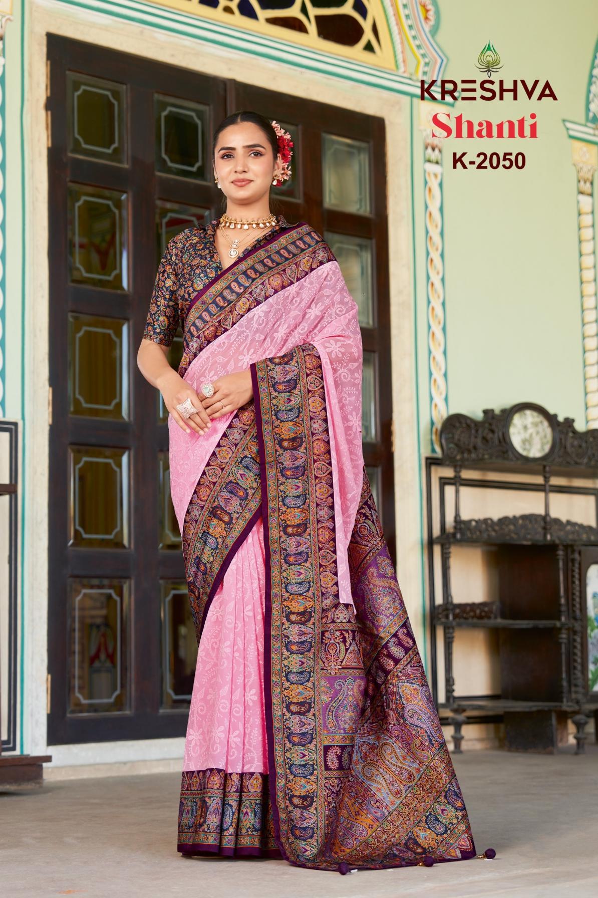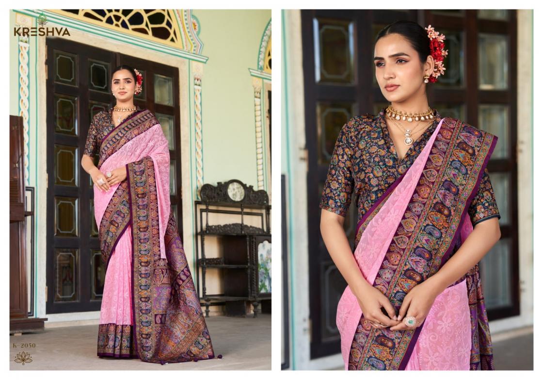 Brand : Kreshva Catalog : Shanti Series : 2047 To 2052 Saree : Lux P.V. Georgette Luknowi With Pashmina Foil Print Blouse : Pashmina Foil Print Price : 1695/- +5%GST Occasion : Party Wear ,Festival Wear,Uniform Wear |