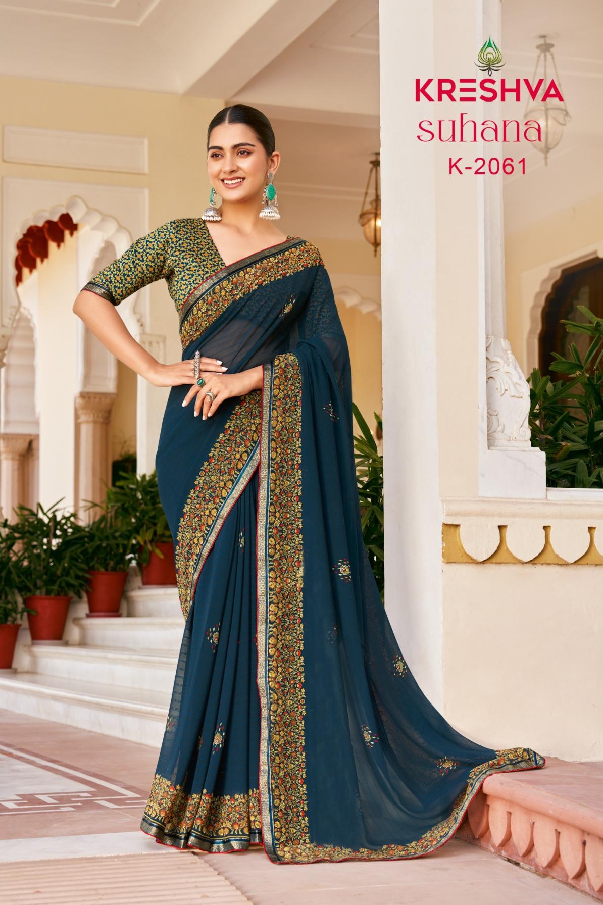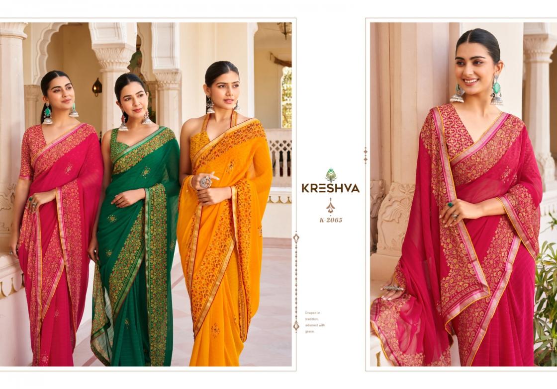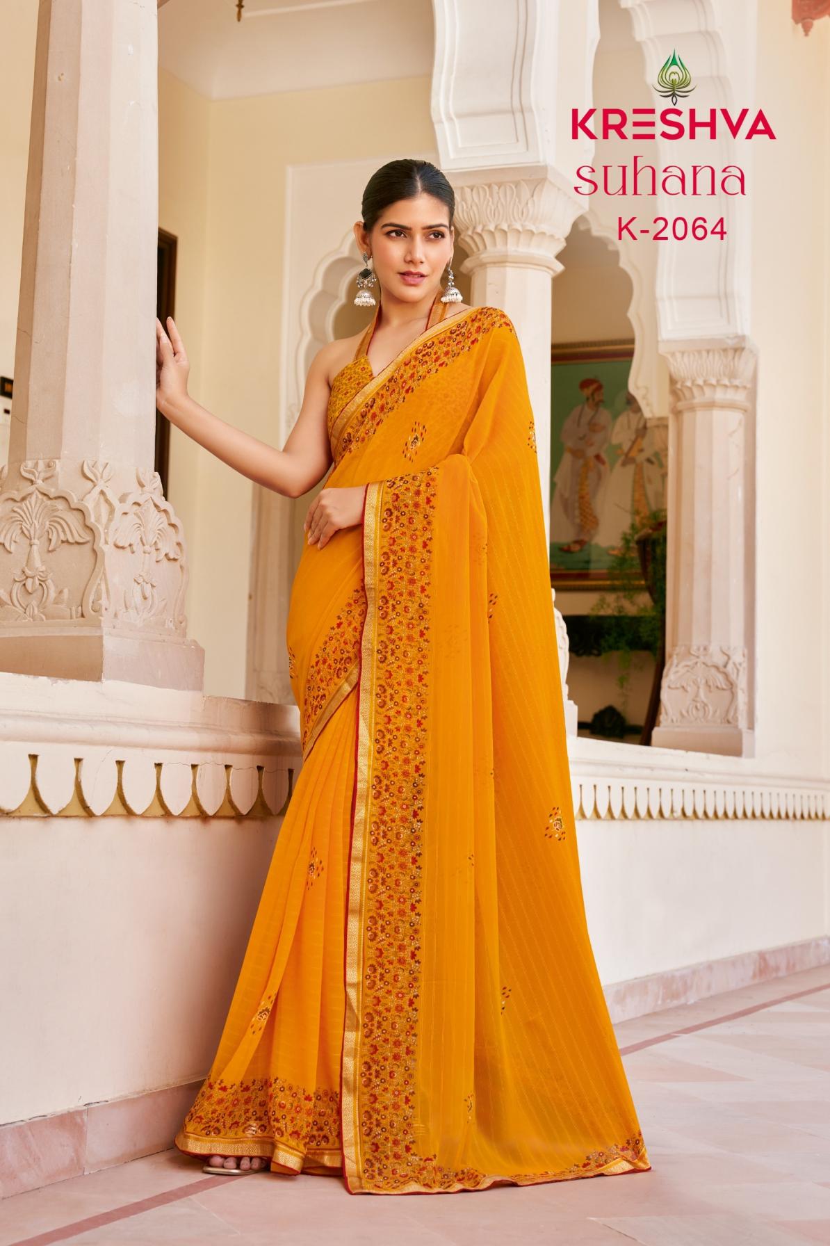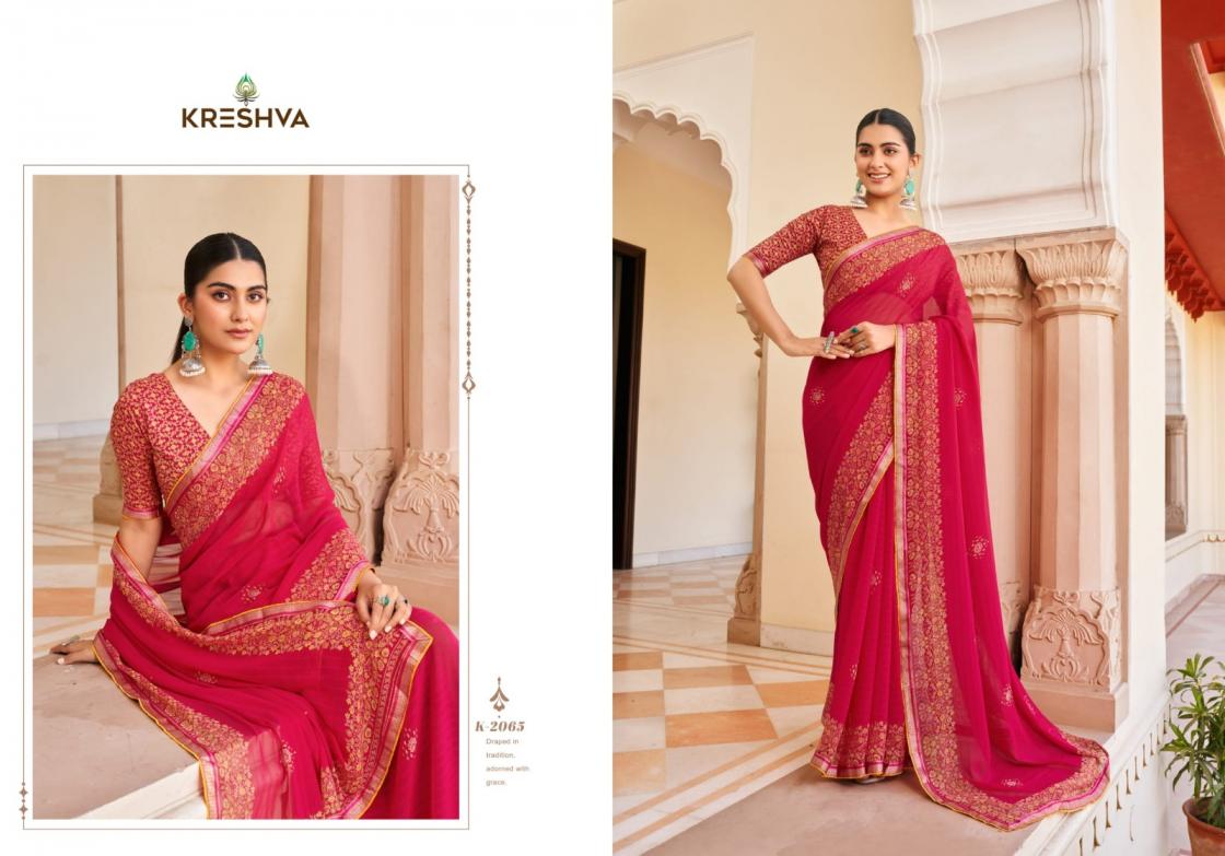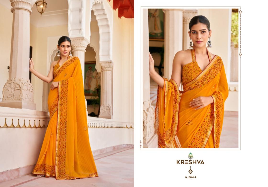 Brand : Kreshva Catalog: Suhana Series : 2061 to 2068 Saree : Dani Georgette Printed Saree Blouse : Dani Georgette Price : 695/- +5%GST Occasion : Party Wear ,Festival Wear |