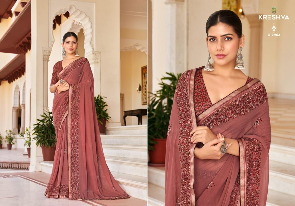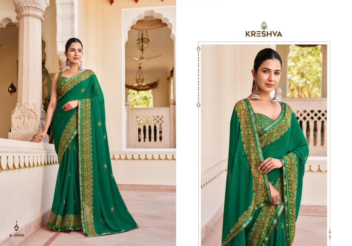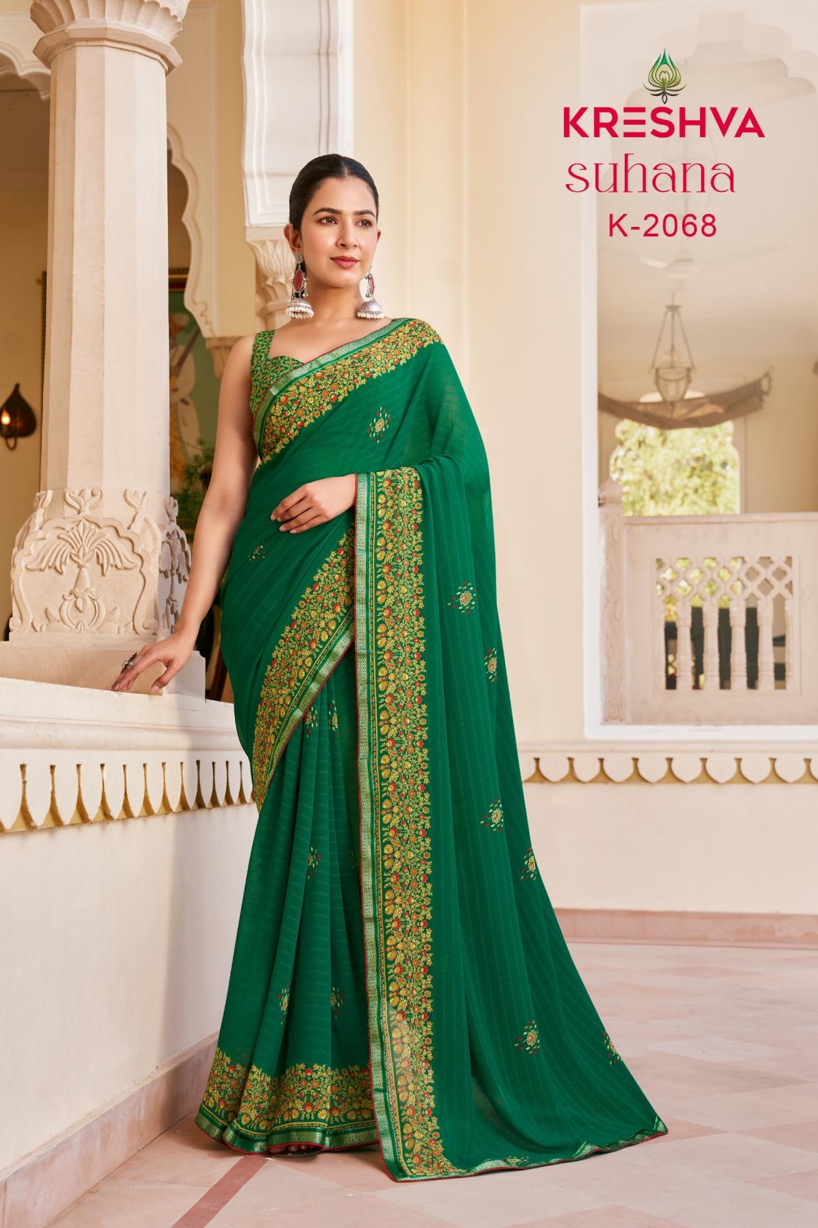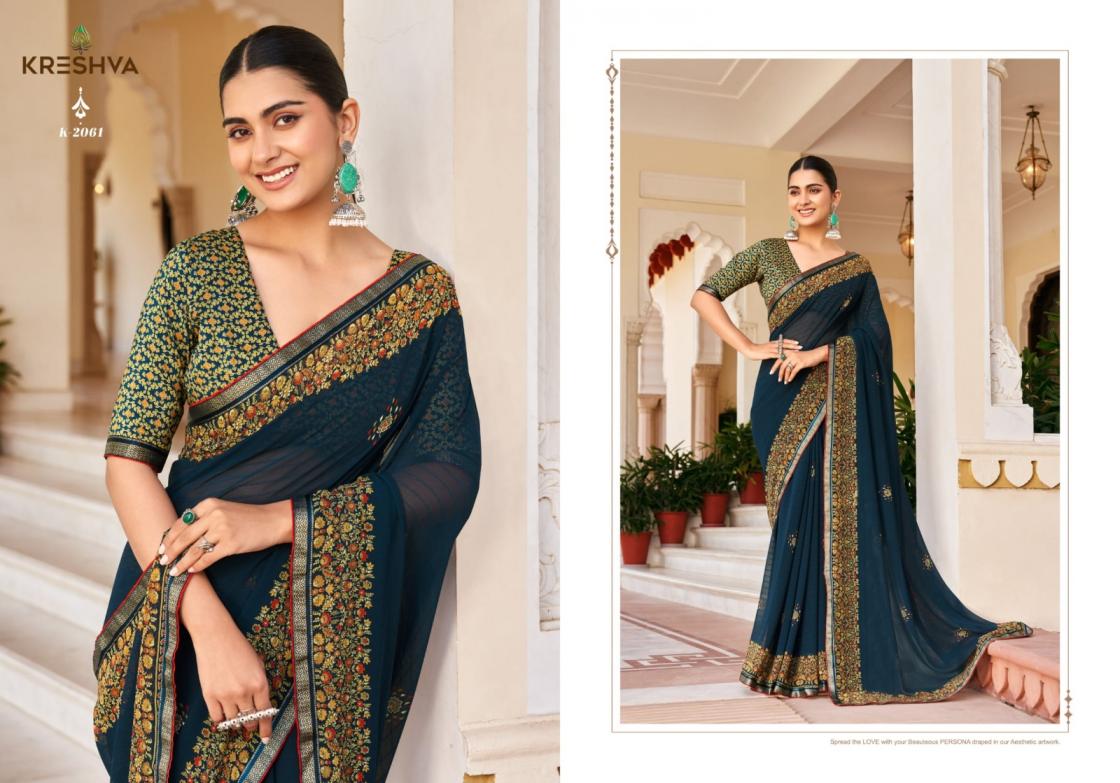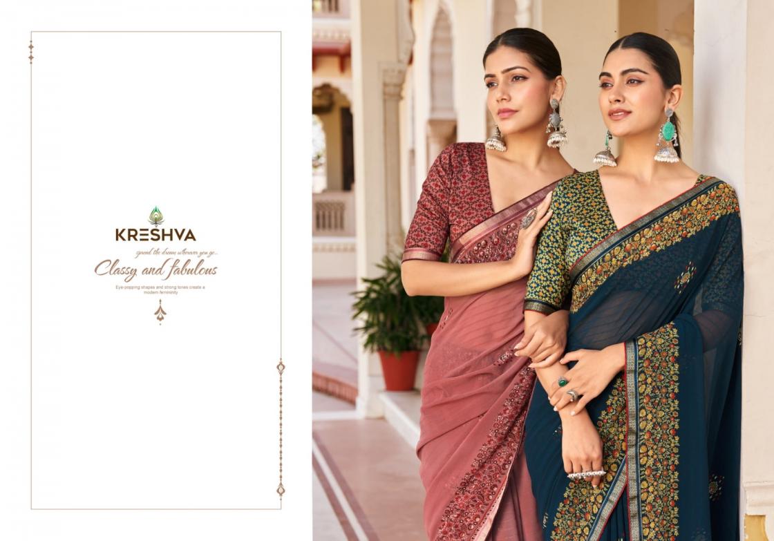 Brand : Kreshva Catalog: Suhana Series : 2061 to 2068 Saree : Dani Georgette Printed Saree Blouse : Dani Georgette Price : 695/- +5%GST Occasion : Party Wear ,Festival Wear |