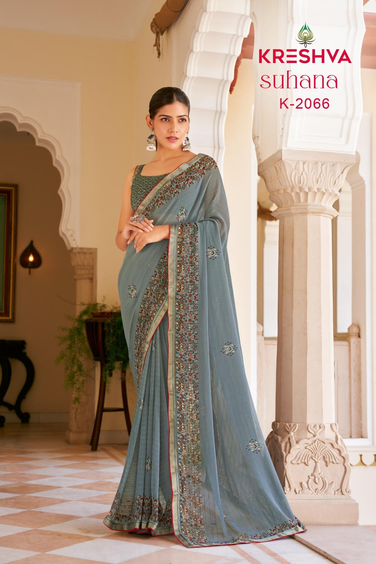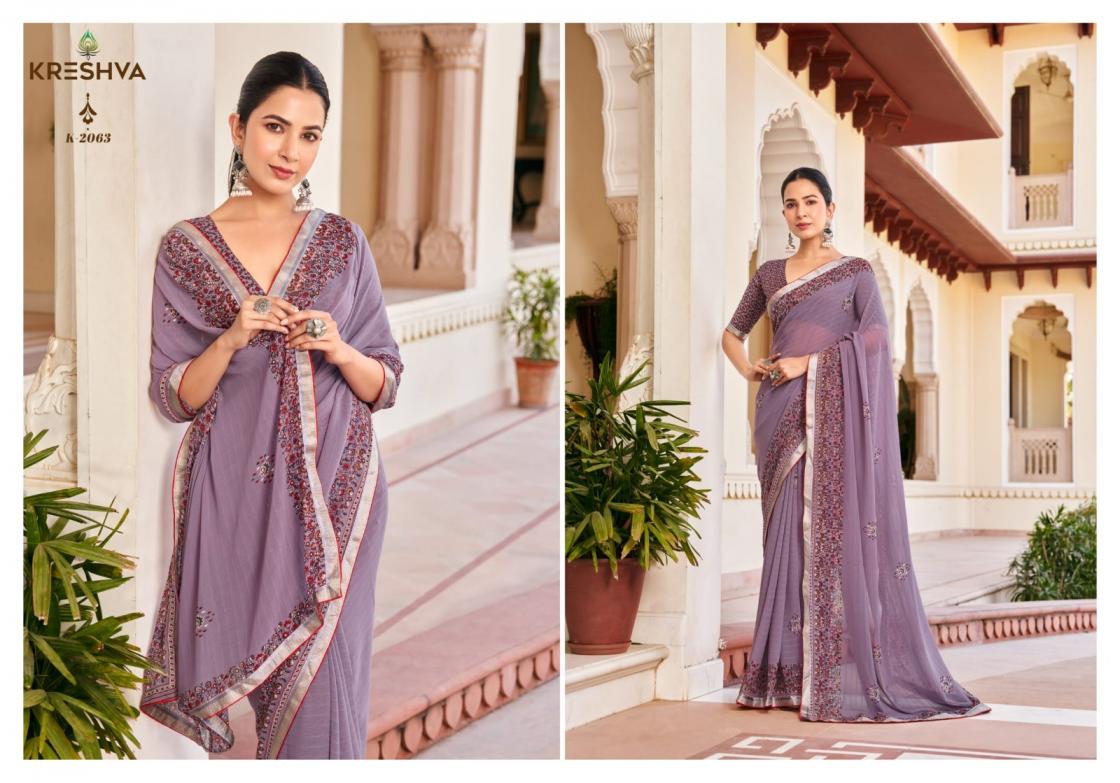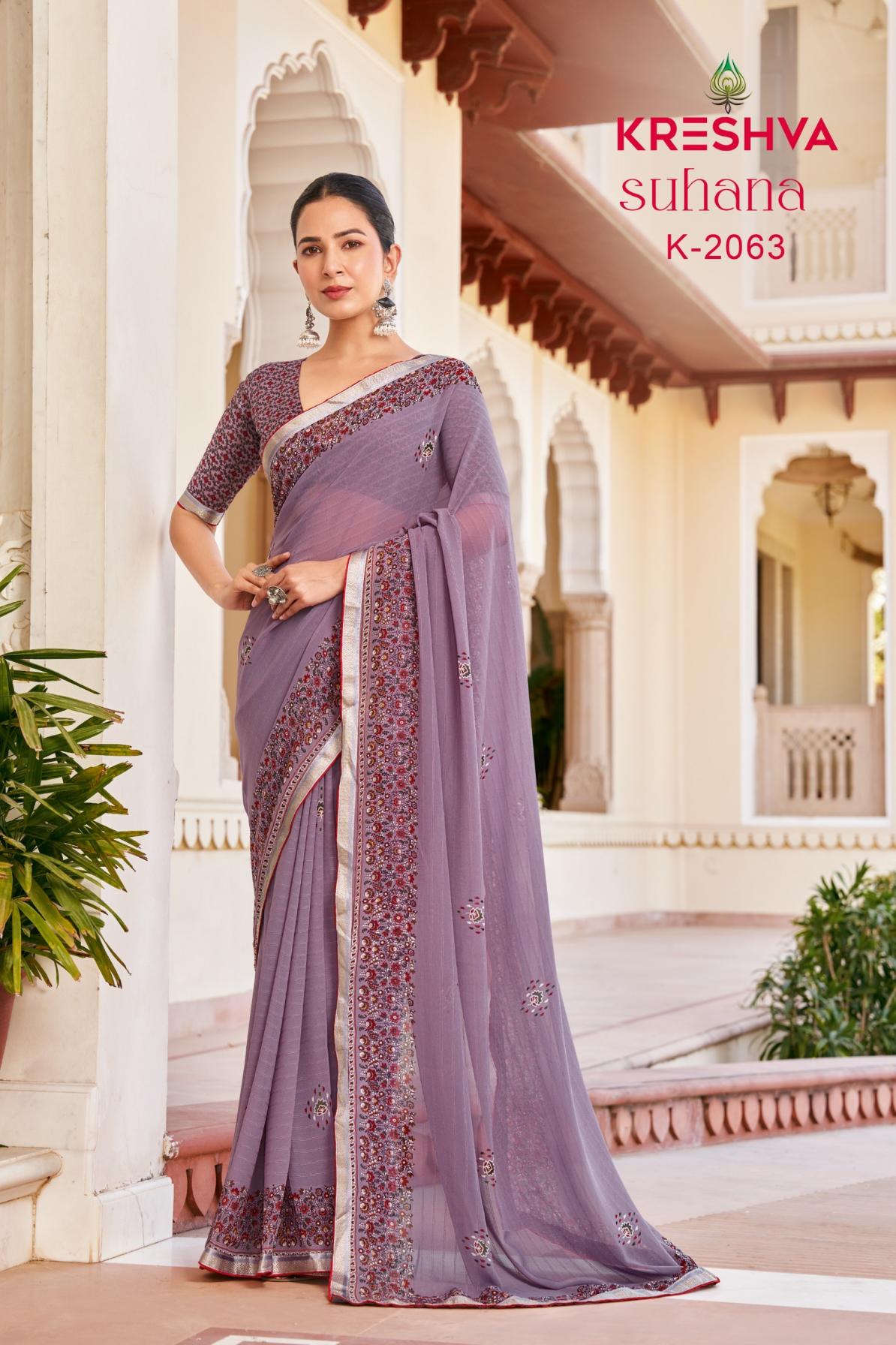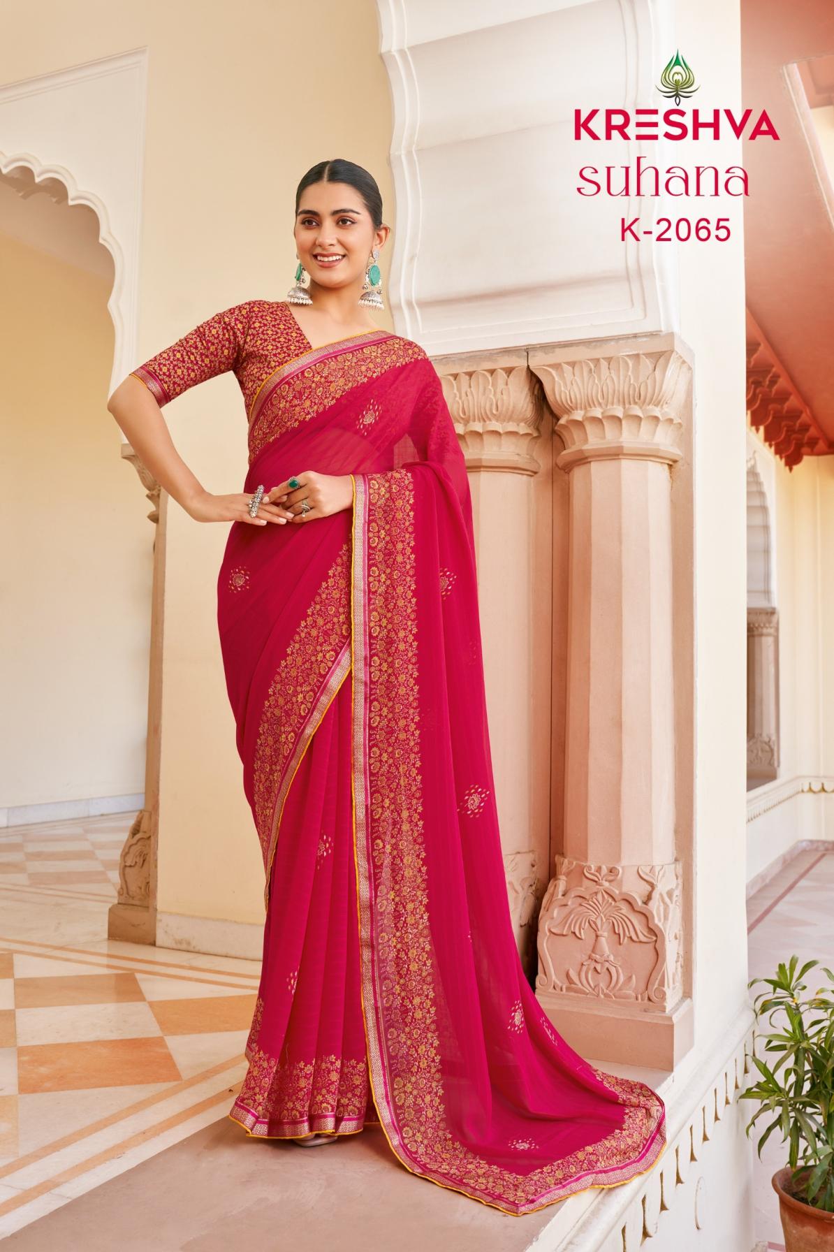 Brand : Kreshva Catalog: Suhana Series : 2061 to 2068 Saree : Dani Georgette Printed Saree Blouse : Dani Georgette Price : 695/- +5%GST Occasion : Party Wear ,Festival Wear |
