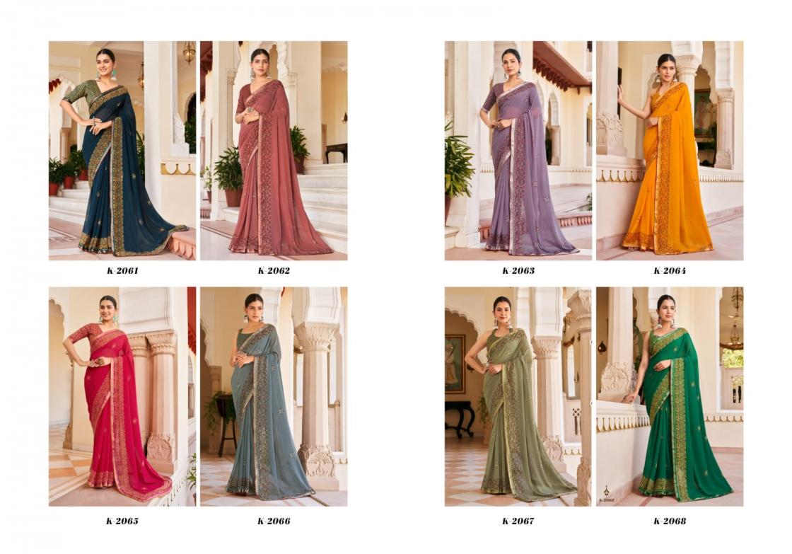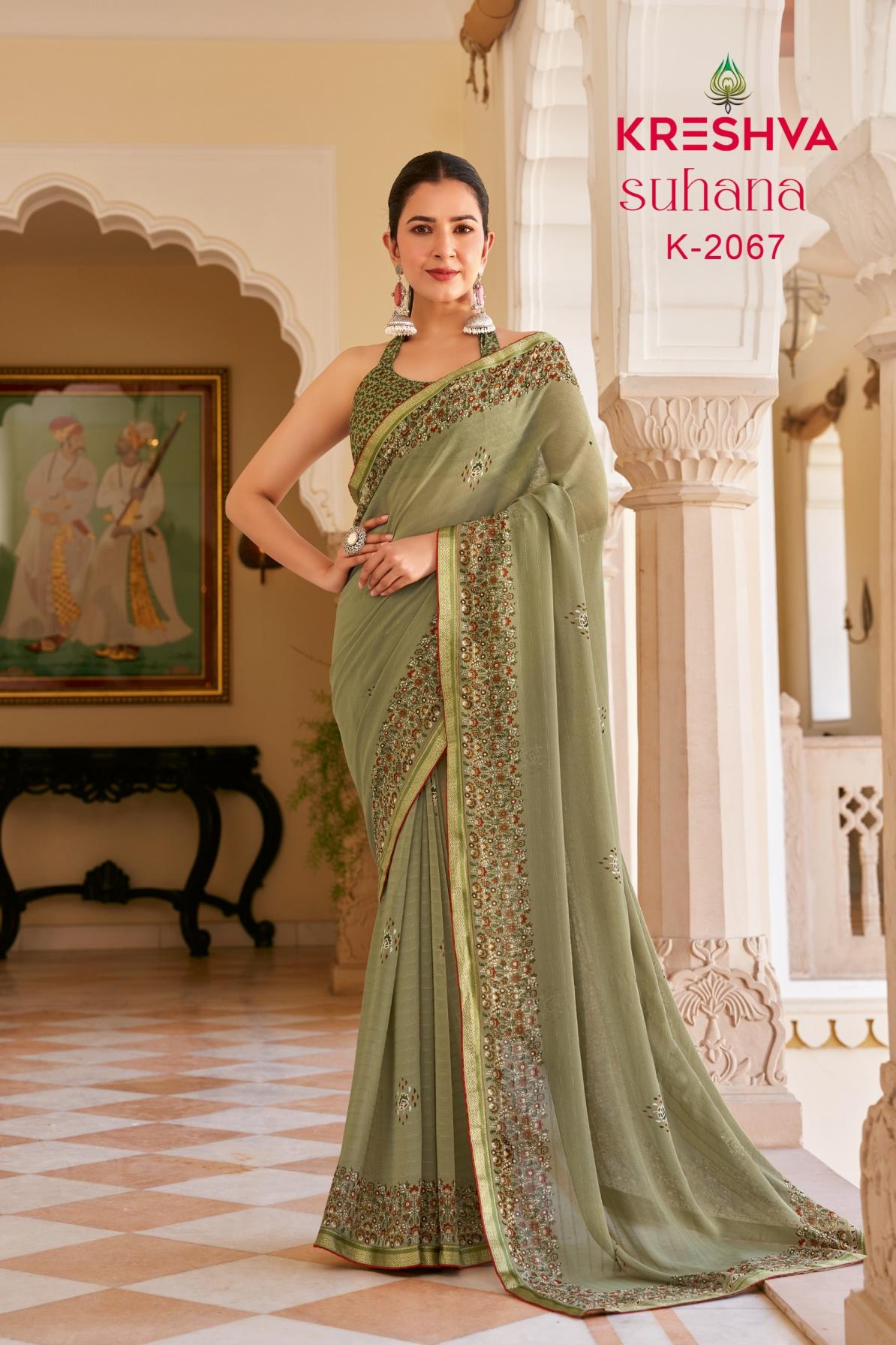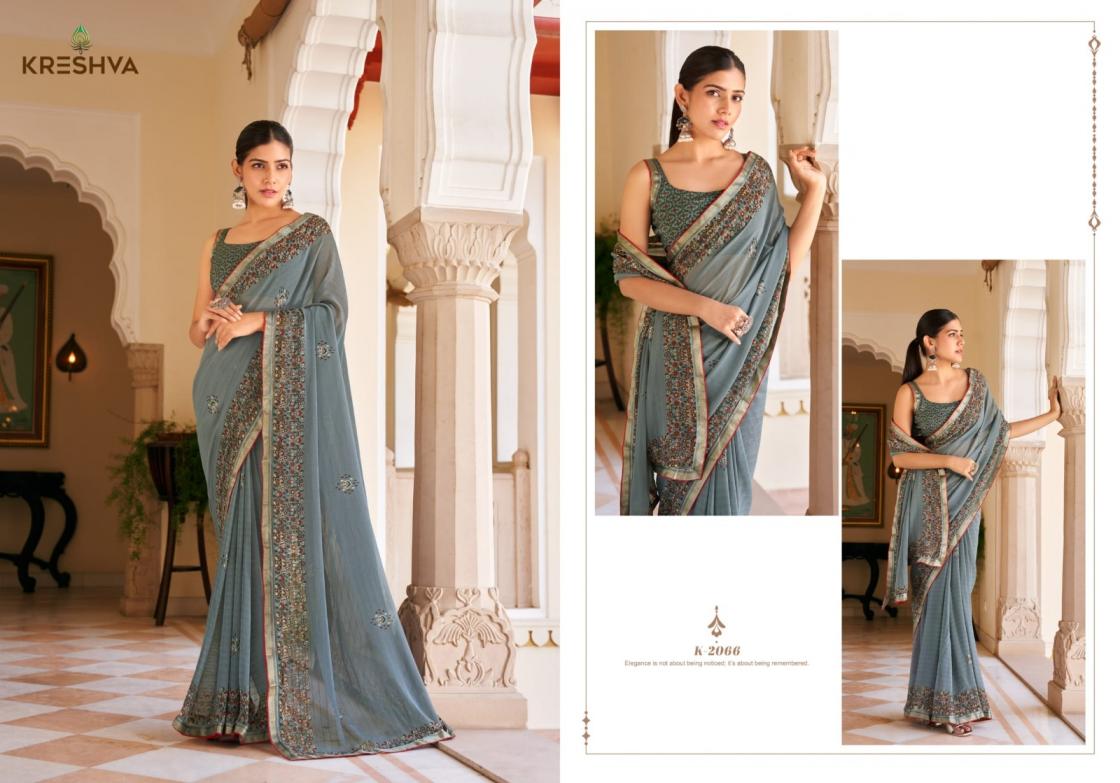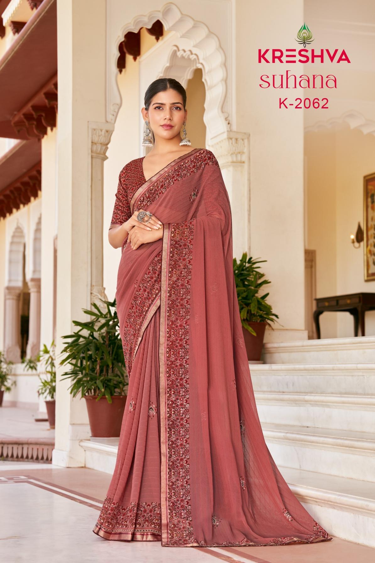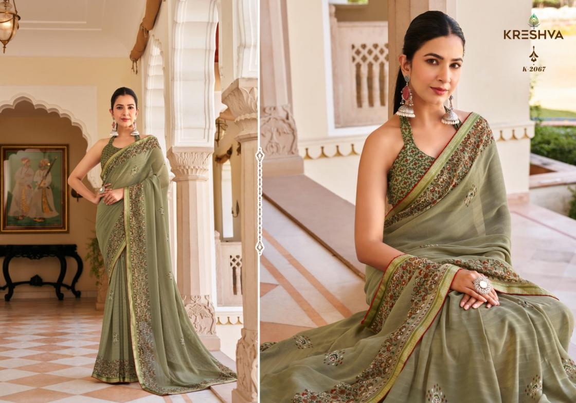 Brand : Kreshva Catalog: Suhana Series : 2061 to 2068 Saree : Dani Georgette Printed Saree Blouse : Dani Georgette Price : 695/- +5%GST Occasion : Party Wear ,Festival Wear |