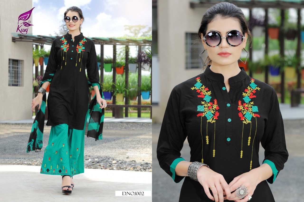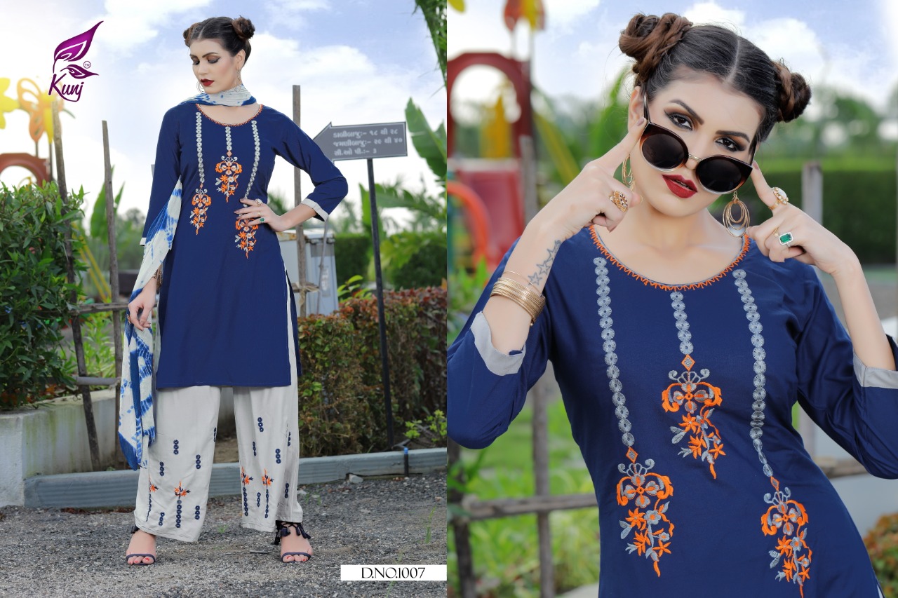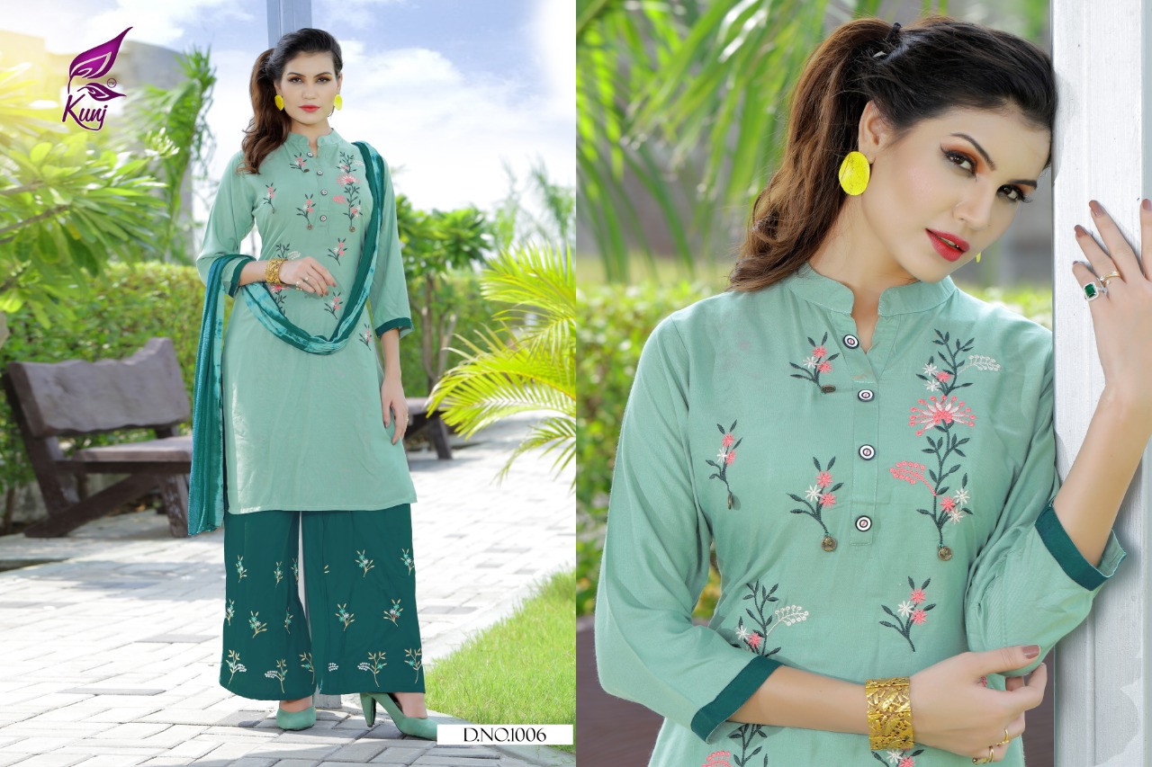 Dear Customers, Welcome to Kunj (KURTI) We are introducing Kunj new catalog Catalogue name:- POSE VOL.1 CLOTH TOP:- RAYON 14KG with Embroidery PLAZO:- Rayon 14kg with Embroidery DUPATTA:- NAZNIN SIBURI PRINT ✅Concept :-Three PCS Size:- M,L XL XXL XXXL AVAILABLE 10 DESIGNS CATALOGUE Rate 725  :-Booking Open Happy selling... |
