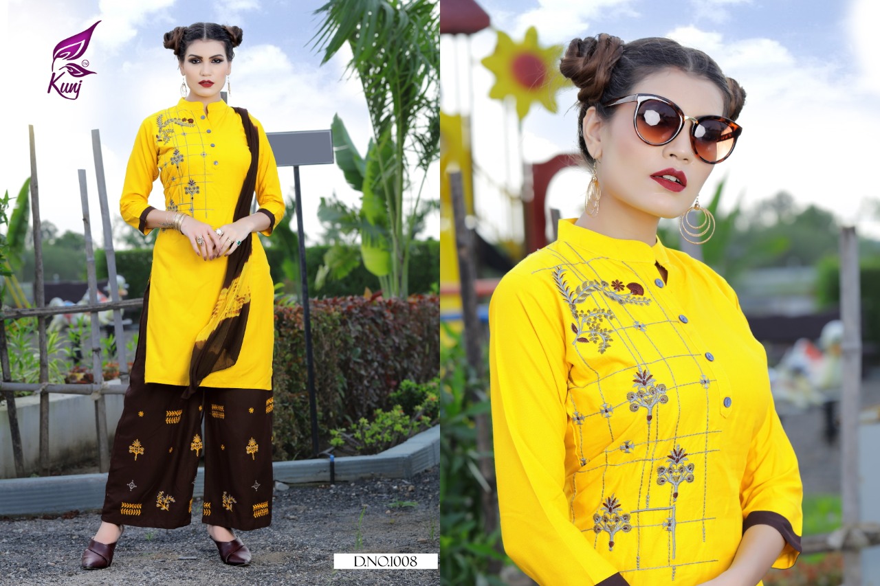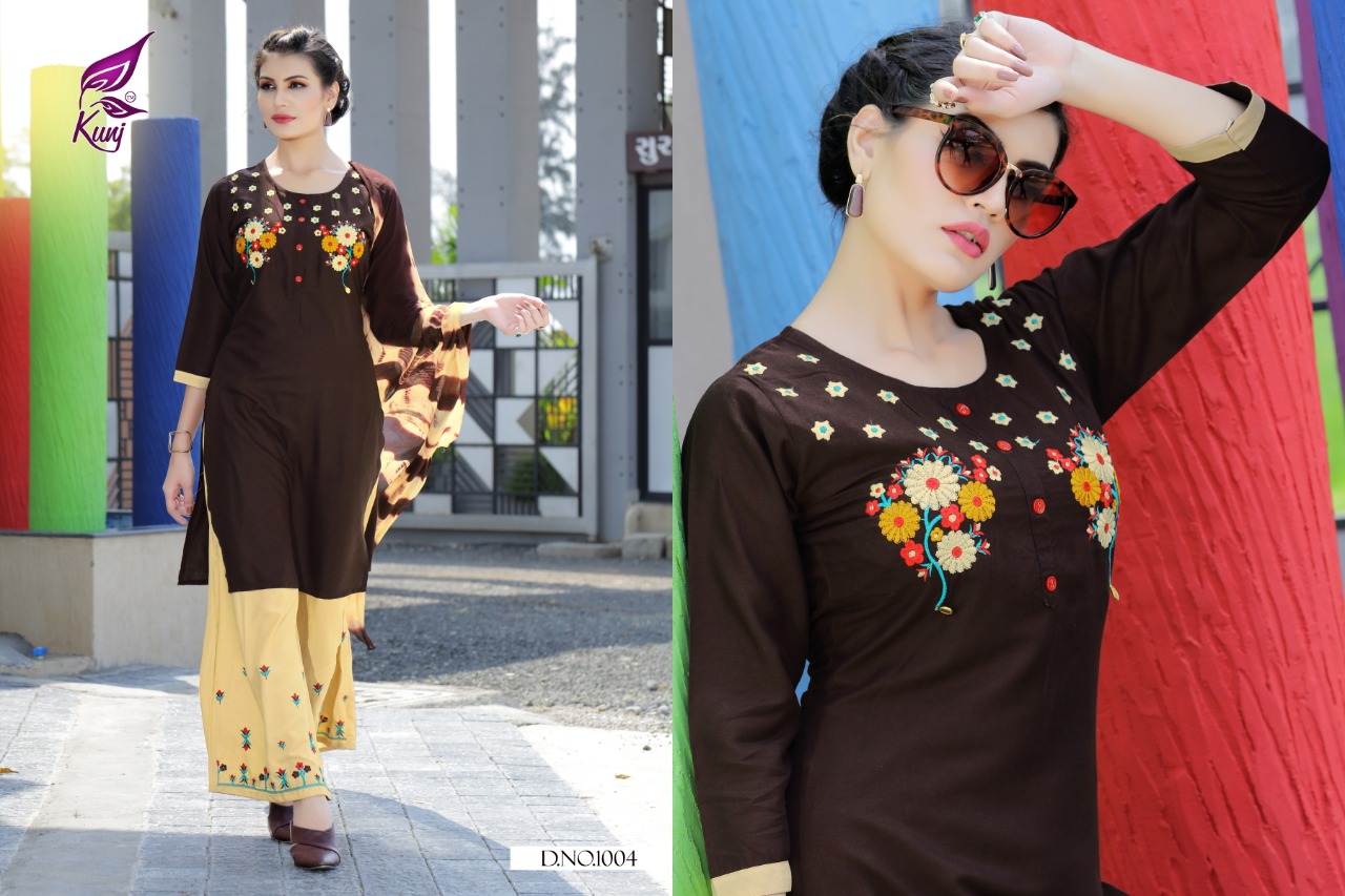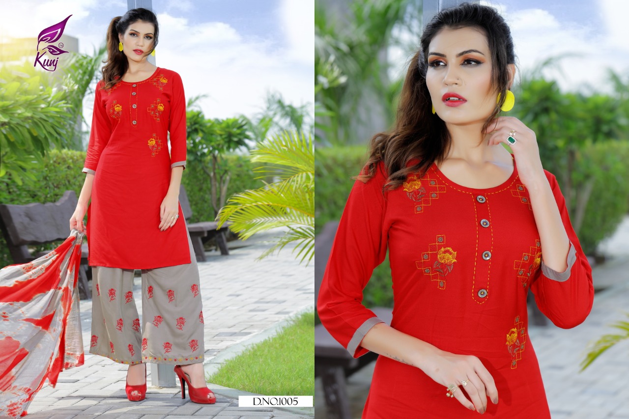 Dear Customers, Welcome to Kunj (KURTI) We are introducing Kunj new catalog Catalogue name:- POSE VOL.1 CLOTH TOP:- RAYON 14KG with Embroidery PLAZO:- Rayon 14kg with Embroidery DUPATTA:- NAZNIN SIBURI PRINT ✅Concept :-Three PCS Size:- M,L XL XXL XXXL AVAILABLE 10 DESIGNS CATALOGUE Rate 725  :-Booking Open Happy selling... |