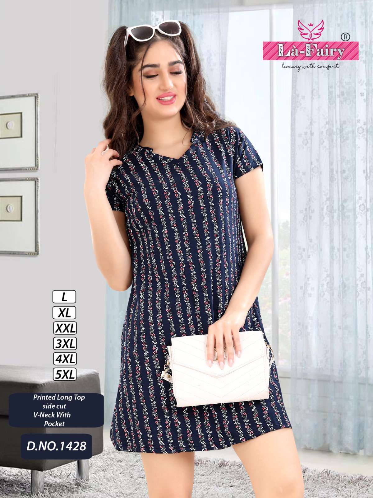la fairy 1428 comfortable printed long tops side cut with v neck and pocket