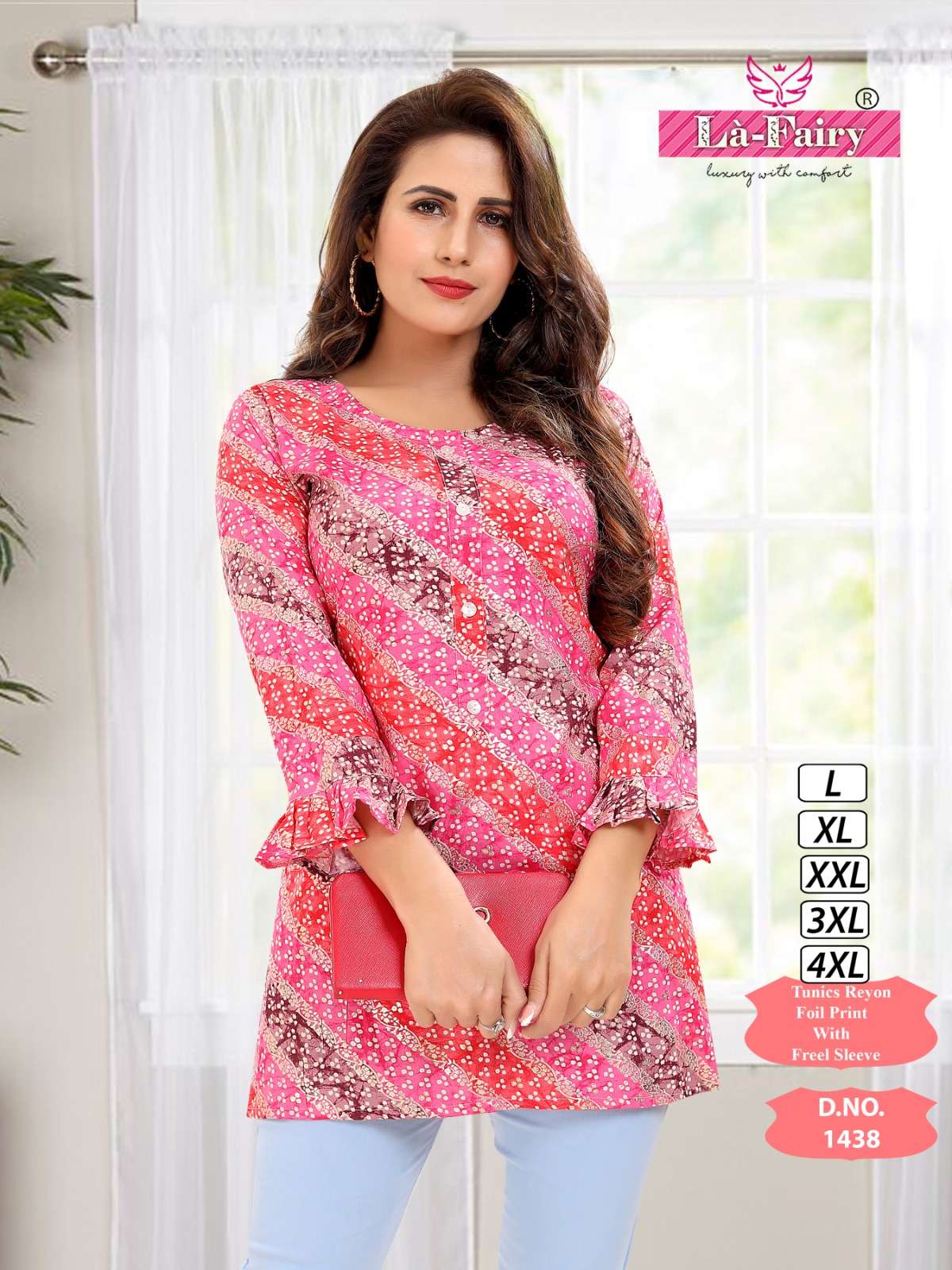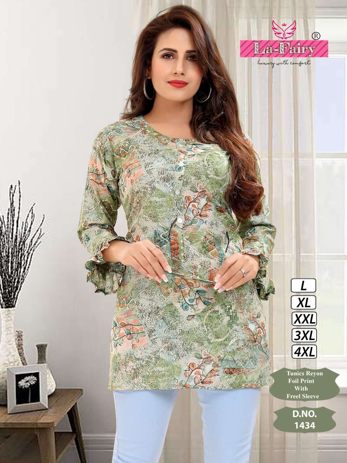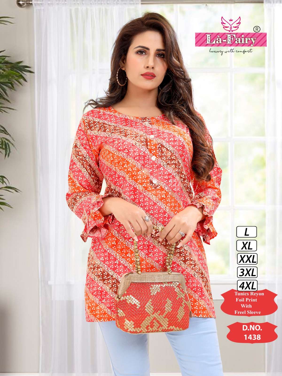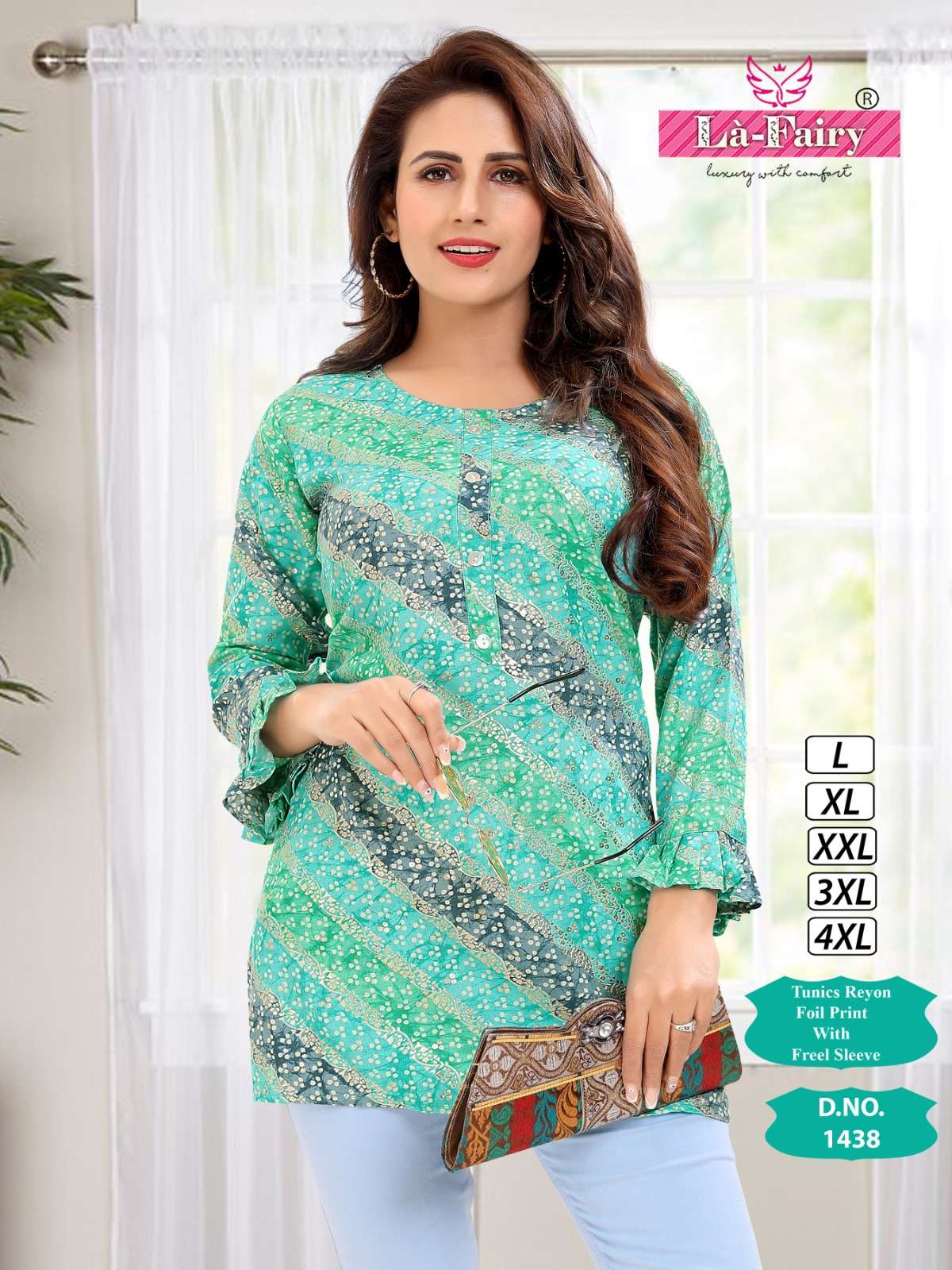 la fairy 1434-1438 fancy rayon foil print readymade tunics with frill sleeves combo set