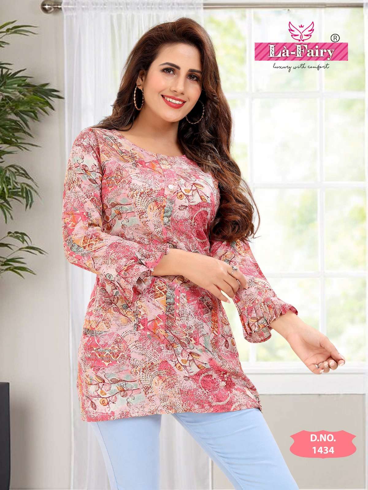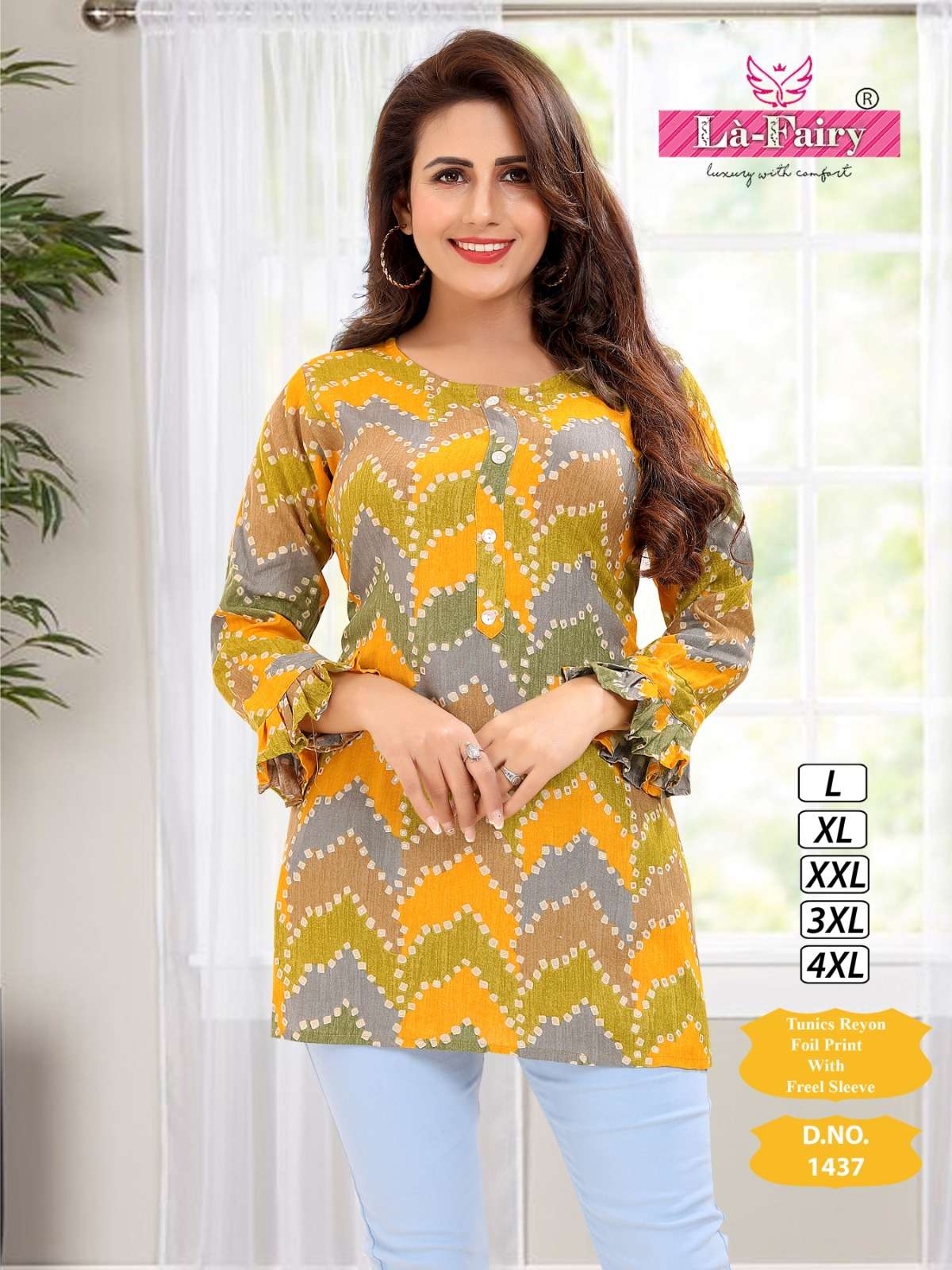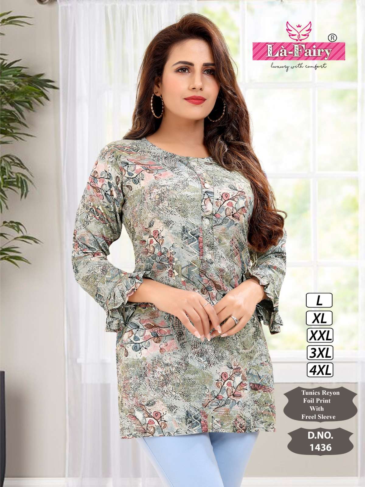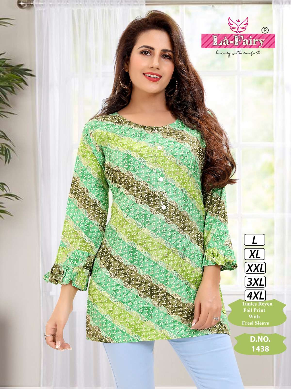 la fairy 1434-1438 fancy rayon foil print readymade tunics with frill sleeves combo set