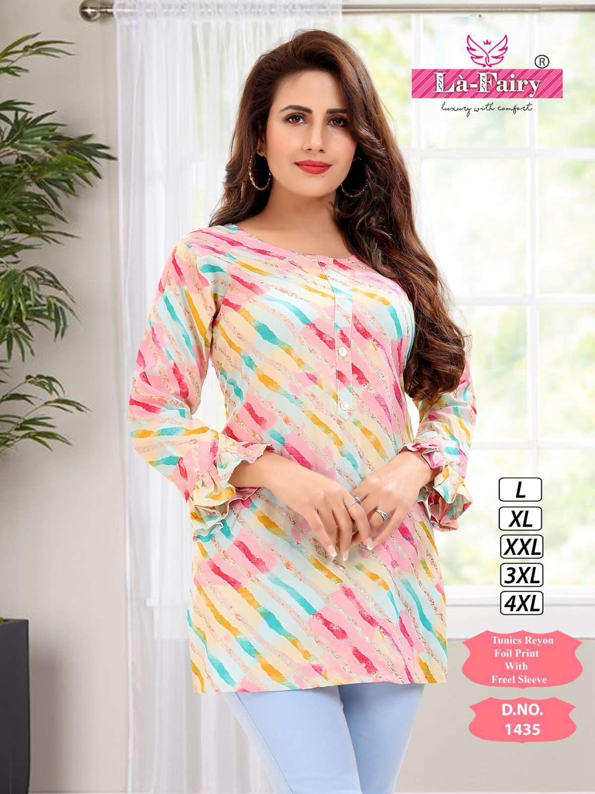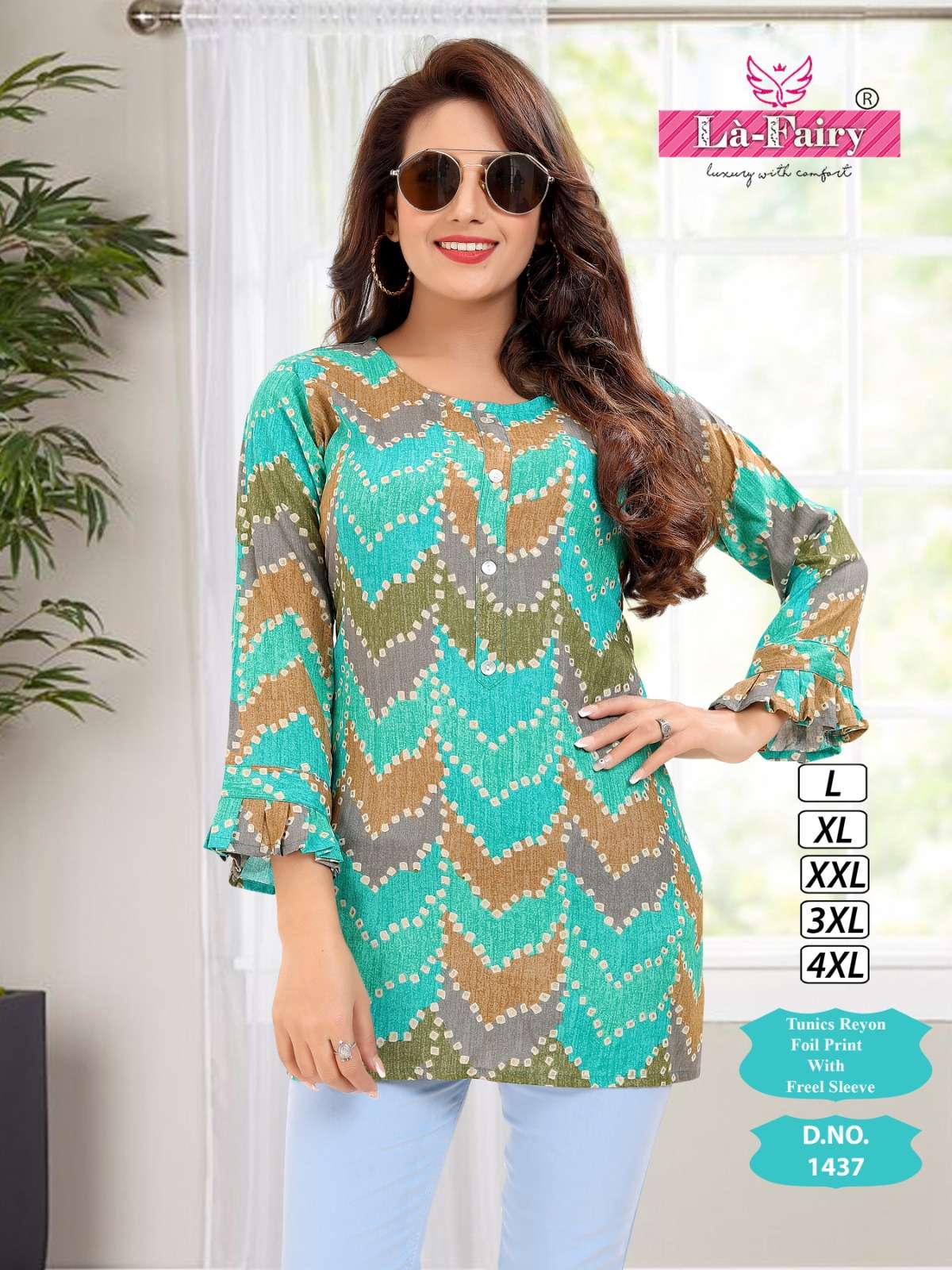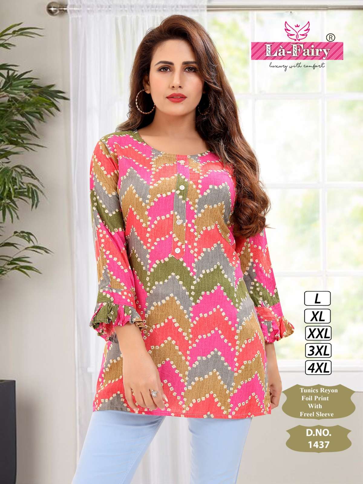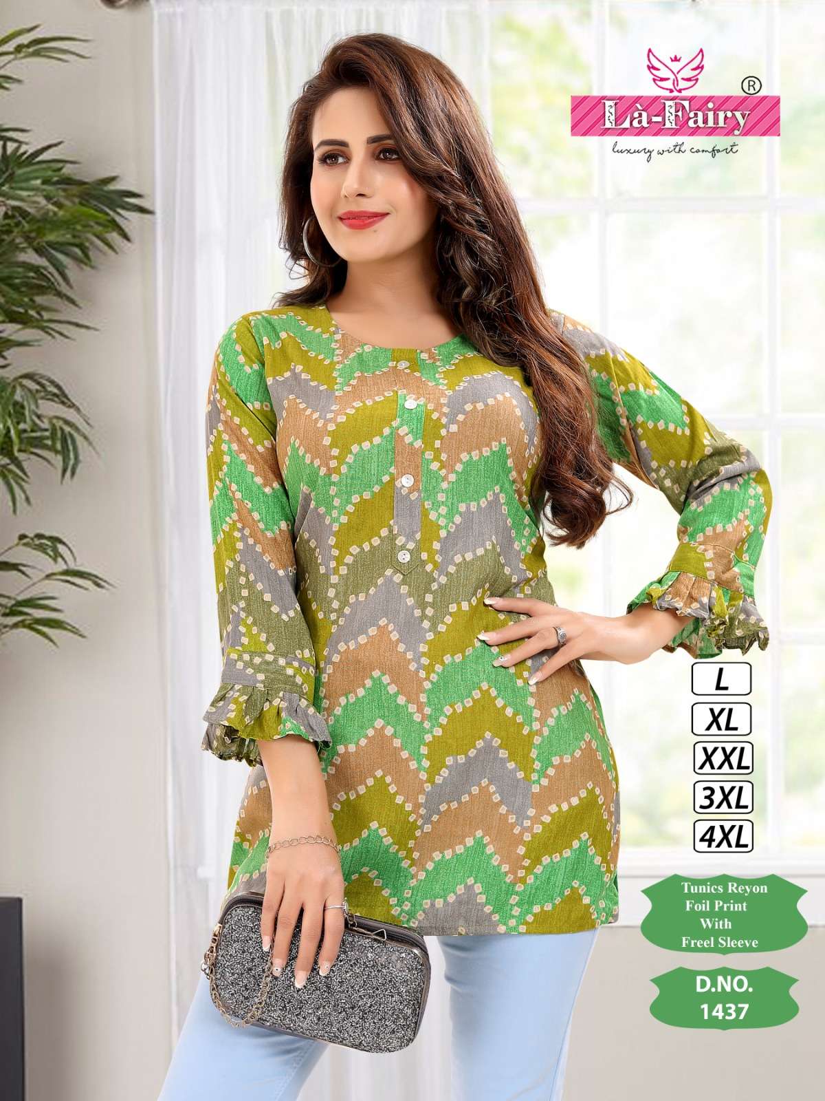 la fairy 1434-1438 fancy rayon foil print readymade tunics with frill sleeves combo set
