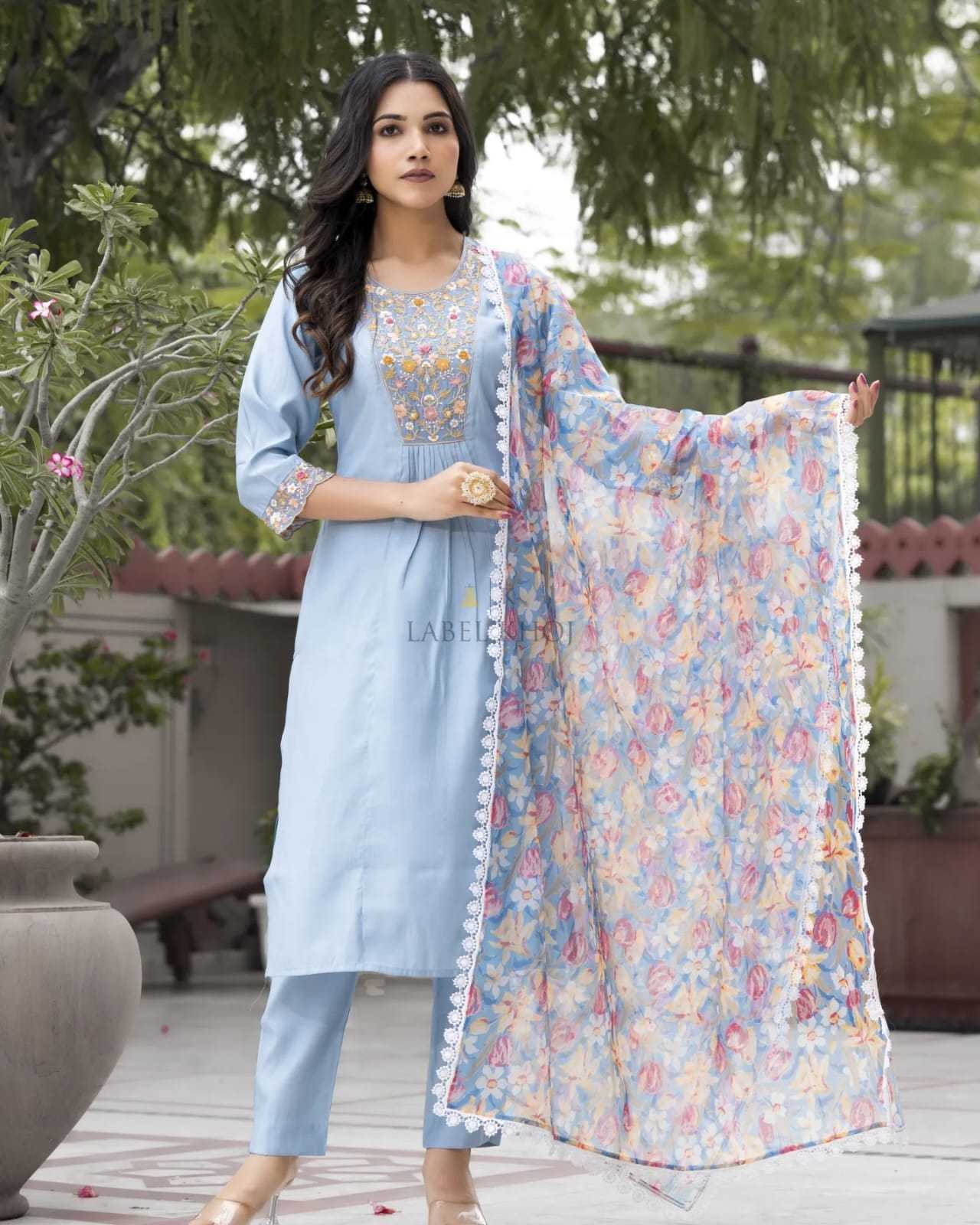 label khoj 9612 amazing fancy silk kurti pant and organza print dupatta combo set
