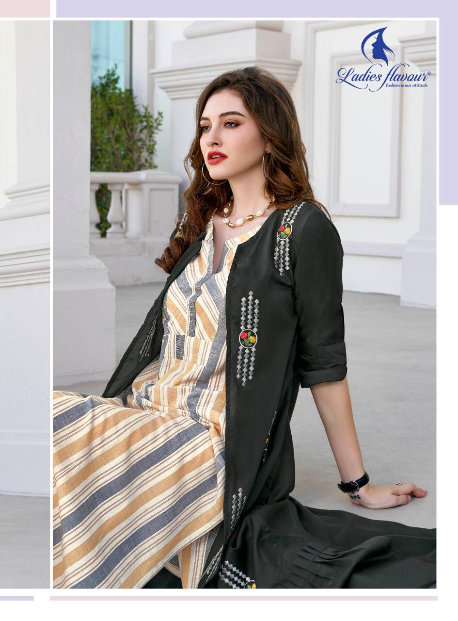 Enjoy the Monsoon & Fall in love with Festival “Raksha bandhan & Janamastami” With “Ladies Flavour”. Brand Name : Ladies Flavour Catalog : Life Style Vol-4 Design : 6 Fabric : South Cotton Stripes & Rayon Stripes & Mull cotton & Musline With embroidery work Size : M (38),L(40),XL(42), 2XL(44),3XL(46) Rate :- 795/- Set to set Dispatch :- Within 2 days Note :- shrug seprate |